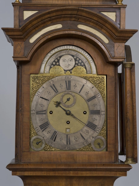 The floor clock (forming a pair with the clock case inventory number Wil.894, mechanism Wil.3050) is housed in a three-part high cabinet typical of English longcase clocks of the early 18th century.