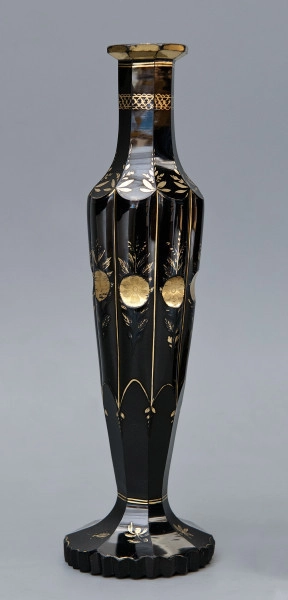 The black non-transparent glass of which the vase is made was invented in the 19th century by Georg Franz August Longueval, count of Buquoy (1781–1851). He was a mathematician, a physicist, a chemist, a philosopher as well as an owner of several glass factories. It received the name of hyalith, inspired by the Greek word for “glass” (“hyalos”), from the very inventor of this technical novelty. Its production started in 1817. Owing to the unique hue, products made of hyalith, such as cups, vials, vases, tea containers or candle-holders, quickly became fashionable and widely in-demand. The popularity of hyalith, however, lasted for a relatively short period, i.e. until the 1840s, giving place to other types of glassware (mainly mass tinted glass of various colours), though hyalith vessels could still be found in the market.