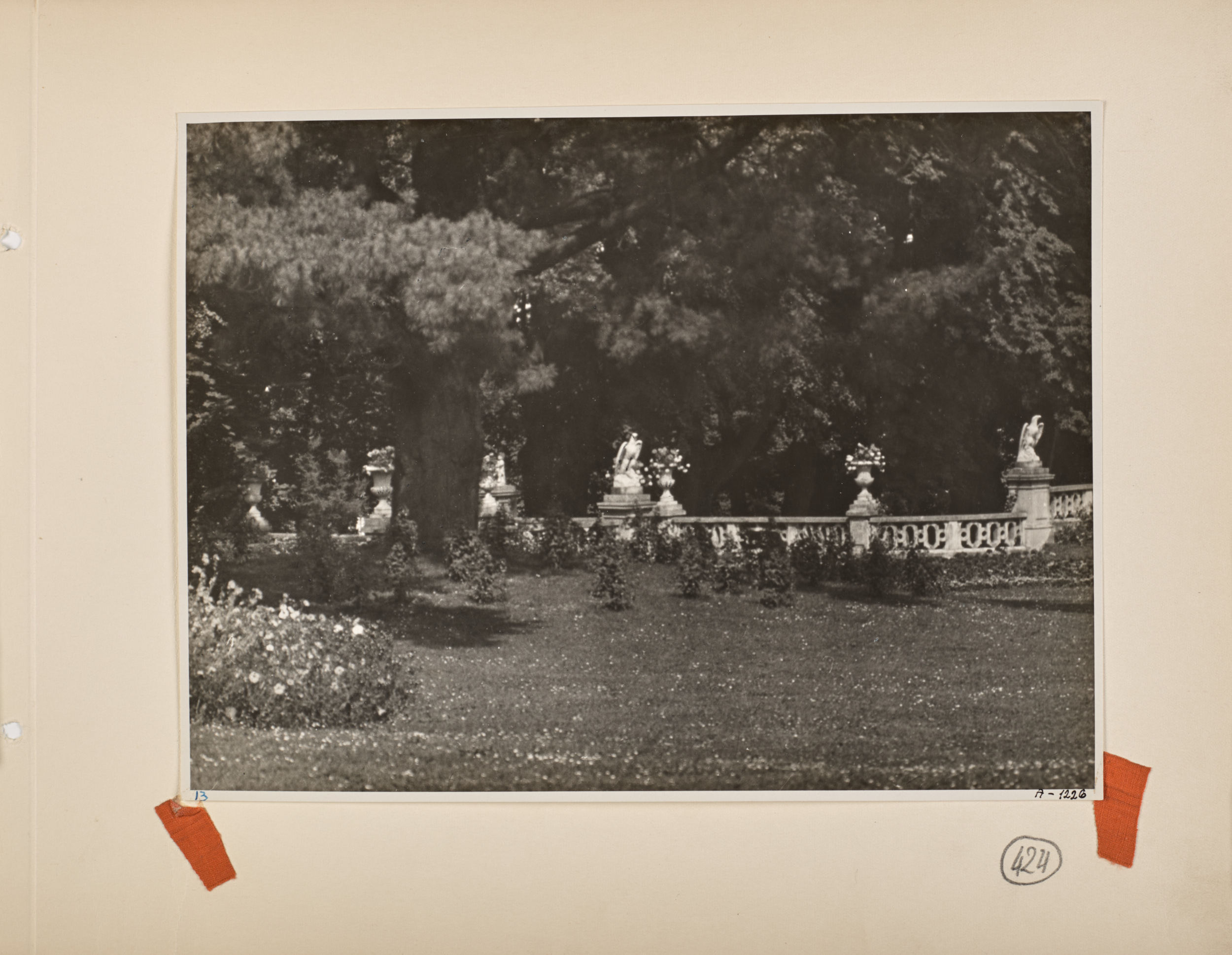 Main bridge. The photograph depicts a fragment of the inner park at Łańcut from the south-western side, with a fragment of the glass field with the blossoms and bushes planted, and with a portion of the main bridge. During the upgrade works at Łańcut conducted by the third ordinary, Roman Potocki, and his wife, Elżbieta nee Radziwiłł, it was erected in place of the former by the first ordinary; the new main bridge, of stone, with side guards shaped as putti and eagles as well as vases, in which between Spring and Autumn decorative plants were potted. This bridge survives until today. In the background we see the lime tree alley planted around the moat by princess Izabella Lubomirska (d. 1816) after the embankments, formerly in front of the moat, were removed. The earth embankments, with the walls and moat, constituted the Łańcut fortifications created in the 17th century. At the end of the 18th century, the system was useless, hence, inside the moat, directly at the castle, the first garden was established, with lime tree alleys planted where the embankments around the moat were removed. Aldona Cholewianka-Kruszyńska