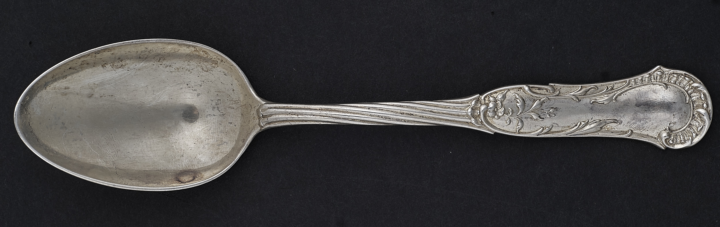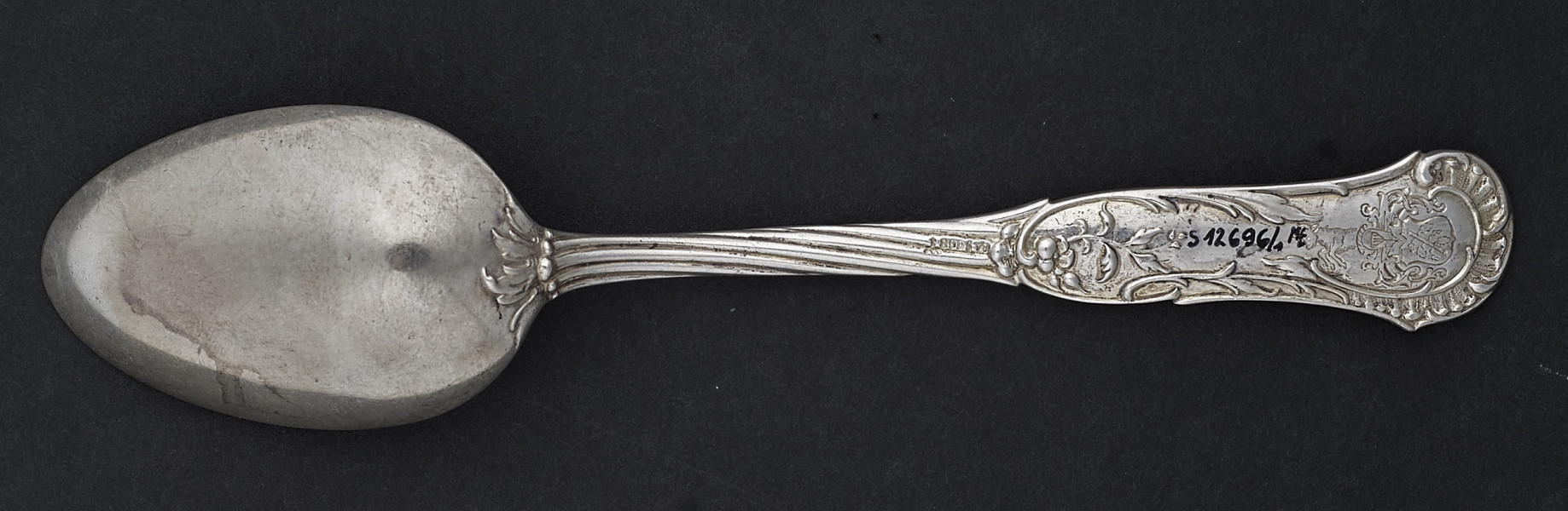 The cutlery is kept in a dedicated oak case with a bottom lined with a soft textile. The case cover is lined with soft satin with the gold logo of the maker (J. Ludwig Juwelier) in the centre. The obverse of the cutlery handle is decorated with an eclectic motif. The reverse features the coat of arms, i.e. an oak twig with leaves and acorns. The same crest can be seen on the case cover. The handle of each cutlery piece is stamped with a punch and a silver quality symbol of 800. This means an alloy with 80 per cent silver content with 20 per cent of other metals. Products from this quality silver were manufactured in the Prussian and Austrian partitions. In the Prussian partition, a regulation dating back to 1888 required that only products with the quality of 800 and above should be marked. In the Austrian partition, after 1866, a system of single-digit markings was introduced where 1 meant the quality of 950, 2 meant 900, 3 meant 800 and 4 meant 750.