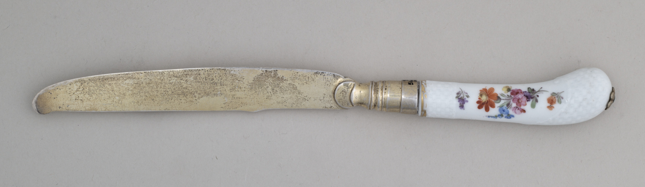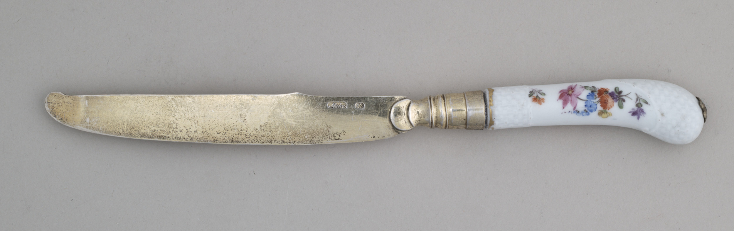 Breakfast knife with a flat blade, rounded at the end. The cutting edge is slightly convex. On the other side, the blade is fitted with a ferrule and connected to a porcelain handle The handle, curved in the shape of a stylised "S," is made of white porcelain and features three-dimensional artistic decoration at both ends in the form of a chequered pattern. It is hand-painted on both sides with multicoloured flowers. On the obverse, there is a yellow-orange tulip, forget-me-nots, burgundy wild roses, and marsh marigolds. On the reverse, there are burgundy roses, forget-me-nots, and yellow-orange marigolds. Two marks are stamped on the blade: the "Malcz" manufacturer's mark and a "12" silver fineness mark.