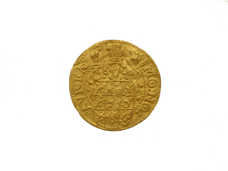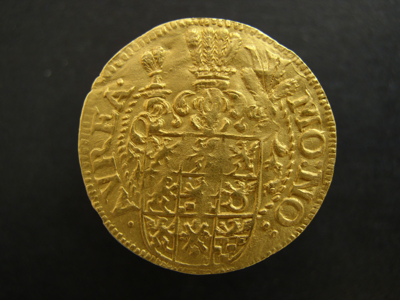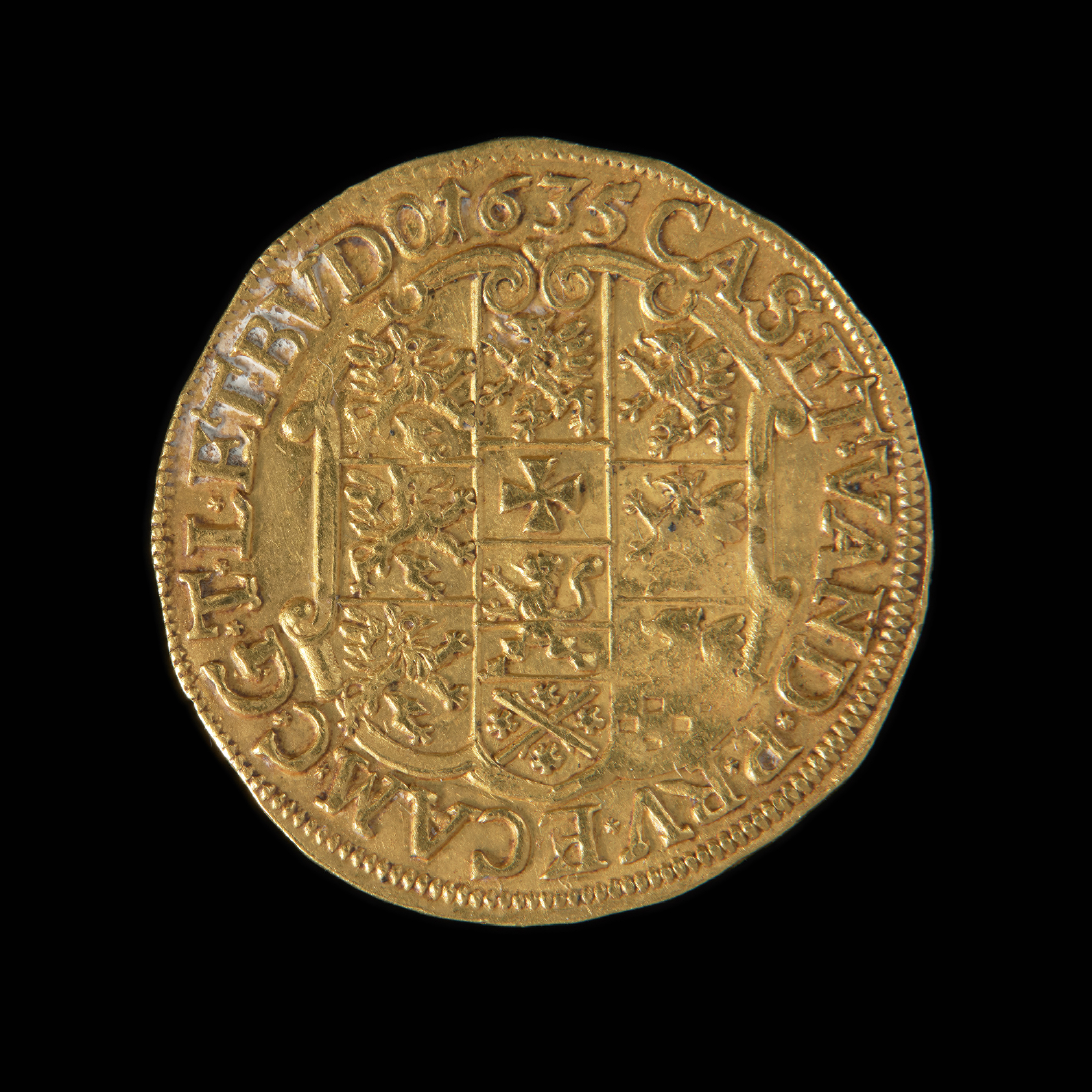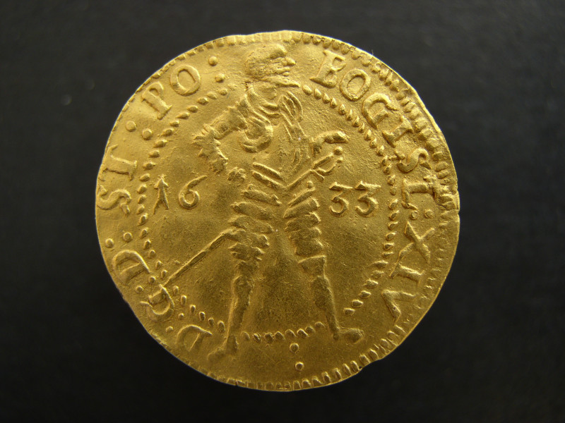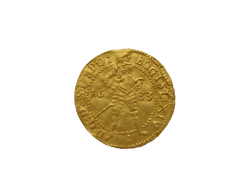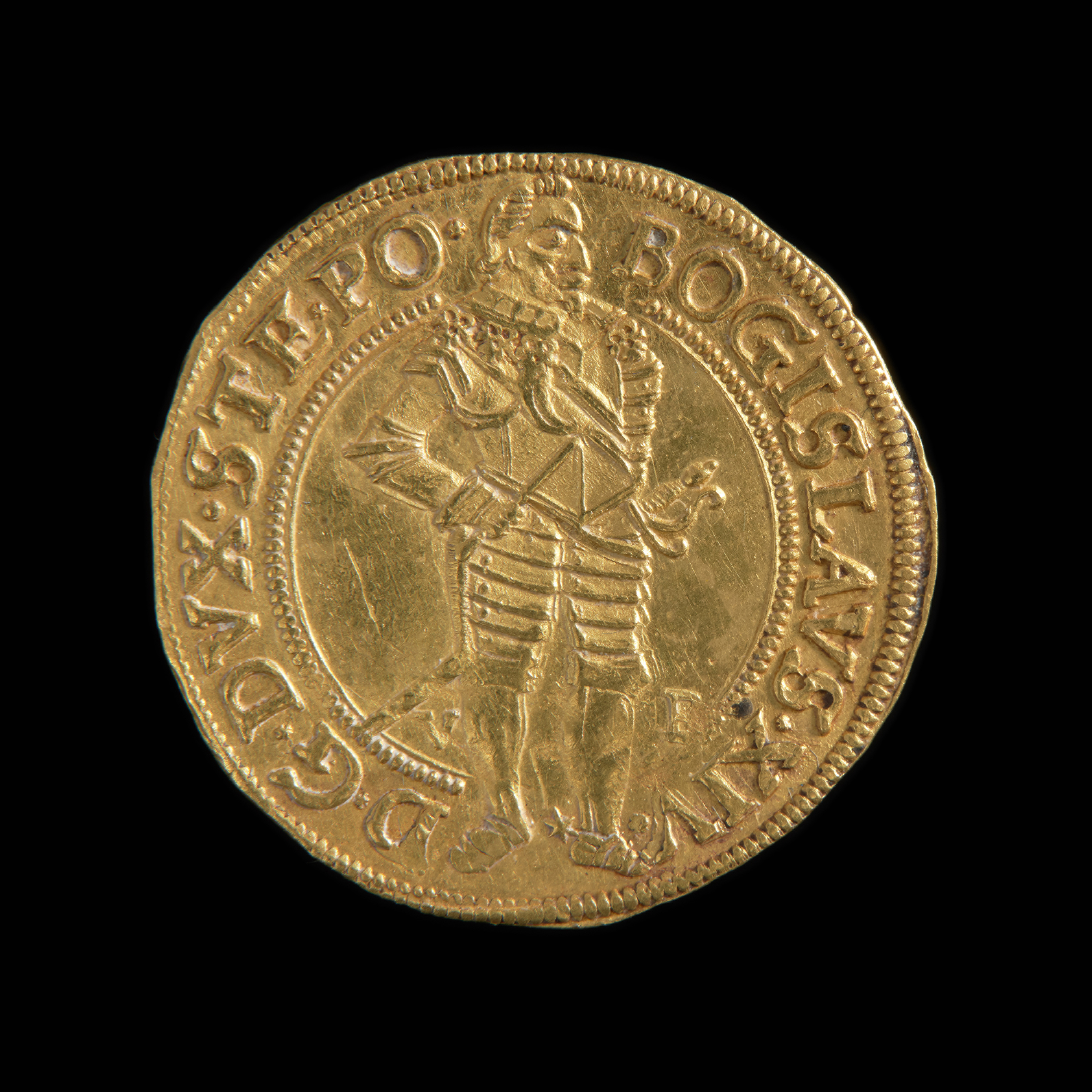 The minting of Duke Bogislaw XIV was entirely in the period of the Thirty Years' War (1618-1648). The policy of neutrality pursued by the Griffins only temporarily averted the spectre of the country's occupation. In 1627, the War reached the borders of the Duchy, which, under pressure, accepted the imperial army on its territory. Maintaining a foreign army consumed vast amounts of money and led to an economic disaster. The lack of coins in circulation forced Duke Bogislaw XIV to open an additional mint in Koszalin. Its activity was illegal since only one mint in Szczecin could function in the Duchy under the Reich's monetary law. In 1628-1636, intensive production was carried out in both mints, but the benefits were reaped by foreign troops, not the state treasury. Gold coins - guilders and ducats - were used mainly to pay the salaries of high-ranking officers stationed in West Pomerania. For the first time, the Duke's image was in a standing position, in parade armour, with a sword and a club on the stamps of ducats. Bogislaw XIV was in a representative pose as an ideal knight and ruler. What draws attention is a clear display of militaria despite the tragic situation of the country, the Duke's illness and partial paralysis. The coin's obverse refers to the Dutch model of ducats, which spread in Europe in the 17th and 18th centuries. The letters V-B appearing on Koszalin ducats in 1633-1636 belong to the administrator Ulrich Bütkow. Apart from the signature, ducats from the Koszalin mint are distinguished by the symbol of a cross in the central part of a ten-field shield and the Bishop of Kamień Pomorski title in the Duke's extended royal titles. We do not know who the author of the stamps was. Still, the good artistic level and the iconographic similarity to the Koszalin thalers signed by the Szczecin goldsmith Gottfried Tabbert allow us to assume that it is also his work. After the death of the last Pomeranian Duke in 1637, the mint in Koszalin was closed forever. The Swedish rulers initially minted coins in Szczecin, and after losing the city in 1713, the mint was moved to Stralsund, the new seat of the Pomeranian provincial government.
