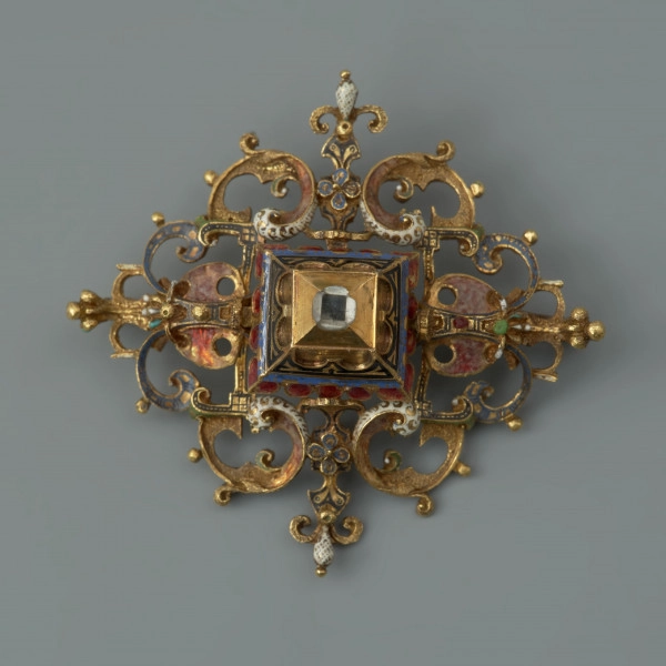 Two nearly identical rosettes with single diamonds were found after the Second World War, during the cleaning of a crypt in the basement of the Castle Church in Szczecin, the burial place of the Pomeranian dukes. The first was discovered in 1946, while sifting debris lying on the floor, the other - two years later, during the cleaning of the sarcophagi.The rosettes were identified as Philip II's jewels, compared to lost the Duke's posthumous image, known from archive photography and dating from 1618, which had been stored in the castle church in Szczecin until the outbreak of war. The brim of Philip II's cap shows a magnificent set of jewels consisting of a central rhomboidal clasp, ornamented with five diamonds, and alternating rosettes with four pearls or a single diamond. The two surviving jewels are characterised by a refined Mannerist composition and delicate designs in grooved enamel technique. At this research stage, it is impossible to identify the author of the jewel, but the quality of artistry indicates that it belonged to prominent German goldsmiths of the early 17th century.The decoration of hats and caps with jewels fixed around the brim became fashionable in the second half of the 16th century and was popular also in the first decades of the 17th century. Also called 'trinkets', rosettes were pinned up at regular intervals or chained together using the eyelets and hooks on the back. According to the description of the costume in the account of the funeral ceremony of Philip II, his cap was decorated with '...a ribbon on the brim splendidly decorated with 17 large gold rosettes connected in a row, with beautiful diamonds and large pearls, and with a black plume...'*