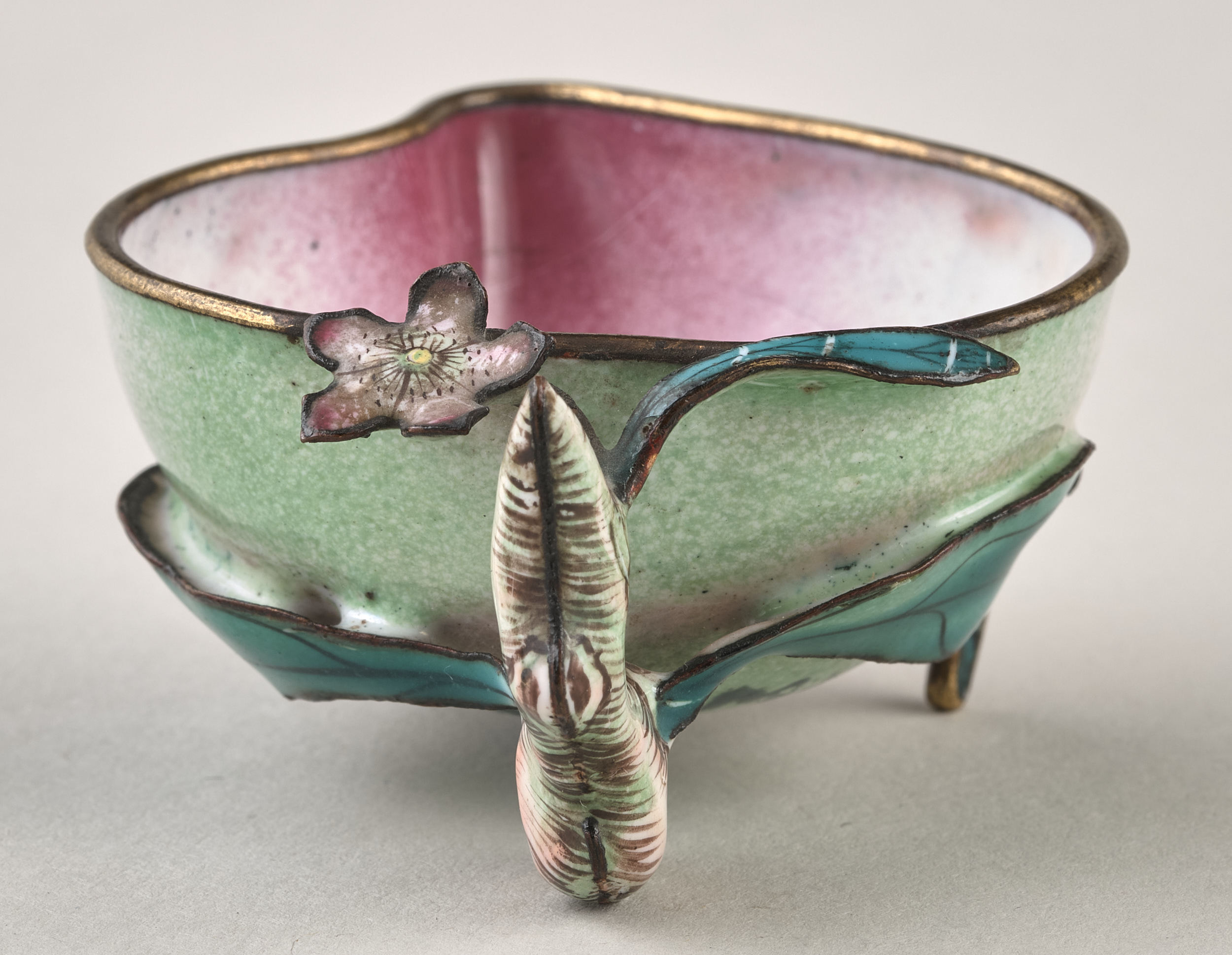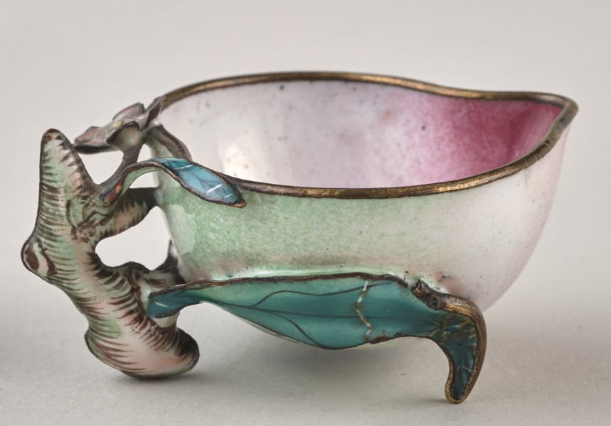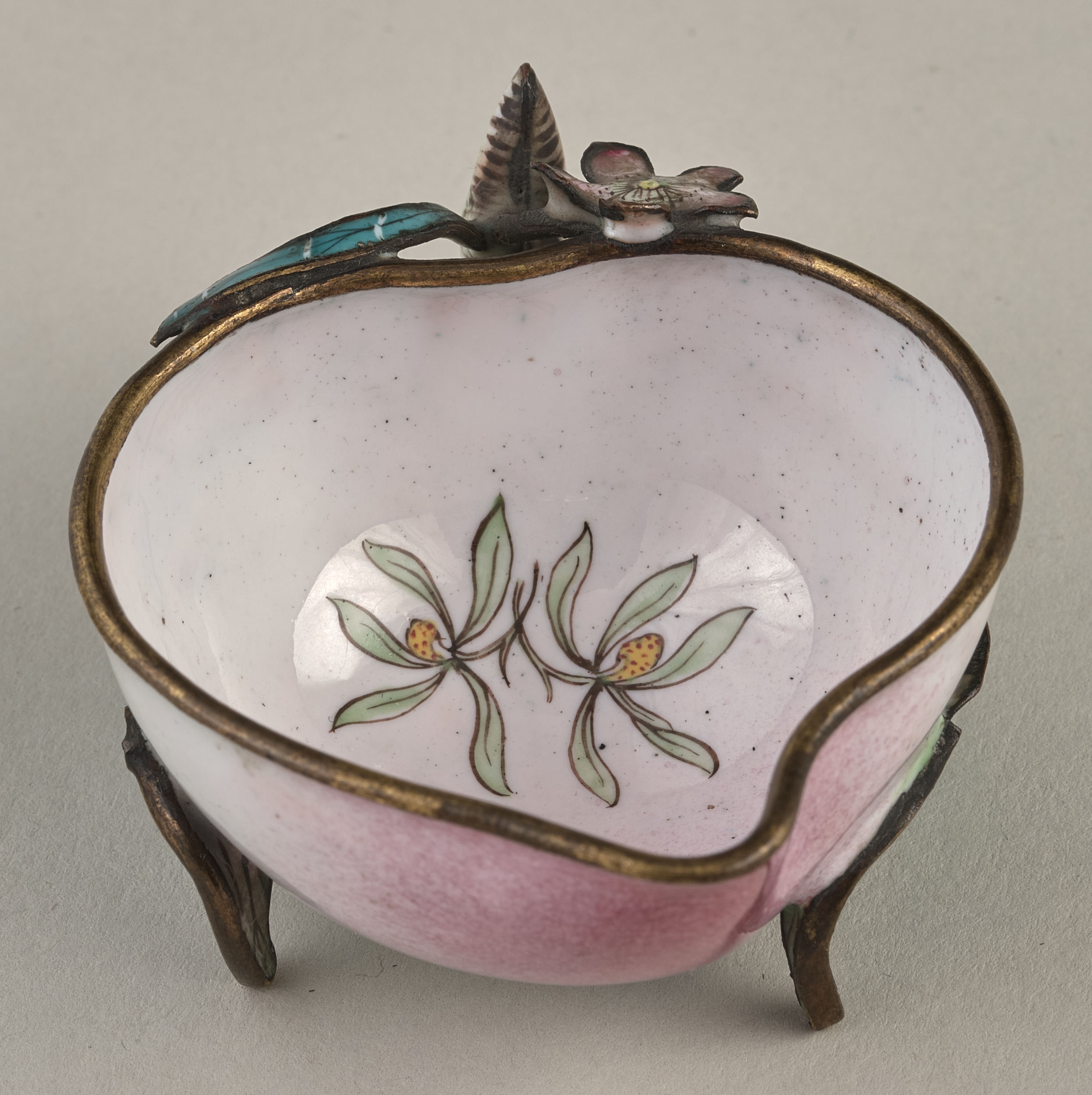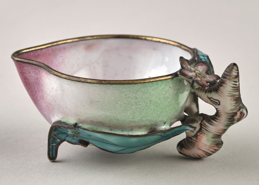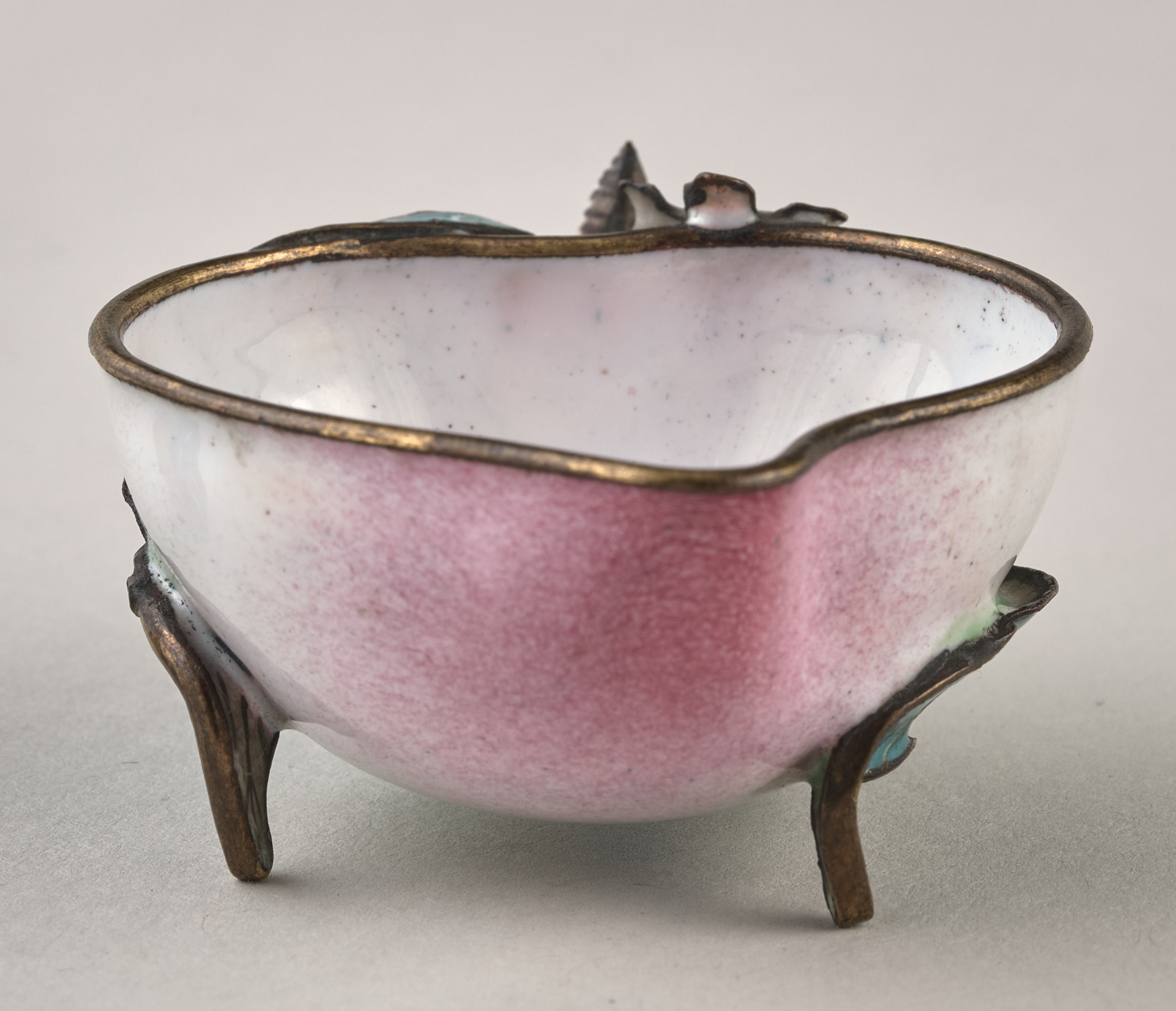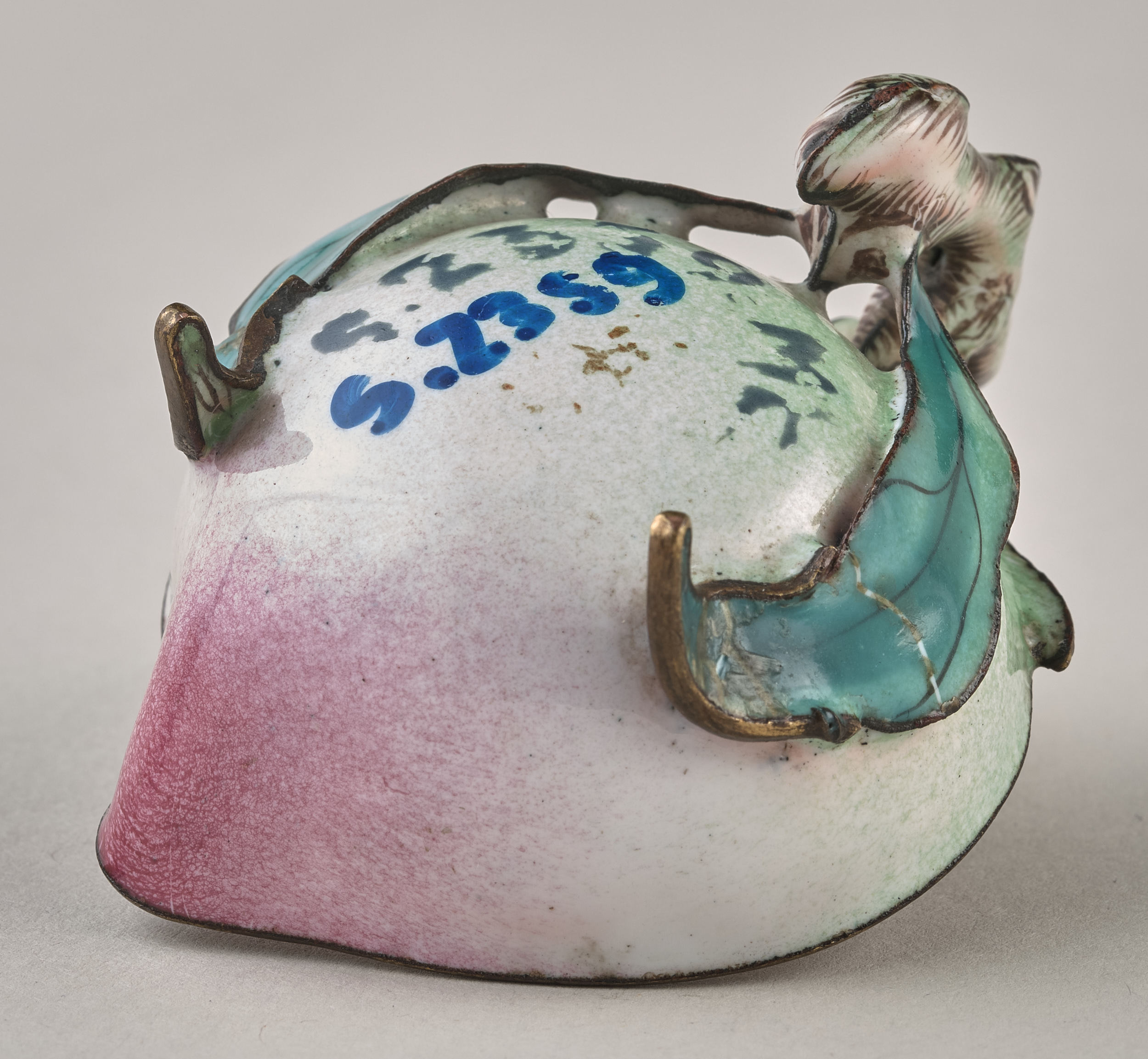 The copper bowl in the shape of a halved peach with a handle in the form of a twig decorated with a flower on top. At the edge, at the bottom of the twig there are leaves whose ends form the bowl's legs. It was covered with fa-lang enamel, green on the outside gradually changing to pink, inside pink with peach flower decoration on the bottom. The teapot is dated to 18th/19th century.