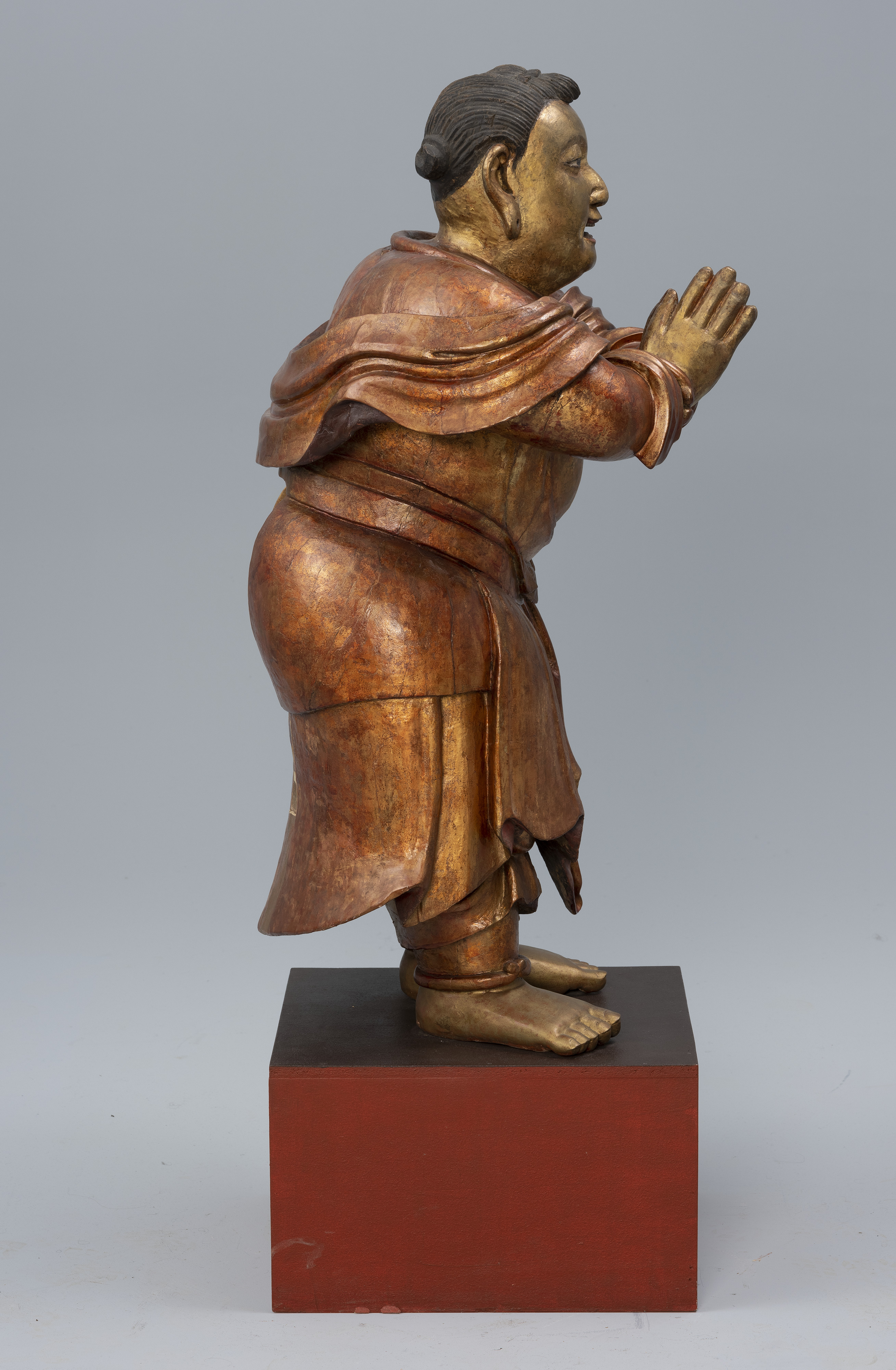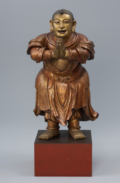 The figure most likely depicts the young pilgrim Shancai Tongzi, worshipping Avalokiteshvara, the personification of compassion, who in China is worshipped as Guanyin – the goddess of mercy. Shancai Tongzi travelled through the south and east of Asia, desiring to learn from scholars and celestial bodhisattvas he met how to attain enlightenment. It is believed that the figure was made in the late period of the Ming dynasty, and is dated to the first half of the 17th century. The building, acquired before 1945, was most likely the property of a former German gallery. After World War II, it was acquired by the National Museum in Szczecin as a remnant of the old German collections.