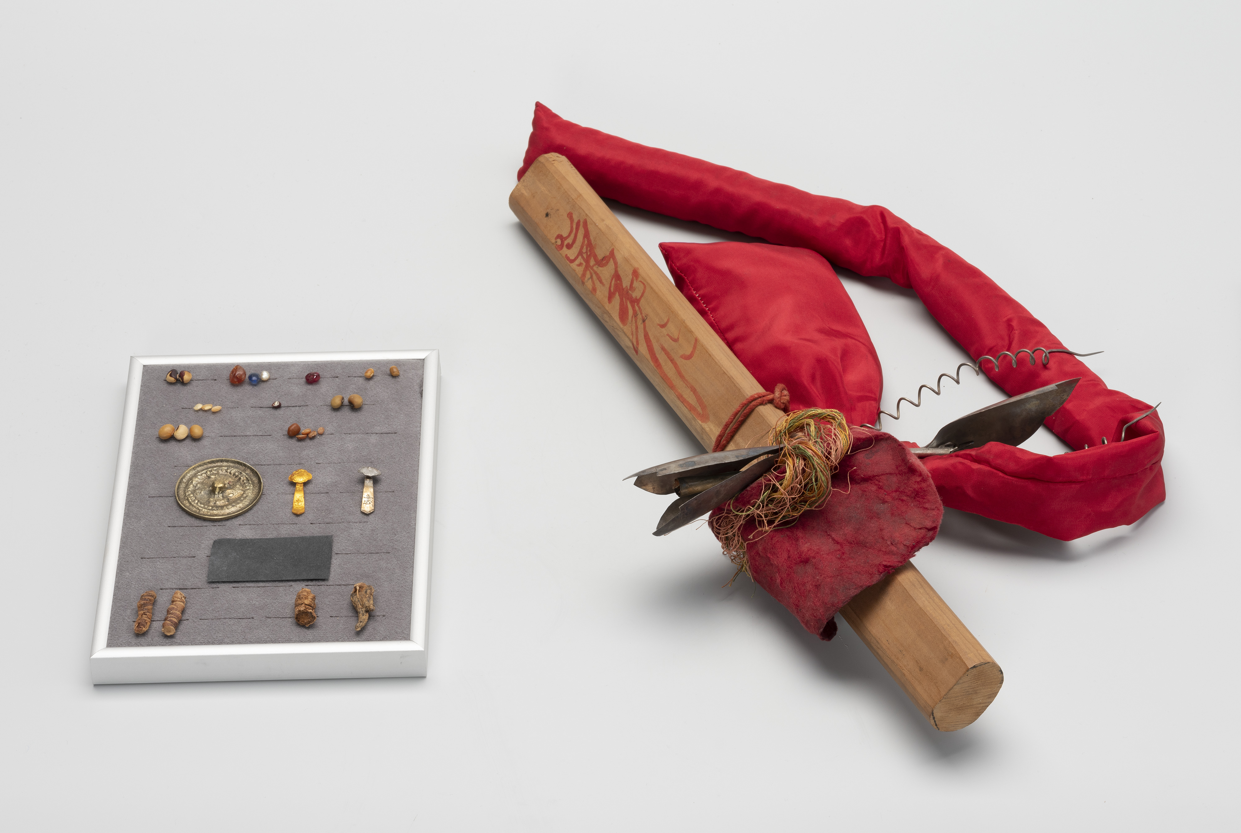 In 1987, due to its poor condition, the sculpture underwent conservation. Half of the left foot and a fragment of the right foot were reconstructed, a base was built, wood defects were filled, the loosened painting layers were repaired and retouched. During the conservation, a compartment located on the back of the figure was discovered that contained multiple well-preserved items: a wooden rod with written text (most likely a consecration text) with silver bells in the shape of a lotus flower, two spirally coiled wires with sharpened ends facing upwards, a felt and a metal disc. In addition, there were also two silk bags filled with plant contents, small handicrafts, and ornaments. All the elements taken out of the interior of the figure were connected together in such a way that they resembled a human heart equipped with pumps, arteries and veins.