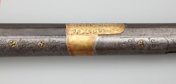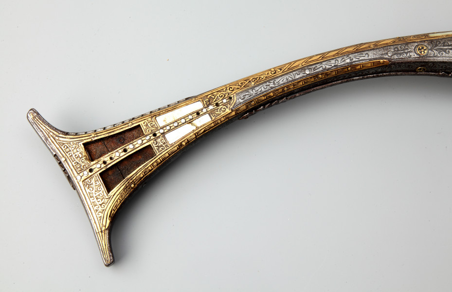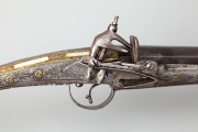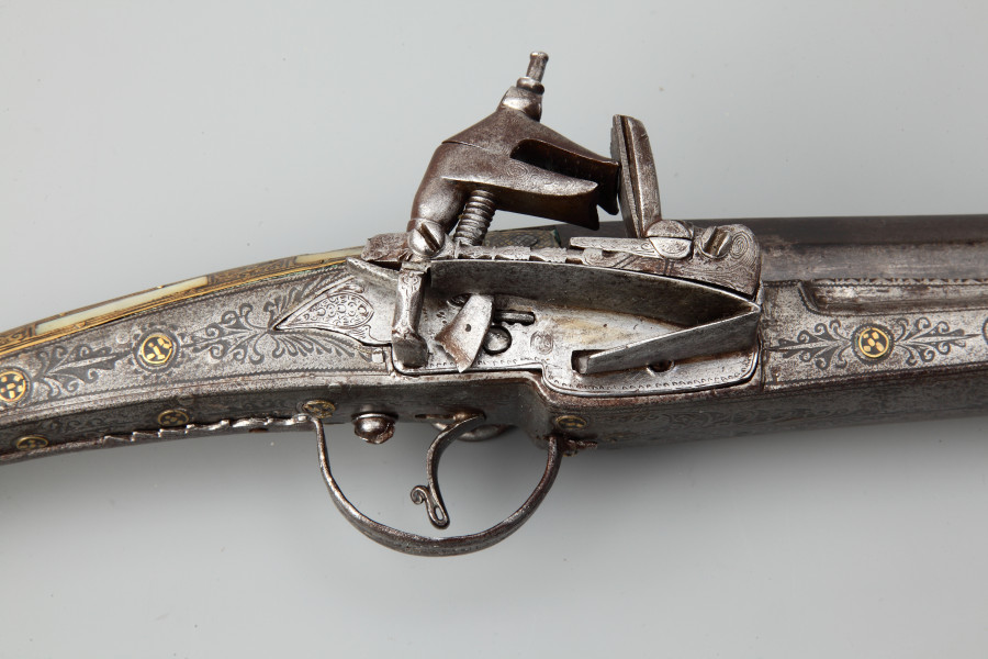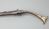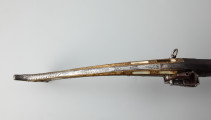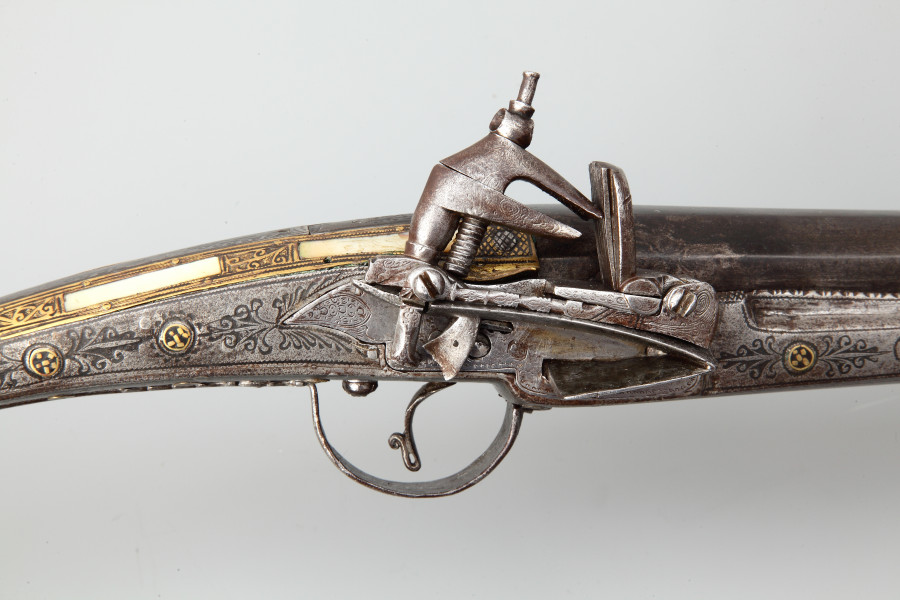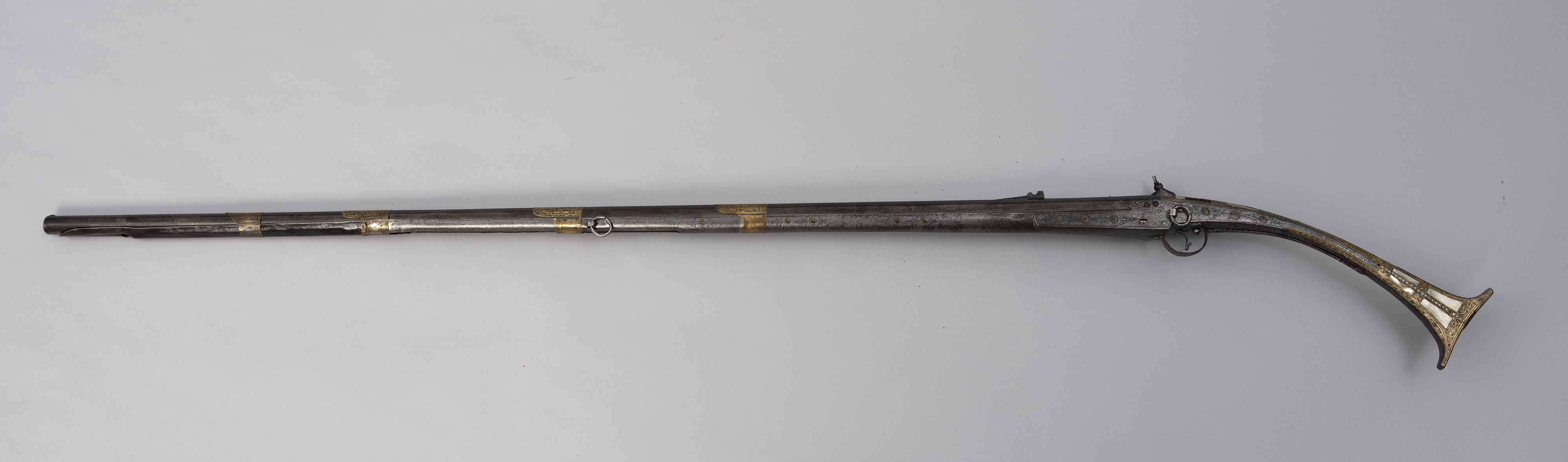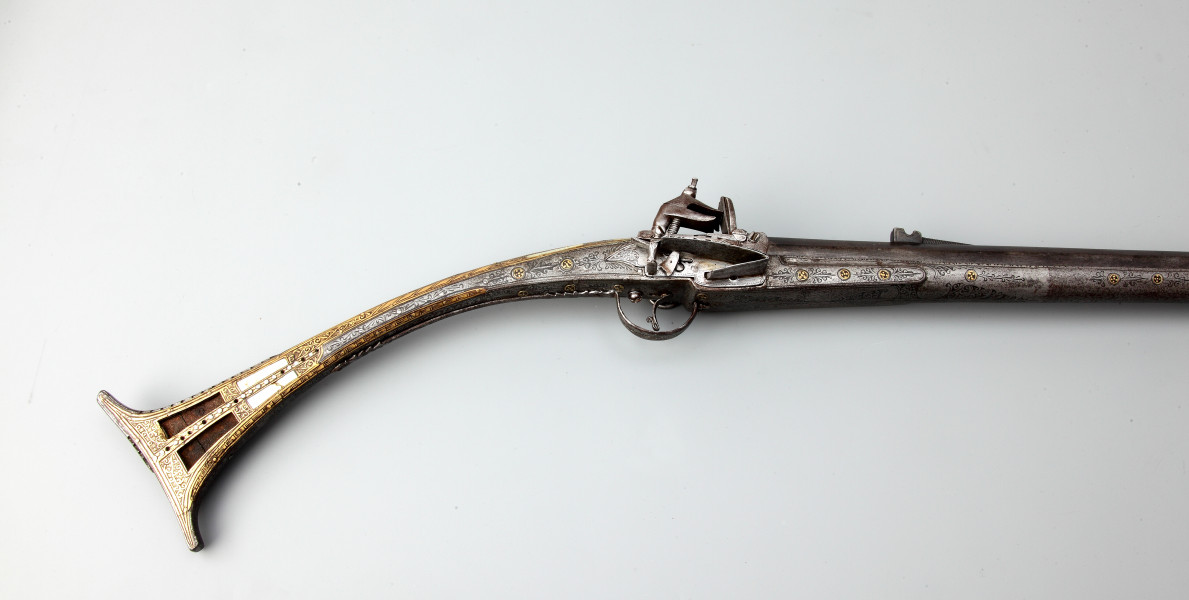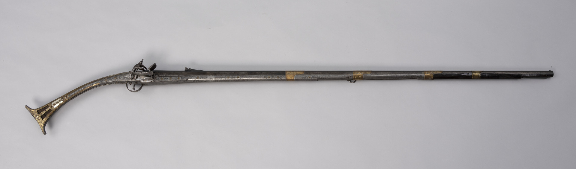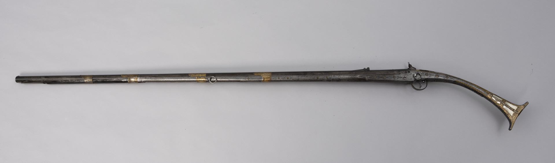 A type of musket with a butt ending in a so-called fishtail and a narrow barrel, it was produced in the Albanian region during the Turkish rule from the 17th to the 19th century. It was called "tančiča" or "tanchika" which meant something long and thin. Another term was 'arnautka' - in Turkish Arnauta meant an Albanian, and in Western European countries, this was used to describe Albanian soldiers fighting in the ranks of the Ottoman army armed with this type of rifle. The term "albanka" also appears in Polish literature to refer to gunpowder small arms with a slender design. The thin, long barrels for these muskets were manufactured and imported to the Balkans from Italy, specifically from the Val Trompia region. Another feature of this weapon type was the all-metal coating of the butt and gun carriage. The featured piece is made of two types of raw material of different colours with an additional mother-of-pearl inlay on the butt. The surface of the butt is ornamented with engraved motifs of floral tendrils and geometric patterns, as well as silver and copper rivets. The weapon has a Mediterranean-type flintlock called a miquelet. On the side near the lock and on the underside of the gun carriage, there are steel wheels used for attaching a belt, allowing the weapon to be slung over the shoulder while walking. Justyna Bądkowska
