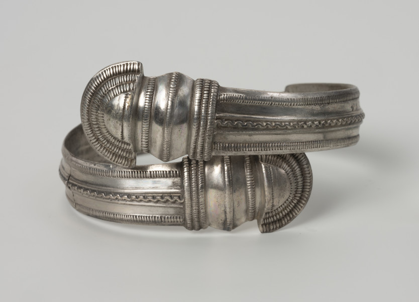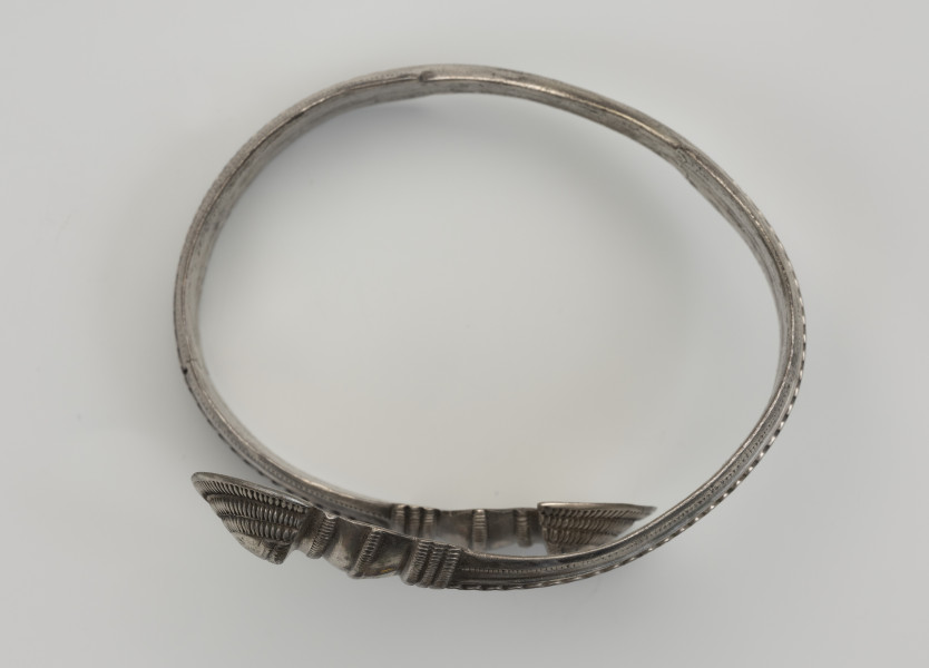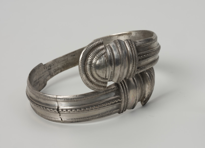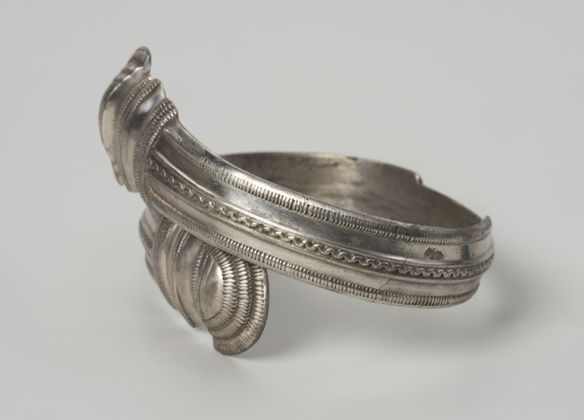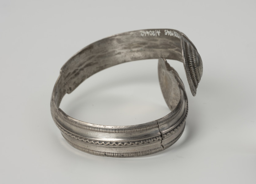 The serpentiform bracelet, classified as Type II according to Erich Blume, was crafted from a silver band richly decorated along almost its entire length and at the terminals. It was part of the grave goods from skeletal burial no. 16 at the Wielbark culture cemetery in Lubowidz (formerly Luggeweise), Pomeranian Voivodeship, near Lębork. The burial contained a second, nearly identical bracelet, along with two bronze fibulae of Almgren Variant 96, featuring triple comb-like extensions and gold foil applications, a bronze fibula of Almgren Variant 128, and a necklace of glass and amber beads. This type of grave assemblage was typical of female burials in the Wielbark culture, and serpentiform bracelets are now considered classic ornaments of this cultural tradition. Finds from the Lubowidz cemetery were first recorded in 1898 due to the presence of a working gravel pit at the site. For several years, these discoveries were catalogued by Eduard Stielow (active c. 1925–1946), director of the District Office of Social Welfare and county heritage custodian. Artefacts uncovered at the site in 1898, 1926, 1932, 1934, and 1938 were sent either to Pommersches Landesmuseum in Stettin or Westpreussisches Provinzial-Museum in Gdańsk. Some of these finds were published in the local journal Heimatkalender für den Kreis Lauenburg in Pommern. Systematic excavations were not conducted until 1938–1939, when they were carried out by Helmut Agde (1909–1940) on behalf of the museum in Szczecin. Over an area of 75 ares, Agde uncovered 308 graves, including 241 skeletal and 60 cremation burials. A comprehensive study of the site and its artefacts was later produced by Ryszard Wołągiewicz (1933–1994) of the National Museum in Szczecin, published in 1995 as a monograph. Bartłomiej Rogalski