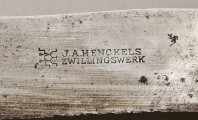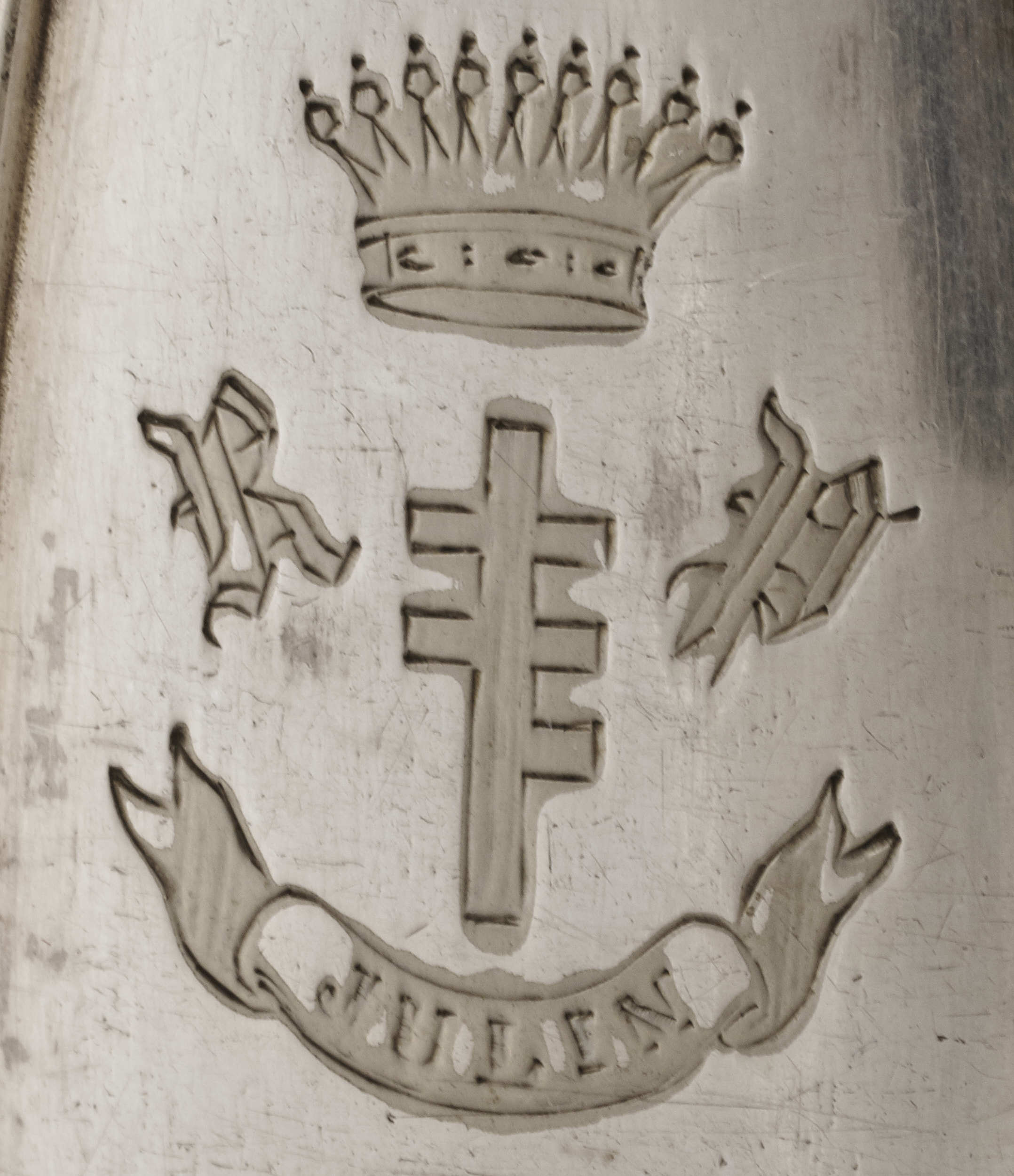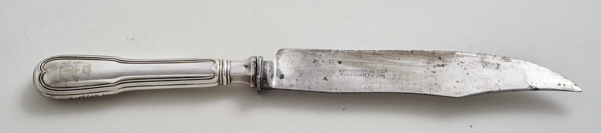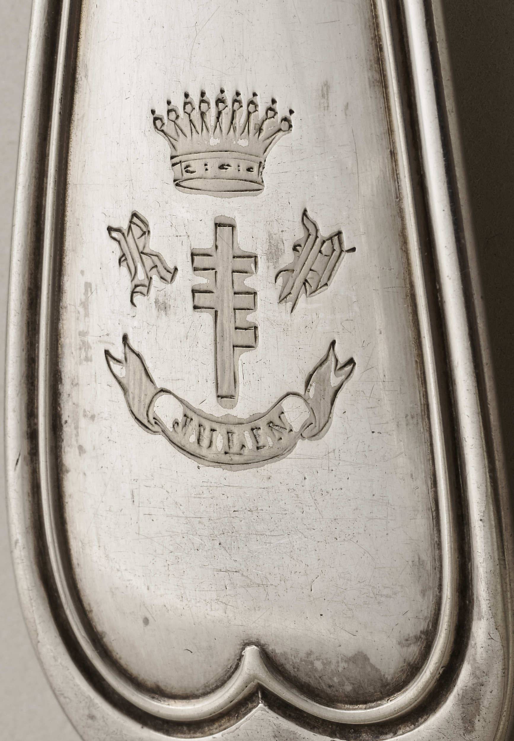 Similar to the smaller cutlery, the table centerpiece fork has a flat handle with a flared end decorated with a double profile. The reverse of the handle shows a count's crown with the Potocki family's coat of arms, i.e. Pilawa, below it. On the sides, there are symmetrically arranged letters R and P with a visible sash with the inscription “Julin” under the coat of arms . In addition, punches and the manufacturer's stamp “Christofle” can be seen on the handle necking.