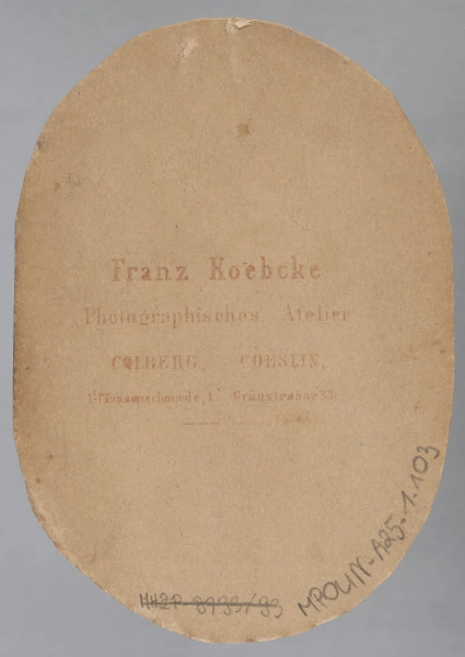 The portrait of a man with a moustache and sideburns, straight shot. Trimmed to an oval on cardboard with the imprint of the studio in Kołobrzeg. One of those portrait photos in the collection about which we cannot make any assumptions.