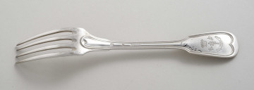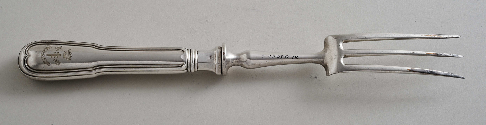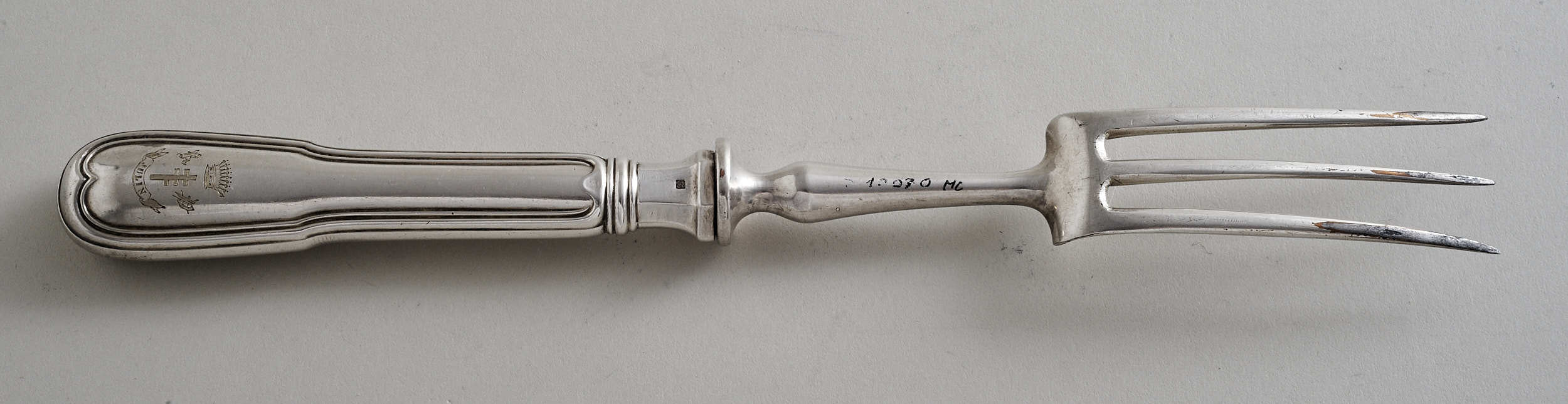 Similar to the smaller cutlery, the table centerpiece fork has a flat handle with a flared end decorated with a double profile. The reverse of the handle shows a count's crown with the Potocki family's coat of arms, i.e. Pilawa, below it. On the sides, there are symmetrically arranged letters R and P with a visible sash with the inscription “Julin” under the coat of arms . In addition, punches and the manufacturer's stamp “Christofle” can be seen on the handle necking.