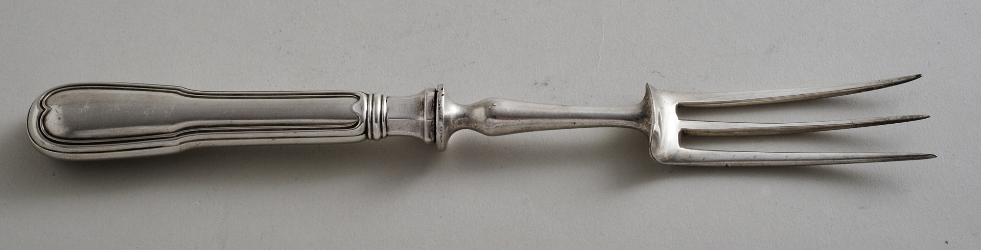 A large, three-pronged fork together with a knife and spoon form a set of so-called table centerpiece cutlery. The cutlery is used to scoop food from bowls or platters onto smaller plates prepared for all the guests at the table.