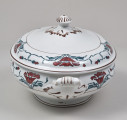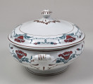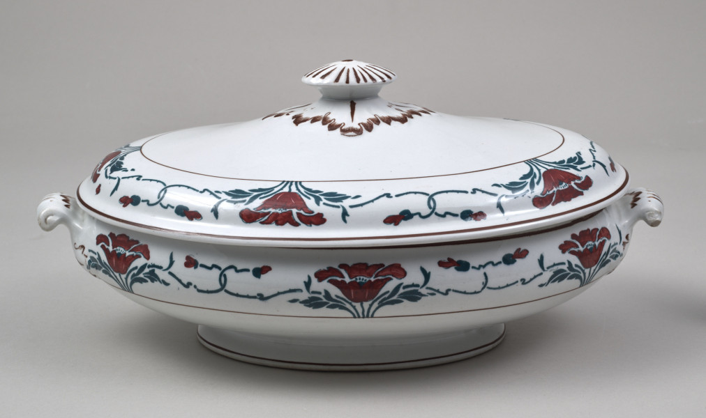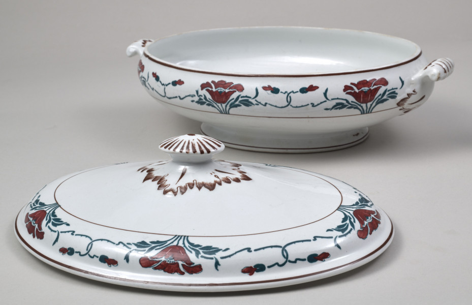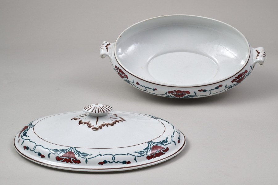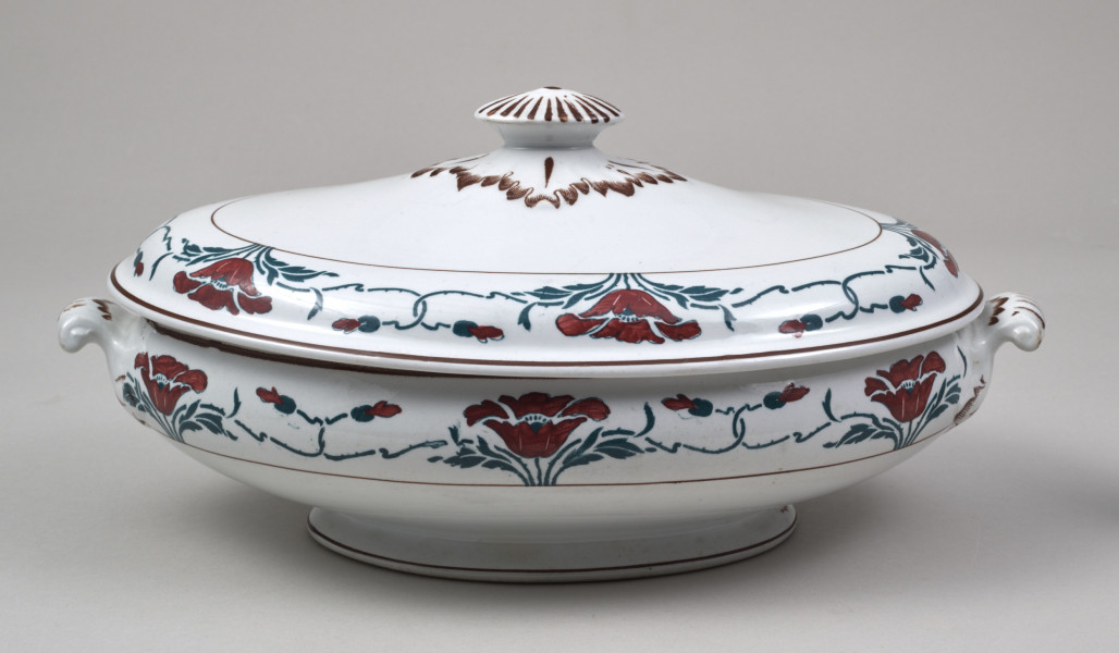 Vase - with a faience lid, modest in size, designed on an oval base. It is decorated with a two-toned motif of poppy flowers (petals in burgundy-red, leaves, and stems in dark green) stylised in the spirit of moderate Art Nouveau, arranged into a striped border ornament. The semi-ellipsoidal vessel is supported on a low, conical, ring-like foot and features two small, volute-shaped handles positioned along the longer axis, not extending beyond the height of the vessel. These handles take the form of three-dimensional three-leaf motifs (the leaf veins highlighted with stencilled brown) mounted on a protrusion of the vessel. The broad end of each handle detaches from the wall surface, transitioning into a fully solid volute curl. The lid is relatively low, with a pear-shaped, undulating profile and a parapet-like rim. Inside, it has a recessed fitting that matches the vase's opening. The top of the lid features a handle in the form of an oval knob, adorned with radial grooves on its face and surrounded at the base by a rhomboid collar of leaves that lie flat against the convex surface of the top. The leaves and grooves are stencilled with brown. At the widest parts of the vase and lid—near their rims—runs a wide strip outlined with two brown stripes, filled with a green and burgundy poppy pattern. This pattern consists of a basic motif of a cup-shaped flower standing between a pair of leaves and two flower buds. These buds are attached to long, flexible stems that curve outward, interlocking with similar buds to form a chain-like pattern. The border on the vase features six poppy flowers, interrupted twice by the leafy bases of the handles. The border on the lid contains five flowers. The decoration was applied to the top of the vessel using a semi-mechanical method, i.e. by means of a stencil, with the green fragments of the pattern and the outline of the flower petals superimposed. The latter were painted freely by hand. On the reverse of the vase, near the foot, there are two green stamped signatures. One is the manufacturer's signature depicting an anchor within an oval, with the inscription S.B. and S/ENGLAND underneath. The other is the signature of the London store SOUTH AUDLEY S/ T. GOODE & Co/ LONDON. W.