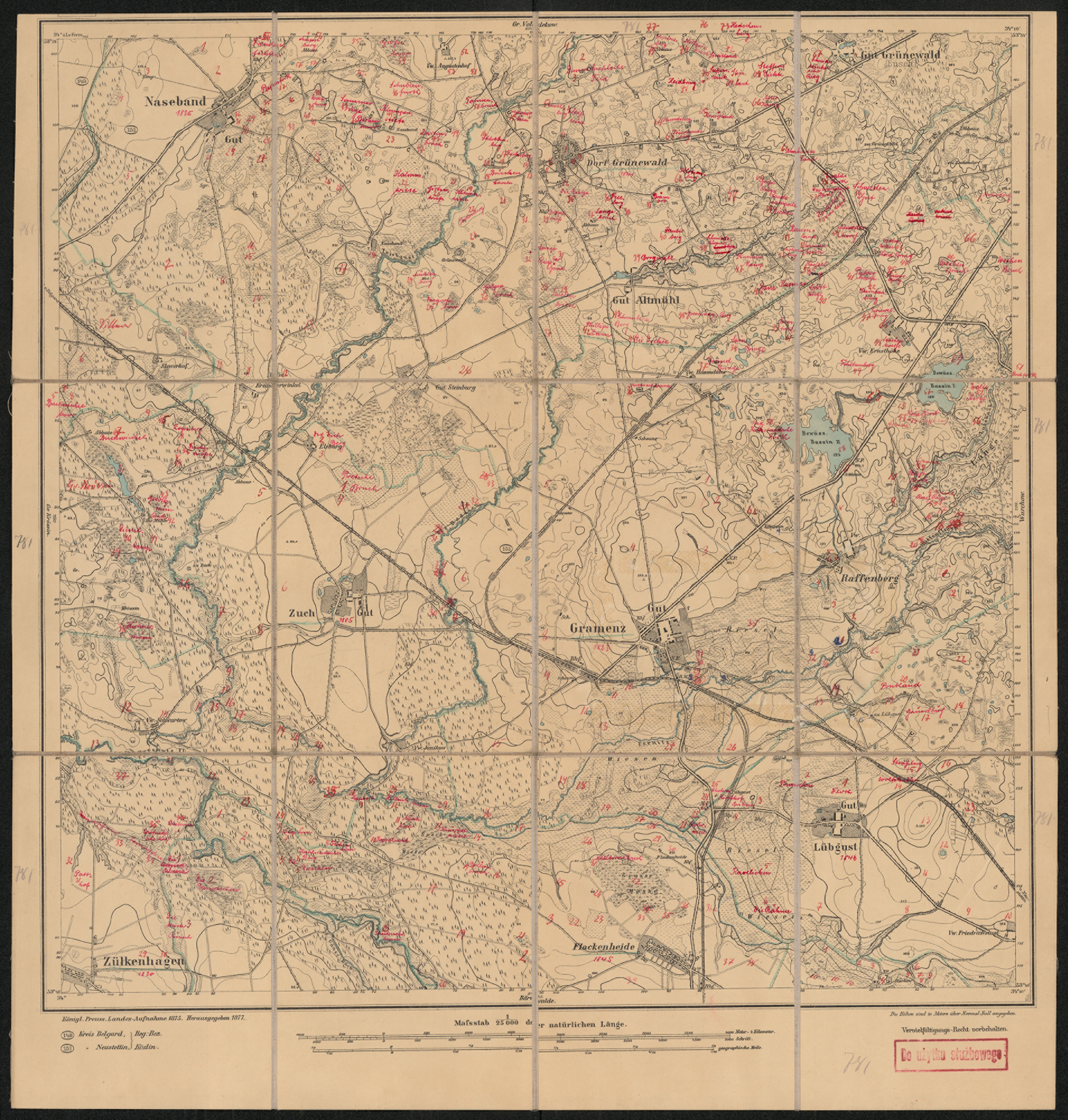 The 781 Gramenz I map was drawn in 1875, and published in 1877. It covers the areas surrounding Gramenz, Kreis Neustettin, Reg. Bez. Köslin, Prov. Pommern, today Grzmiąca, Szczecinek District, West Pomeranian Voivodeship, Poland. It is the only surviving copy of the pre-war topographic map marked with the sheet number 781, containing data on the location of objects and their names in the Flurnamen Sammlung archive. The printed map features a hand-drawn layer with the numbers of physiographic objects connected to the localities of Naseband (today: Nosibądy); Grünewald (today: Mieszałki); Altmühl (today: Radusz); Gr. Krössin (today: Krosino); Zuch (today: Sucha); Gramenz; Raffenberg (today: Równe); Zülkenhagen (today: Sulikowo); Flackenheide (today: Wielawino); Lübgost (today: Lubogoszcz).