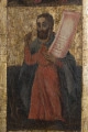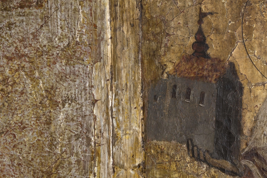 The main area is filled with a half-figure representation of the Virgin Mary with the Child. Mary is depicted as a Hodegetria, pointing to her son with her right hand. This gesture emphasises that Jesus is ‘the way, the truth and the life’ (Jn 14:6). (John 14:6), and exposes his image and significance. He is the key figure of the icon, all means of expression and details are subordinated to him. Jesus is shown as a child on his mother's shoulder, blessing the faithful with his right hand. However, he is far from being a carefree child; the stern expression on his face and the red ribbons with which the book he is holding is tied foreshadow a martyr's death. Mary's gaze is also severe, and her lips tightened since she is aware of her son's fate. Above her head, the archangels are depicted on the sides in medallions, Michael on the left and Gabriel on the right. The prophets are on the sides and below in the jewels (not all the figures are visible, as the icon had its corners cut off and its fate is not known, but it was probably re-framed in an octagonal or oval frame). Such positioning of the prophets is archaic; once, before forming the multi-row iconostasis, the partitions did not have a separate place for the apostles’ and prophets' depiction; then they were presented around the figures of Christ and Mary on the governor icons. With the development of the 16th- and 17th-century iconostasis, these images became part of the higher rows; the apostles were placed in the Deesis row, and representations of the patriarchs began to co-create the highest tier. The icon of Hodegetria, such as the icon of Pantocrator from Sosnovica in the collection of the National Museum in Lublin, follows this older pattern. The figures of prophets surrounding the figures of Mary and the Infant are meant to draw the attention of believers to the Old Testament messages about the Messiah.