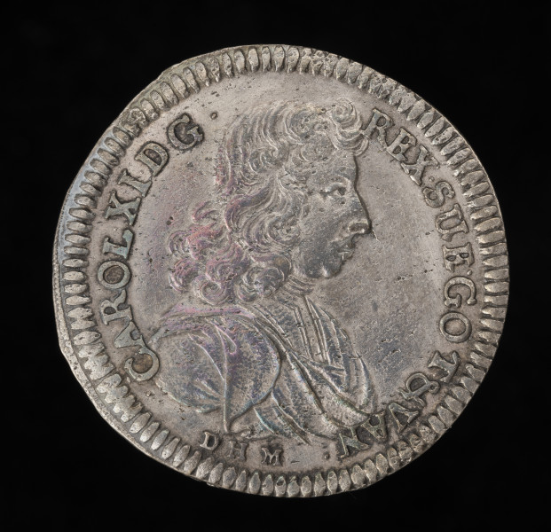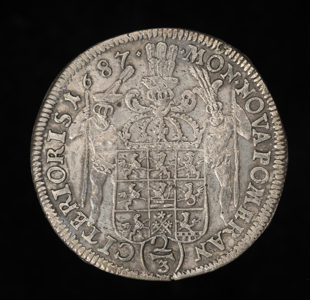 During the reign of Charles XI (1660–1697) in Swedish Pomerania, rising silver prices led to the collapse of the monetary system, which had been based on the Holy Roman Empire’s 9-thaler minting standard from 1559. In 1667, a new 10.5-thaler standard was introduced at the Treaty of Zinna, expanding the range of denominations in circulation. A new coin, valued at 2/3 of a thaler and known as the silver gulden, was introduced to stabilise the system. It was minted from twelve-lötige silver (750 fine). Smaller silver coins were issued in proportion to this standard, while thalers were minted only in limited quantities, adhering to the Empire’s traditional standard. The mint in Szczecin changed hands frequently, with several different mintmasters in charge. At the end of 1685, David Heinrich Matthäus, previously the mint’s controller, was appointed as mintmaster. His initials (DHM) appeared on all coins struck under his tenure. The mint’s output focused heavily on 2/3 thalers and 1/3 thalers, though both were minted with a slightly lower silver content than required by the Zinna standard. In less than three years under Matthäus’ management, over 200,000 Reichsthalers worth of silver was converted into these two denominations. Both coins shared a similar design. The obverse depicted the bust of the king with his Swedish title, while the reverse featured the grand coat of arms of the Duchy of Pomerania. The inscription on the reverse identified the coin as an issue struck by Sweden for Western Pomerania (Pomeraniae Citerioris). The 2/3 thaler of Charles XI is found in many museum and private collections. However, technical and staffing issues at the Szczecin mint are evident in the coin’s appearance. The most noticeable flaws include rough portraits, scratches, and irregularities on the die surface. Despite the mintmaster’s requests to hire a skilled engraver and purchase a new rolling press – estimated at around 500 Reichsthalers – the provincial authorities rejected these proposals for cost-saving reasons. Genowefa Horoszko