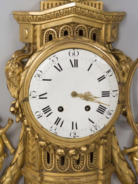 The wooden clock case, set on a hanging console, carved and gilded all over, is a compilation of architectural and figural motifs. Its shaft, set on a wider plinth, is topped with a broken cornice, on which an eagle sits with outstretched wings, holding an oval medallion in its talons. The sides are flanked by two figures of putti pointing to a clock face set against the shaft decorated with a wreath of laurel and a garland of leaves and flowers supported on either side by goat heads.