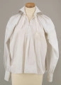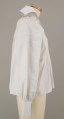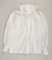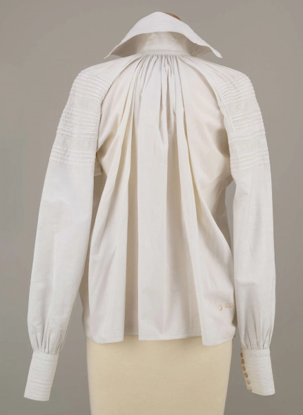 The shirt for the festive costume of Krzczonów comes from the village of Jabłonna, in the municipality of Bychawa. It was made by Helena Kuśnierz before the First World War. It is 62 cm long and 67 cm wide. It is sewn from white factory linen, creased at the hem, and consists of eleven parts: a front, a back, two sleeves, two cuffs, two side panels, two gussets, and a collar. It has an opening at the front fastened with a single button, and at the collar there are two holes through which a white ribbon is pulled and tied in a bow. The sleeves and the upper part of the sleeves are decorated with narrow darts, between which white factory lace is sewn. The wide cuffs are decorated with eleven rows of horizontal stripes embroidered with lockstitch in white thread and fastened with six small buttons. Similar embroidery is used on the large, padded collar along its three edges.