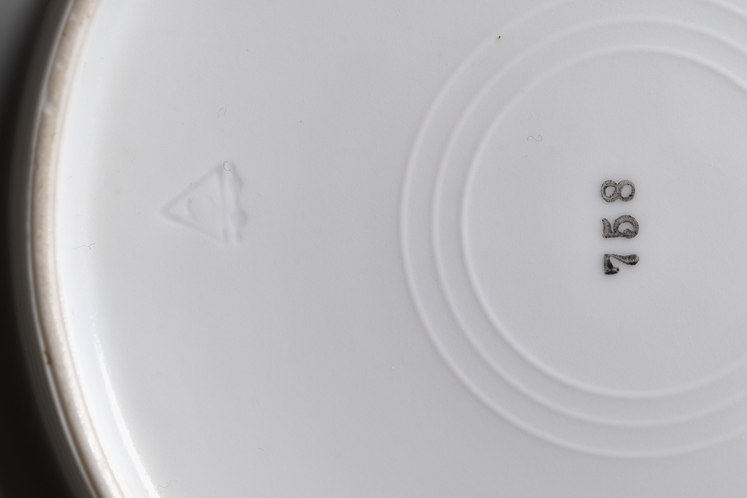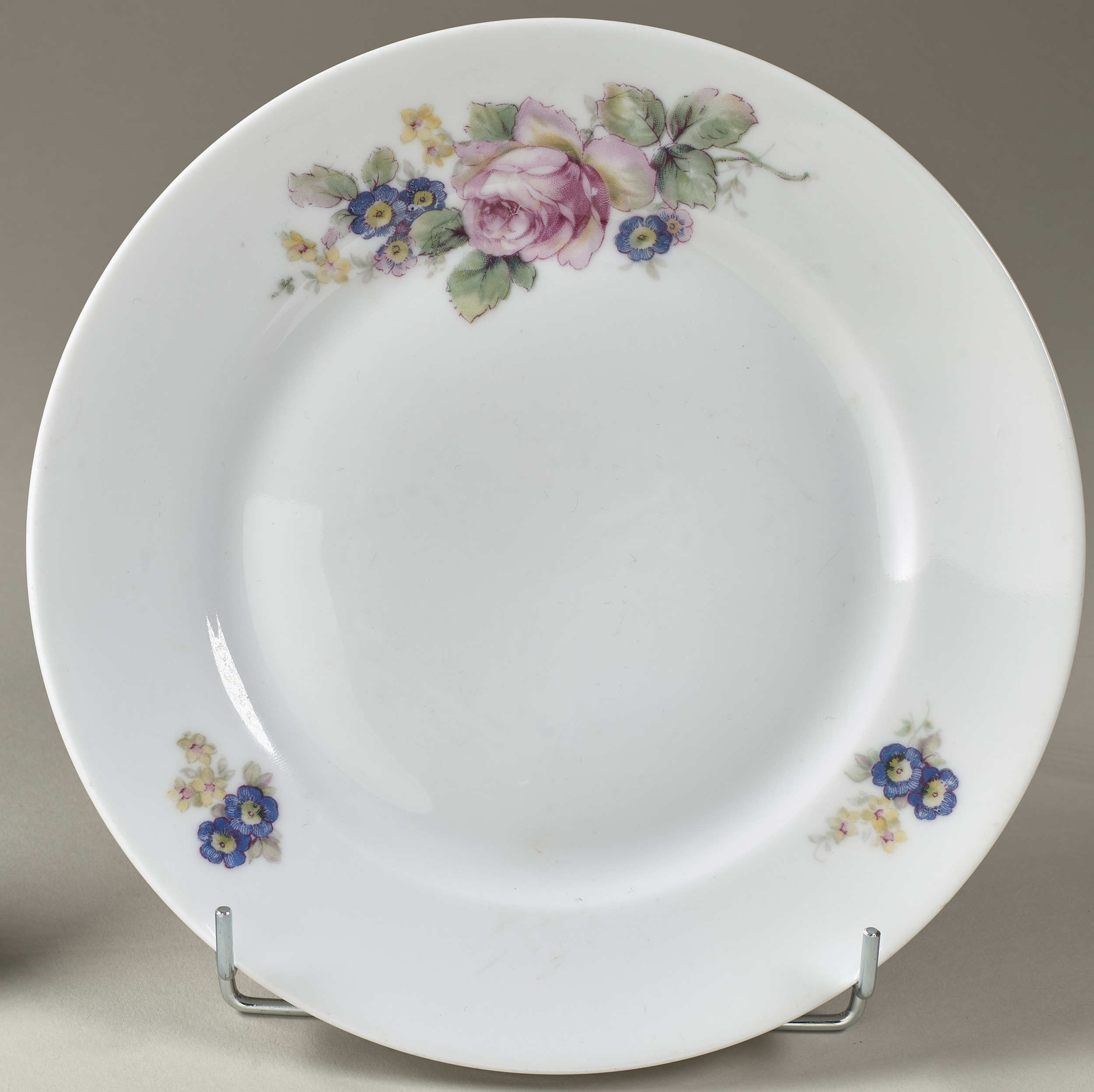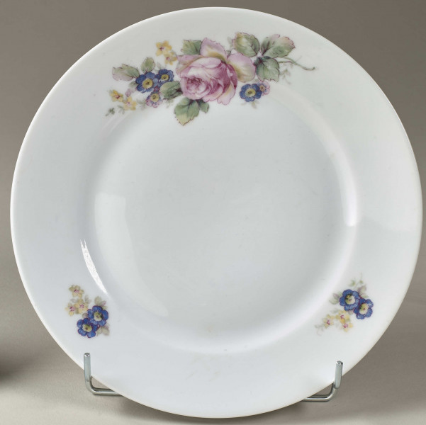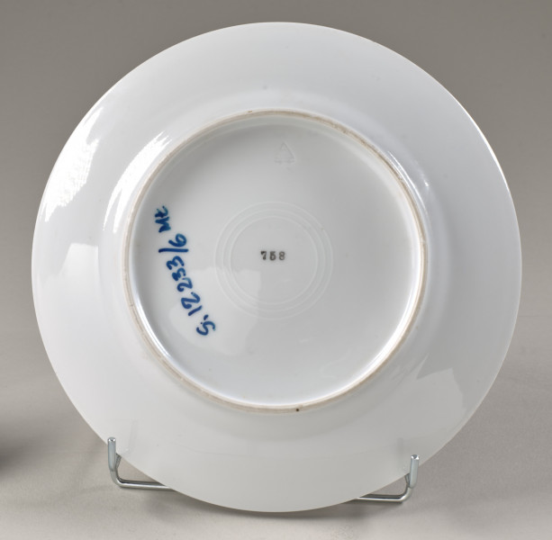 This dessert plate is decorated with three evenly distributed bouquets. A larger one is located on the joint between the flat area and the elevated rim. It consists of a pink rose, blue forget-me-nots and smaller yellow flowers. The other two are much smaller and consist of just forget-me-nots and yellow flowers. At the bottom underside, there are visible factory marks: C in triangle, a stamp 758 and an inventory number.