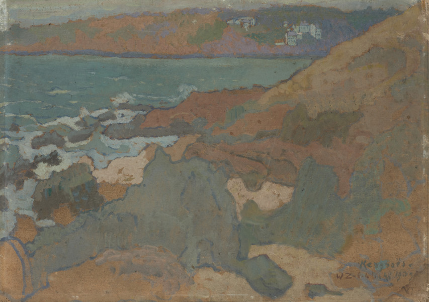 Wacław Zaboklicki was Wojciech Gerson’s disciple in 1897-1899. He perfected his skills in Munich and Paris, and he also sought inspiration during numerous trips to Russia in 1898, Italy in 1901 and France in 1904-1912. The artist's works prove the influence of French Impressionism and the work of Władysław Ślewiński, who also attended the Wojciech Gerson Drawing School in Warsaw. The painting Brzeż morza w Ker-Groës [The Seashore at Ker-Groës] from 1909, acquired from the artist for the collection of the National Museum in Szczecin in 1958, shows clear links with his oeuvre, for example, also with the French landscape Morze w Le Pouldu [The Sea at Le Pouldu] from around 1896 (private collection), which depicts the area around Bas Pauldu, where the artist settled the year the work was created. A year later, he joined the newly founded Society of Polish Artists "Sztuka" in Kraków. Zaboklicki painted his picture during a trip to France. The composition was created with oil on cardboard. The landscape is simplified. In the foreground, there are boulders by the seashore. In front, the level of the shoreline of the bay is visible, and loosely built-up houses rise just above it. Everything has been rendered in chilly colours in shades of bleached green, beiges, greys and contrasting stained white. Everything has been closed with a clear outline in black. Beata Małgorzata Wolska
