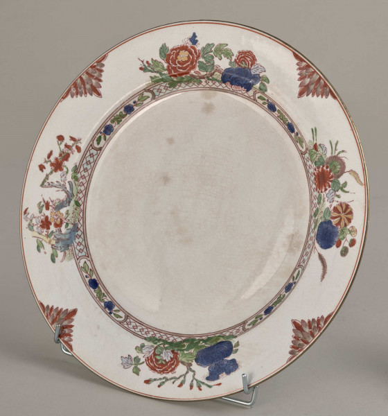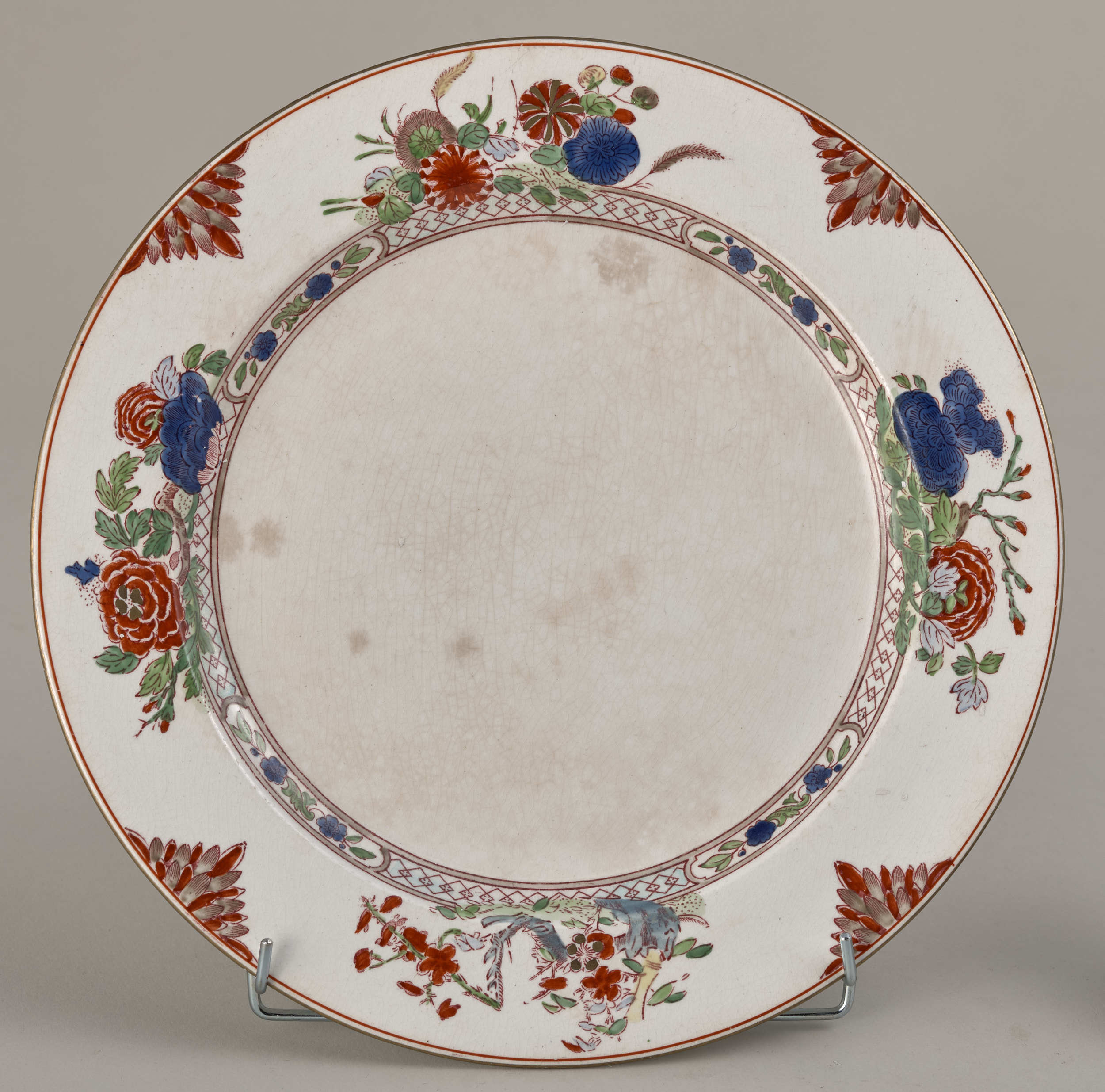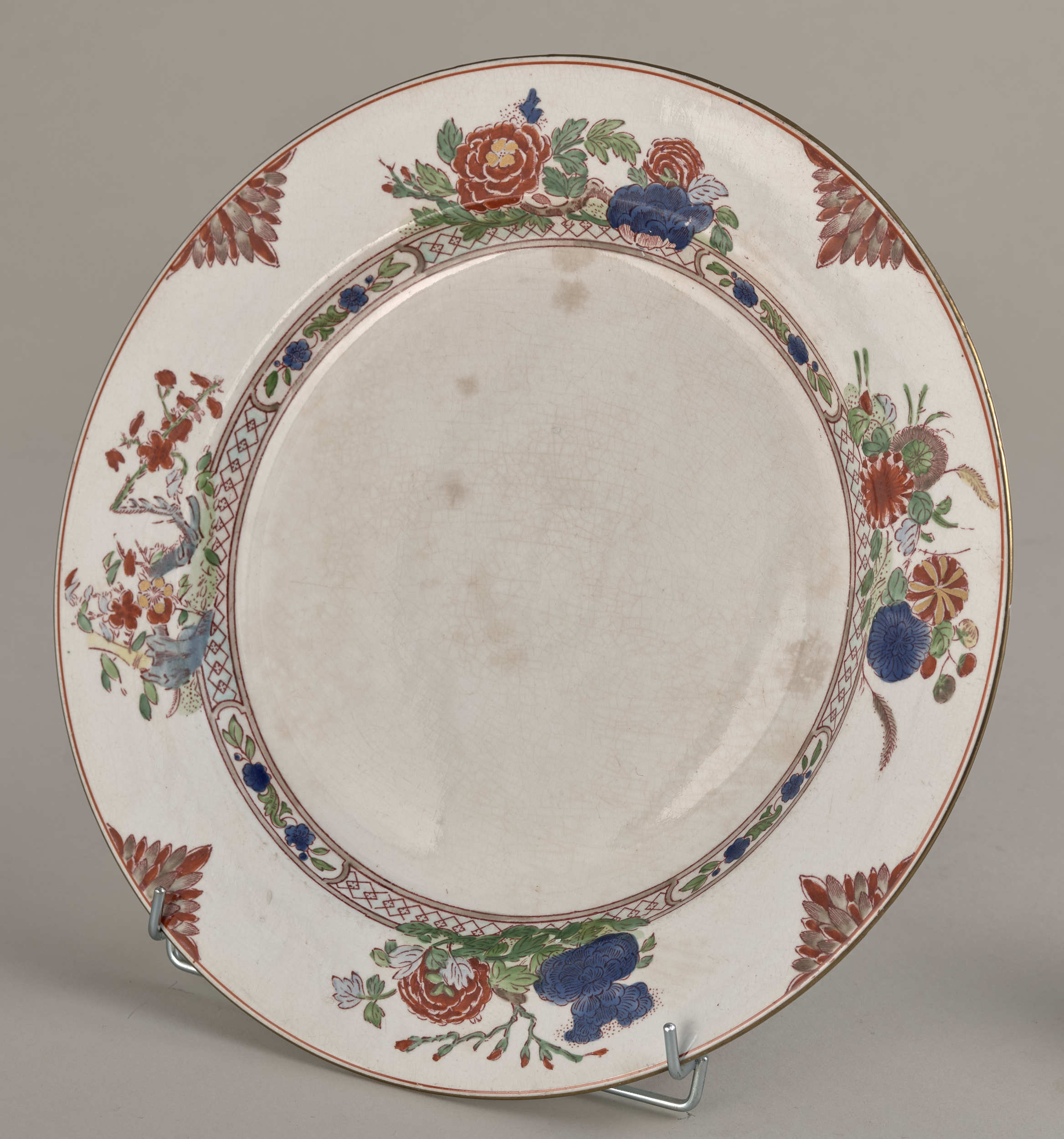 Dinner plate, faience with a slightly cream shade, covered with a grid of decorative glaze cracks, decorated with paintings in the Far Eastern type with floral and geometric motifs concentrated in the lip part. A detailed drawing of the decoration pattern is printed in purple and - on the enamel - hand-painted with paints in several colours: rusty red, dark blue, green, and sand-beige. Less used colours are light blue, steel green, celadon and yellow. This decoration consists of a strip of geometric ornament with a rhombus motif, running just below the edge of the indentation, then four large floral and plant compositions- one of them with the motif of a broken bush, arranged on the lip of the plate, close to the strip of ornament. These compositions are separated by leafy semi-rosettes. Gold is found only on the strip that laminates the edge of the lip and on small elements of three flowers in large compositions. The back of the plate is covered with gray spots under the enamel. Visible markings: in the central point the letter "B", factory reference number "BOOTHS" – both stamped in mass- and a large seal printed under glazed in burgundy colour: "MANUFACTURED FOR:/A.LA. PAIX,/34.AVENUE DE L'OPERA, /PARIS./IMPORTE D'ANGLETERRE". Under it, there is an inscription with the current inventory number. England, Hanley, nineteenth century.