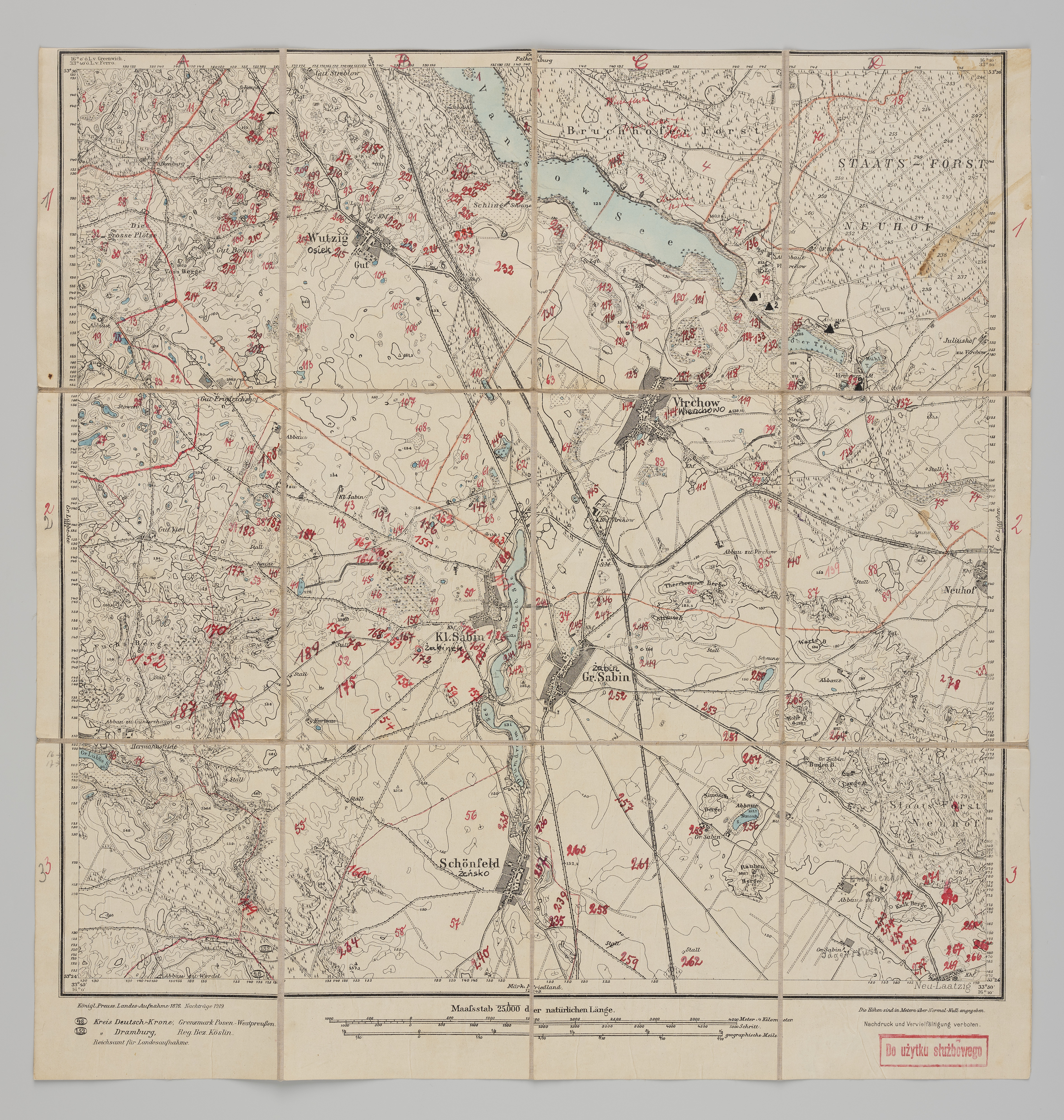 The map is an appendix to the index of toponyms, which was developed as part of the project initiated by Pomeranian linguist, Dr Robert Holsten (1862-1954), with the aim to collect and compile contemporary folk and archive names of natural and anthropogenic physiographic objects, as well as inhabited and uninhabited places collected with local queries. The Meßtischblatt topographic maps at a scale of 1:25 000 are characterised by a very high level of detail and accuracy in mapping the topography of the terrain.