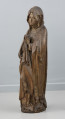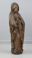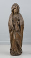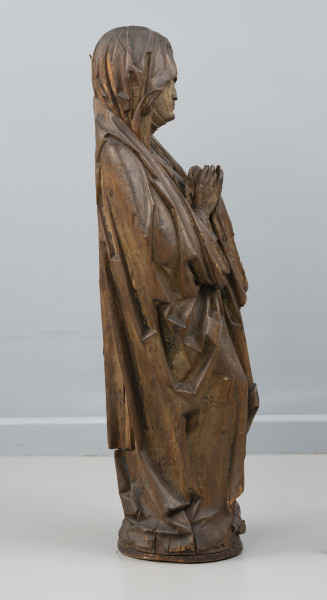 Thanks to the efforts of the Society for the History and Antiquities of Pomerania, this sculpture was transferred in 1883 from the church in Chociwel to the Szczecin collections, along with the Chociwel Passion, which included a similar figure of Our Lady of Sorrows (lost during World War II). The two almost identical spindle-shaped figures of Mary differed in several ways: the preserved sculpture is shorter, the detailing of the maforium (Mary’s veil) varies slightly, with the edges of the lost figure’s veil adorned with lace-like grooves, and the density of folds in the wimple around the neck also differs. Additionally, Mary in the lost Passion Group had a slightly more inclined head. Formal analogies clearly indicate that both figures of Our Lady of Sorrows were created within the same workshop, known as the Workshop of the Chociwel Passion Master. The preserved figure is considered a later workshop replica.