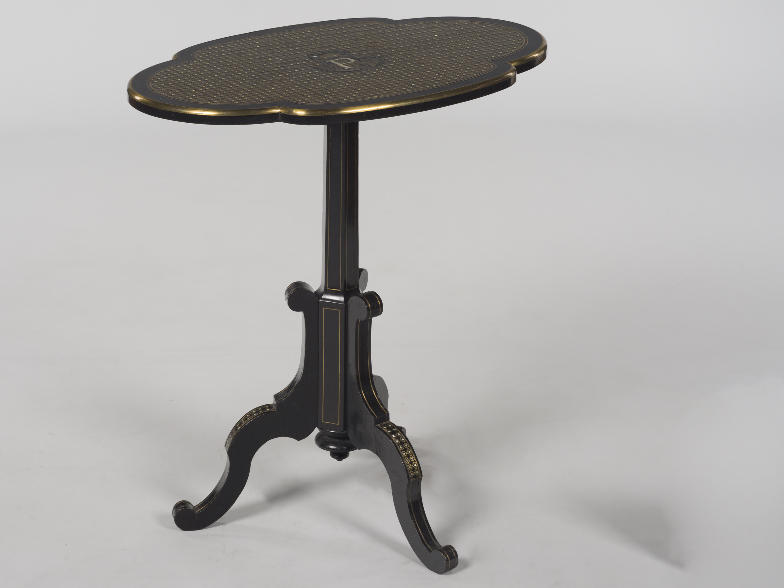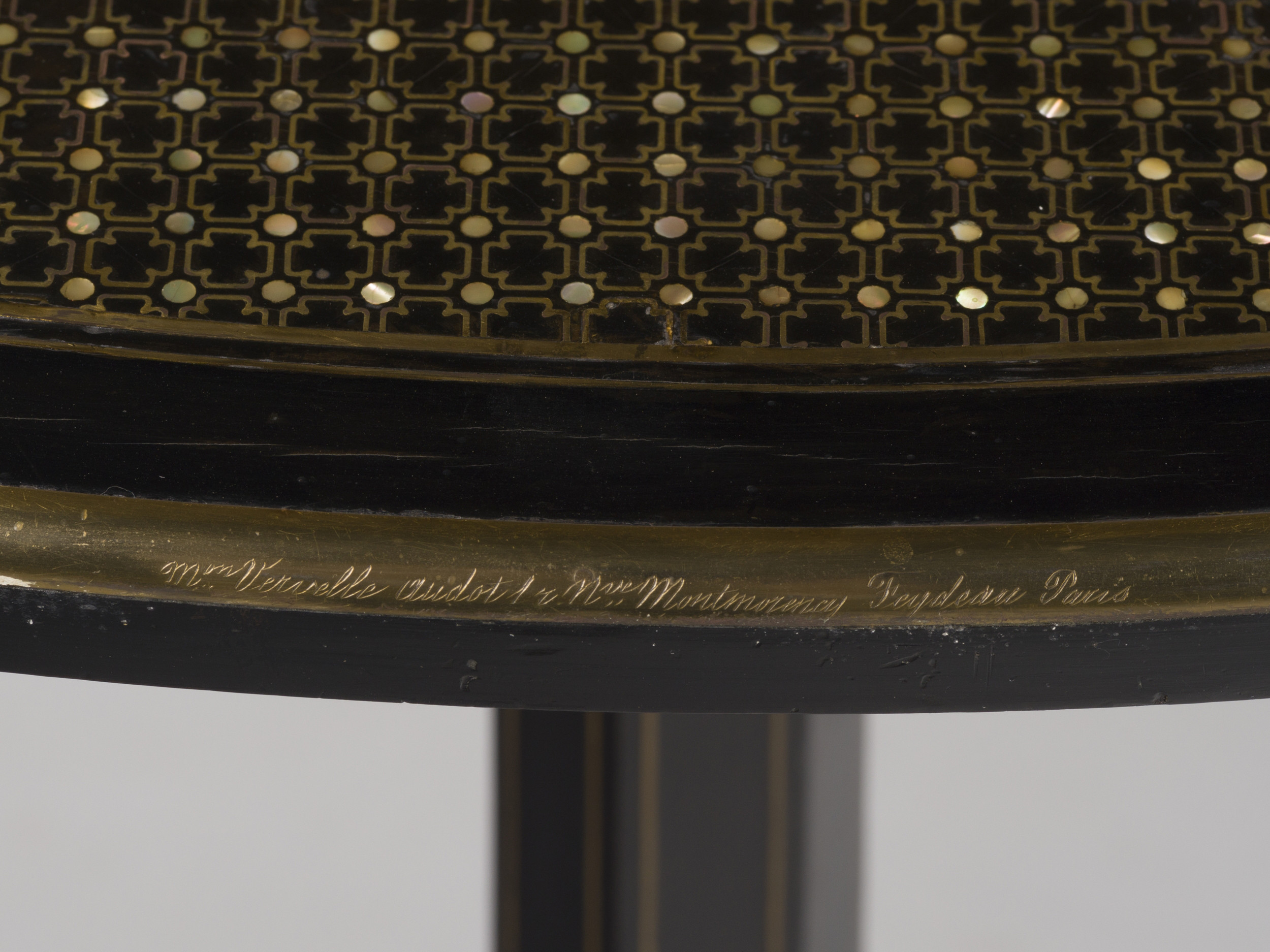 Niewielki stolik – gerydon z owalnym blatem o krawędziach lekko zbliżonych do kształtu koniczyny, wsparty na pojedynczej kolumnie przechodzącej w trójnóg jest meblem dedykowanym czyli wykonanym na zamówienie i oznaczony cechą właścicieli. Wykonany został w okresie, gdy dominującą tendencją estetyczną warsztatów europejskich był styl eklektyczny, w którym artyści stosowali w swych dziełach środki artystyczne, motywy, techniki będące osiągnięciami różnych epok i charakterystyczne dla różnych kultur. Dekoracja stolika, jaką stanowi inkrustacja metalem i masą perłową na czarnym tle, nawiązuje do złotej epoki rozwoju ebenistyki, do barokowych mebli hebanowych zdobionych markieterią. Czarna, gładka powierzchnia stolika o szlachetnym połysku została w partii blatu i nóżek pokryta markieterią z drobnych elementów mosiężnych w kształcie łączących się ramionami krzyżyków tworząc ozdobną kratkę. Drobne, okrągłe elementy z macy perłowej akcentują miejsca pomiędzy nimi. Światło padające na masę perłową błyszczący złotem mosiądz daje roziskrzony tęczowy efekt na powierzchnia blatu. W jego centrum umieszczony został wycięty z mosiądzu i rytowany, wiązany monogram liter AAP pod hrabiowską, dziewięciopałkową koroną – Aleksandra i August Potoccy lub Aleksandra, Augustowa Potocka.