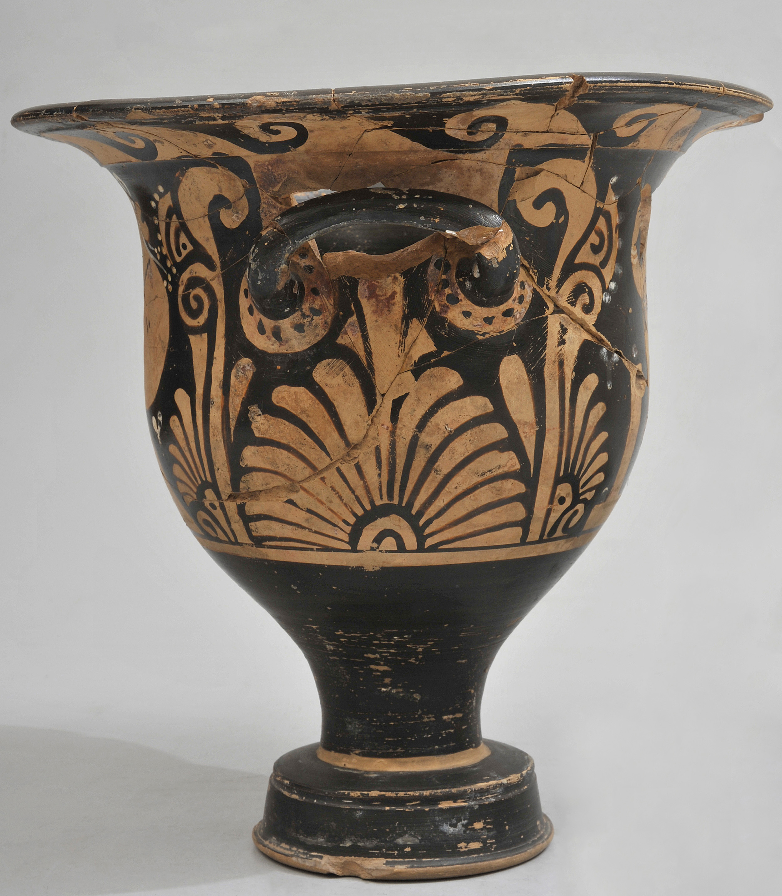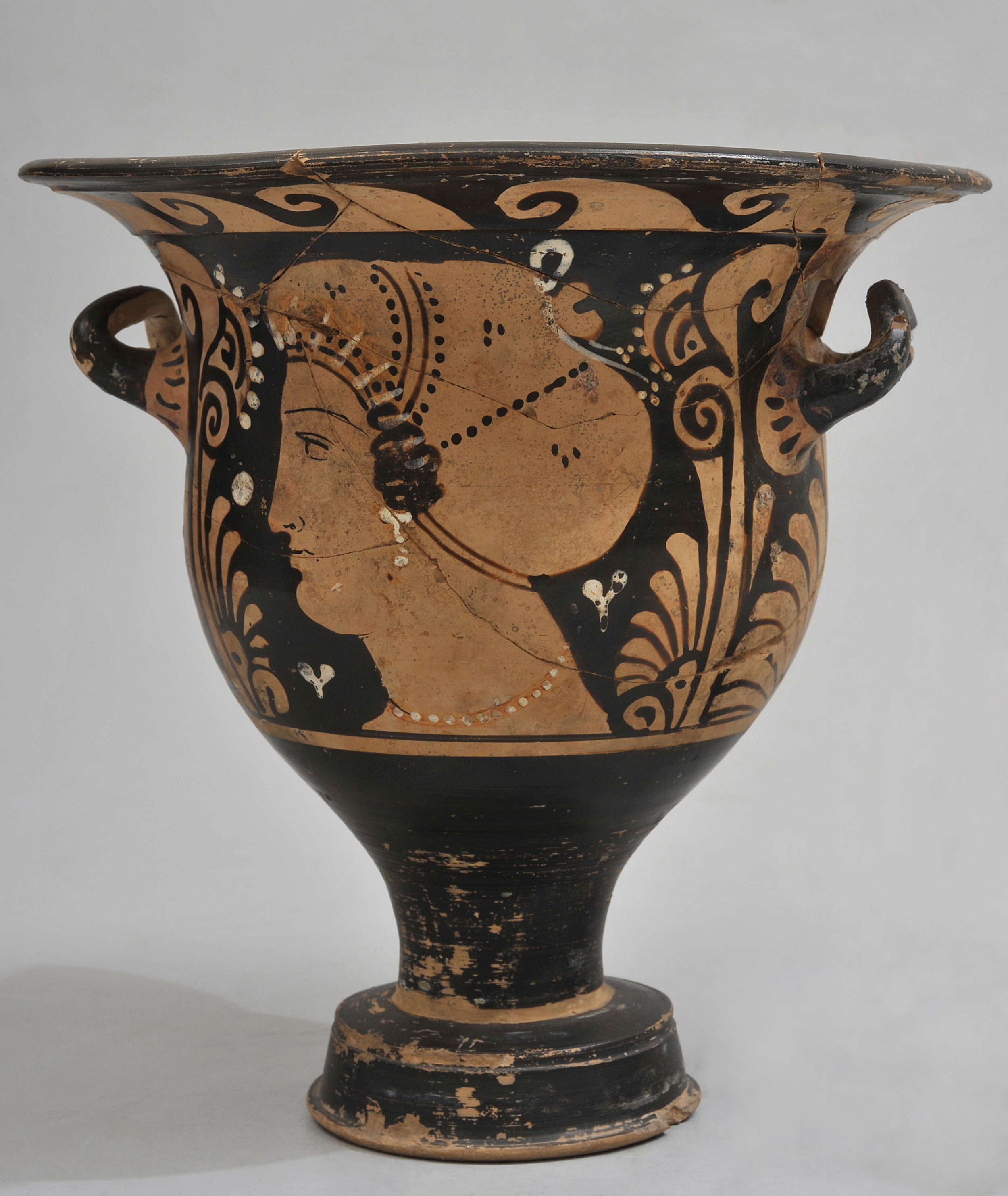 Starożytni Grecy pili wino zmieszane z wodą, a zwyczaj ten wymagał stworzenia odpowiednich naczyń do łączenia obu płynów – kraterów. Za względu na ich rozpowszechnienie istnieje bardzo wiele wariantów tej formy. Są to jednak zawsze pojemniki głębokie, o szerokim wylewie (co ułatwiało korzystanie z nich) zwykle na niskiej stopce, z dwoma uchwytami (zwanymi imadłami). Ze względu na ich charakterystyczne kształty wyróżnia się kilka typów kraterów, takich jak: kolumienkowy, wolutowy, kielichowy czy dzwonowaty. Zabytek wilanowski należy do tego ostatniego – najprostszego, a także wykształconego najpóźniej, a jednocześnie najbardziej popularnego na terenach Południowych Włoch, gdzie najprawdopodobniej powstał. Powierzchnię naczynia zdobią przedstawienia namalowane w technice czerwonofigurowej. Po jednej stronie oglądać możemy kobietę stojąca najprawdopodobniej przed prostym ołtarzykiem. Postać ubrana jest w długi chiton i nosi zdobiące ją bransolety, a także kekryfalos (rodzaj nakrycia głowy popularnego w starożytności), w lewej ręce trzyma niewielki wianek. Po stronie drugiej namalowano głowę kobiecą w lewym profilu. Ta postać również ma na sobie kekryfalos, a także diadem i korale, malowane bielą. Tę dekorację figuralną uzupełniają popularne w ceramice greckiej motywy ornamentalne: palmety pod uchwytami, ornament fali poniżej wylewu.