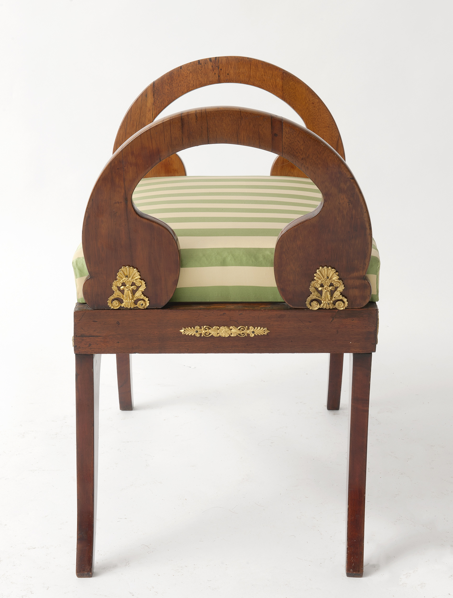 Gondolka o prostokątnym płaskim siedzisku, na czterech zbieżnych, szablasto wygiętych na boki, płaskich nóżkach. Niskie, proste, gładkie oskrzynienie ozdobione zostało plakietkami z metalu złoconego – pośrodku jednego z dłuższych boków w formie liry z liśćmi akantu, na osi nóg w formie palmet wspartych na parach wolutowo zwiniętych wici, pośrodku drugiego boku z motywem pary związanych rogów obfitości a na osi nóg wieńców ze skrzyżowanymi strzałami, a pośrodku krótszych boków z pasami osiowej dekoracji roślinnej. Na bokach cargi wsparte zostały półkoliste, lekko rozchylone płasko wykrojone poręcze z wachlarzowatym wycięciem wewnątrz, u nasady od strony zewnętrznej ozdobione parami plakietek z motywem muszli z festonem wspartej na zwojach akantowych. Siedzisko jest tapicerowane i zostało obite atłasem w zielone i seledynowe pasy.