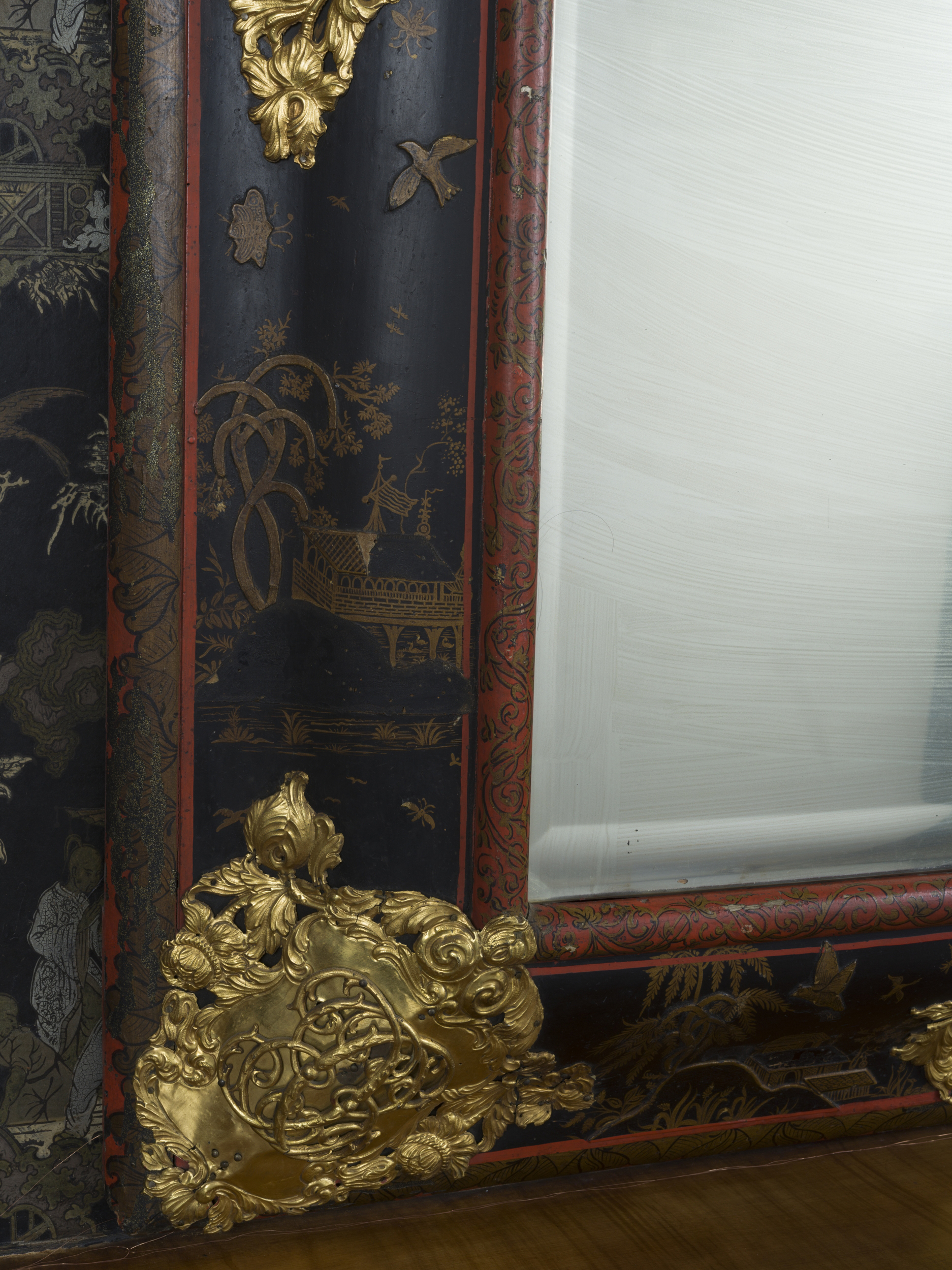Lustro prostokątne w szerokiej drewnianej ramie. Posiada taflę szklaną o fazowanych krawędziach i zdegradowanej podlewie, co daje efekt nieodwracalnego zamglenia. Rama o profilu wypukłym, złożonym w kierunku od tafli z półwałka, szerokiej odwróconej simy oraz ćwierćwałka przy zewnętrznej krawędzi. Pokryta została dekoracją w technice laki europejskiej, w partii środkowej czarną, o motywach złotych orientalizujących pejzaży, ptaków i owadów częściowo na wypukłym podkładzie. Krawędzie wewnętrzne i zewnętrzne obwiedzione wąską bordiurą na czerwonym tle, z motywami roślinnymi w kolorze złotym, o czarnych konturach. W narożach ramy oraz pośrodku ramiaków umieszczono osiem metalowych, złoconych plakiet w formie fantazyjnych roślinnych kartuszy, wypełnionych lustrzanymi monogramami wiązanymi CB.