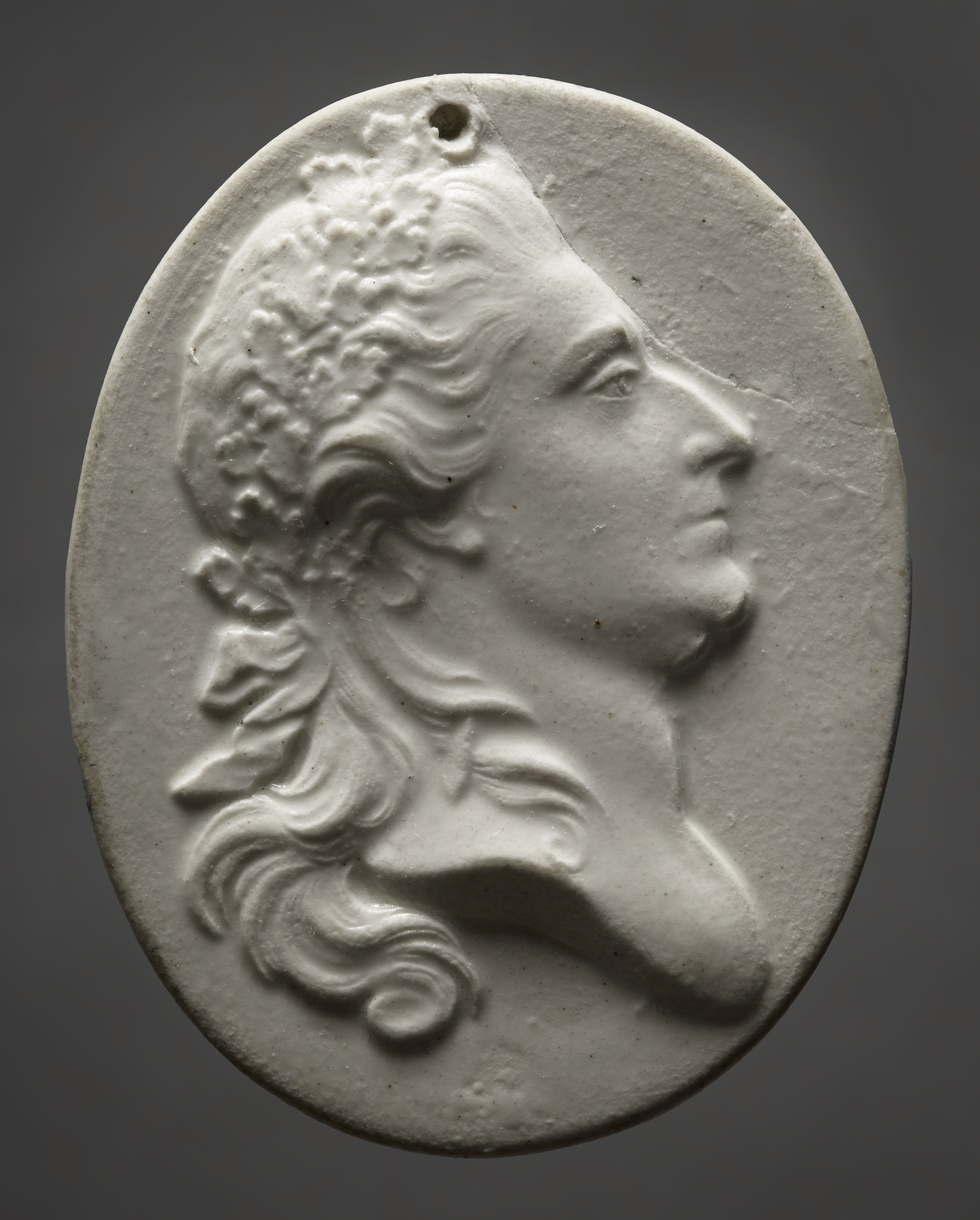Owalny medalion z reliefowym przedstawieniem głowy króla w prawym profilu i wieńcu dębowym na głowie. Portretowany ukazany jest w młodym wieku, w manierze antykizującej. Głowę króla okalają gęste pukle włosów, spadające lokami (cadenettes) na boki i upięte z tyłu kokardą.
