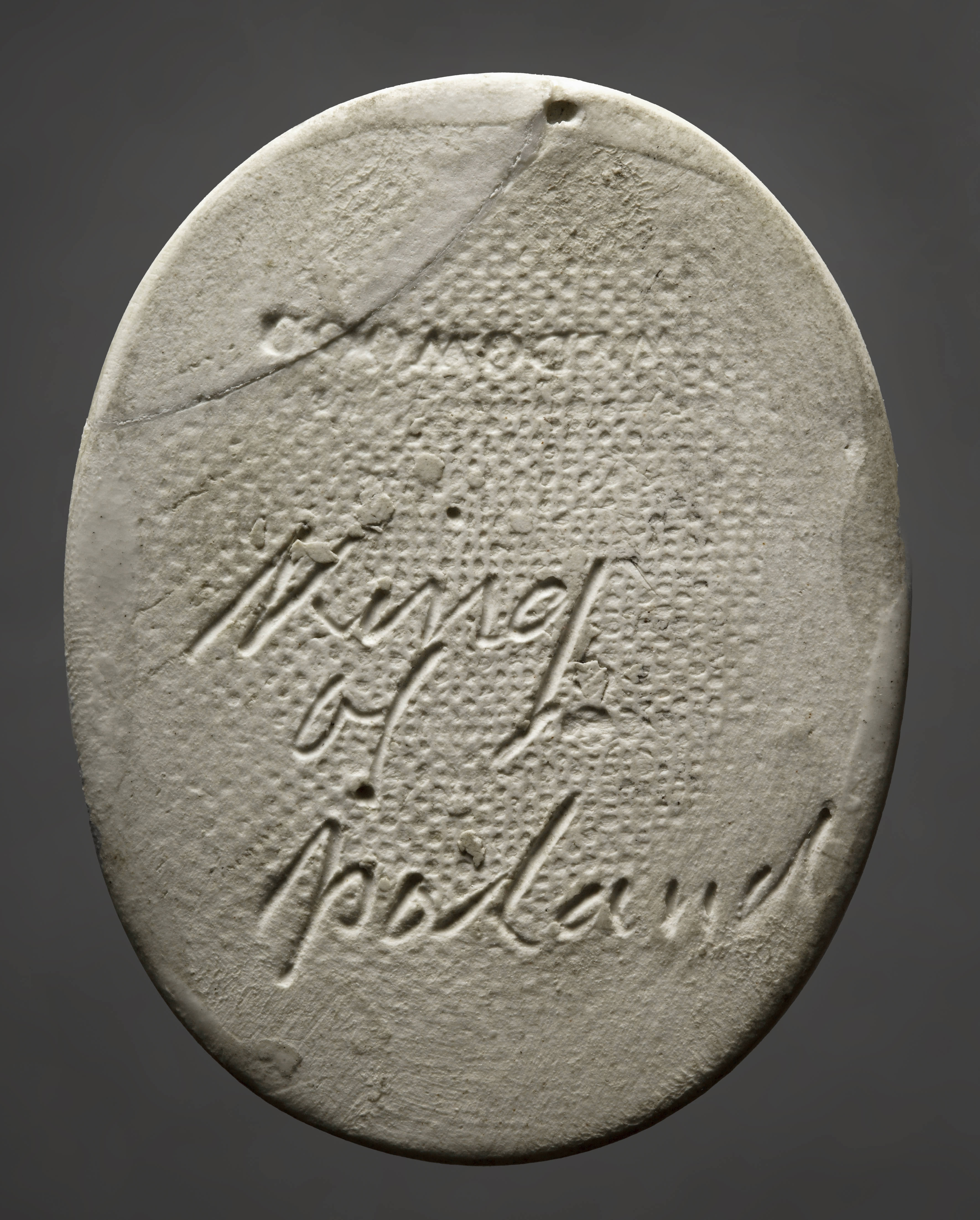 Rewers z odciśniętym wątkiem tkaniny i zaciekami szkliwa oraz marką zakładu i imieniem portretowanego.