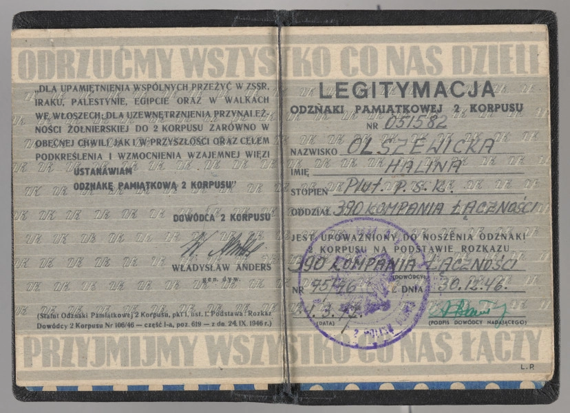 Legitymacja potwierdzająca nadanie Halinie Olszewickiej odznaki pamiątkowej 2 Korpusu Polskiego. Halina służyła w 390 Kompanii Łączności w stopniu plutonowego PSZ. Nr dokumentu 05/582. Po lewej stronie podpis Władysława Andersa. Po prawej pieczątka 2 Korpusu Polskiego. Na okładce widnieje odznaka 2 Korpusu Polskiego i napis: Italia 1946. Pieczątka: ,,[...] 2 POLISH CORPS".