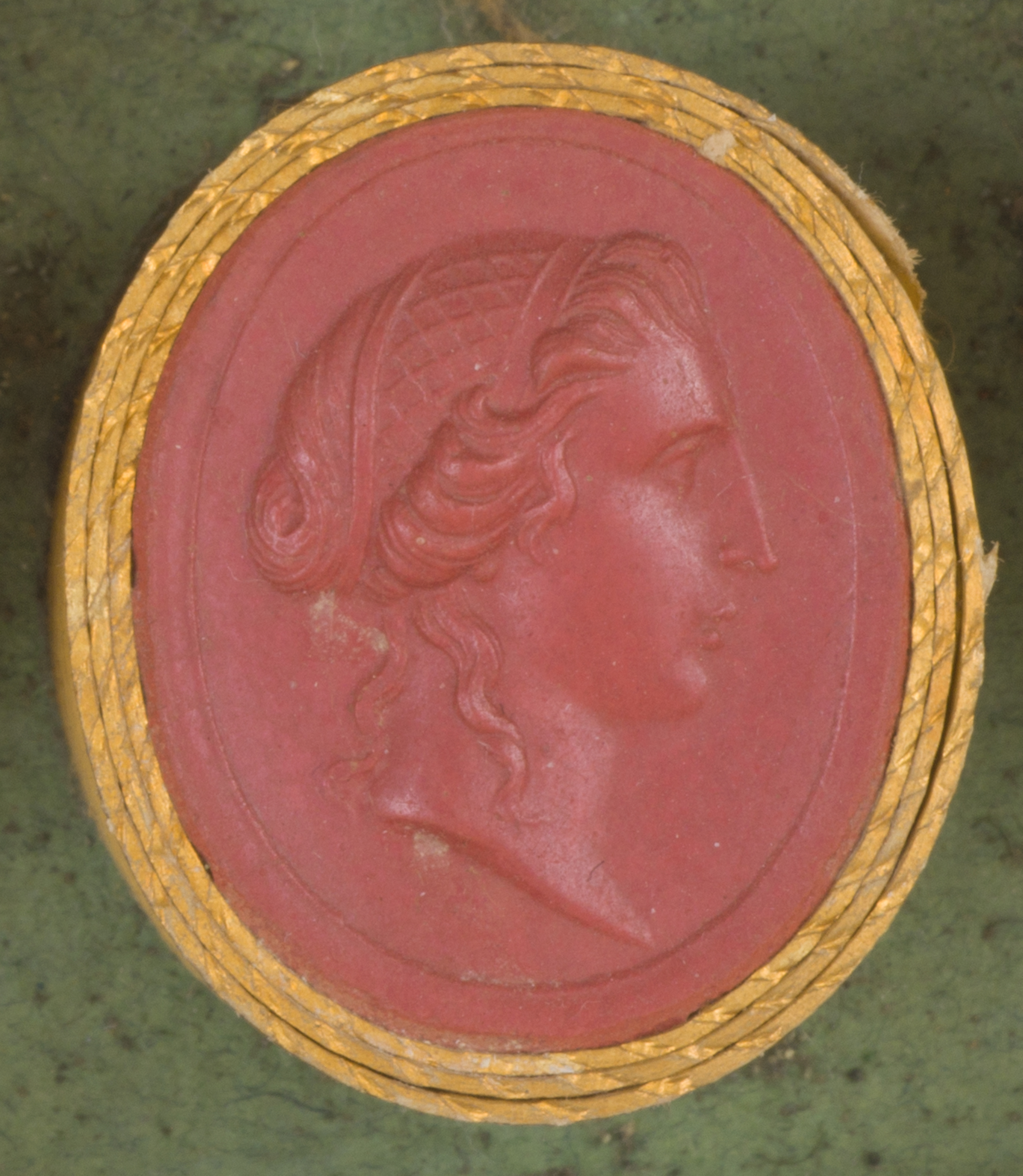 Zaprezentowany obiekt to wypukły, owalny wycisk na płaskim tle. Wyobrażony na nim został prawy profil kobiecej głowy z długimi upiętymi włosami, z których na kark opadają dwa kosmyki.