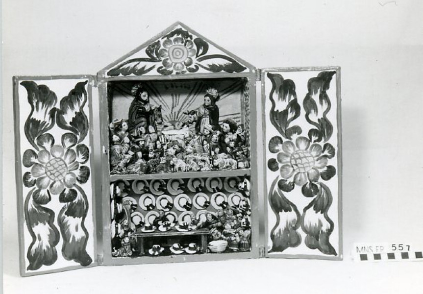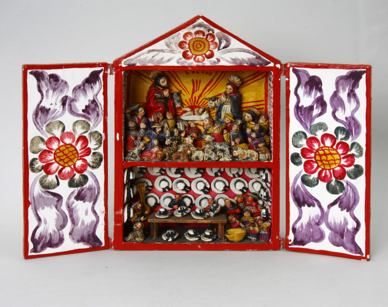 W latach 40. i 50. XX wieku retablos stały się cenionymi dziełami artystycznymi. Ich styl znacząco się zmienił. Niektóre poddano miniaturyzacji, inne rozbudowano, dokładając dodatkowych pięter (pojawiły się mające metr wysokości aranżacje pięciopiętrowe). Obecnie artyści sami decydują jakimi scenami wypełnią dany poziom. Tradycyjnie górne piętro pozostawiano dla postaci religijnych, a dolne na przedstawienie życia ziemskiego: żniw, procesji, domów, sklepów, fiest czy korrid. W prezentowanym egzemplarzu oprócz narodzenia Dzieciątka Jezus ukazano również sprzedawcę kapeluszy w otoczeniu klientów i muzykantów, kompozycyjnie nawiązując tym do sceny religijnej powyżej. Figurki zrobiono z masy z gotowanych ziemniaków i proszku gipsowego, tradycyjnego medium, wykorzystywanego również przez najsłynniejszego dziś retablistę wykształconego akademicko artystę, uczącego się rzemiosła także od ojca i dziadka – Nicario Jiménez Quispe (1957– ), znanego z przejmujących scen ukazujących los latynoskich imigrantów.