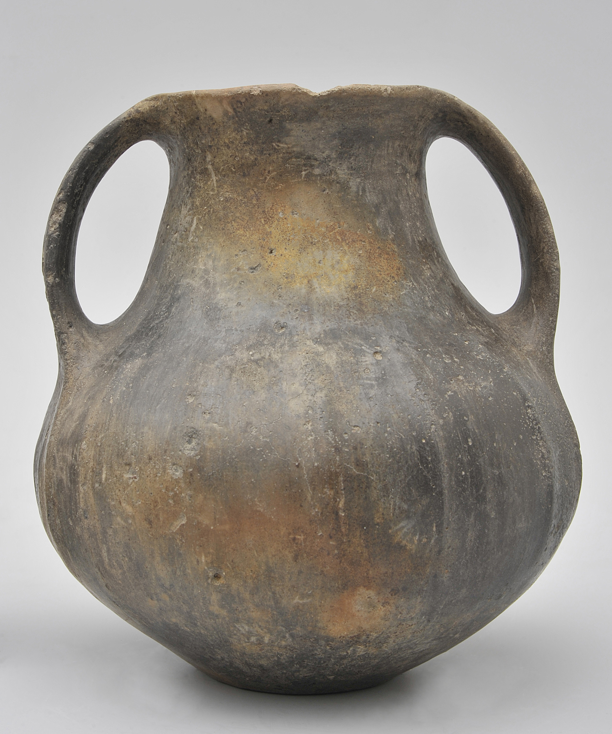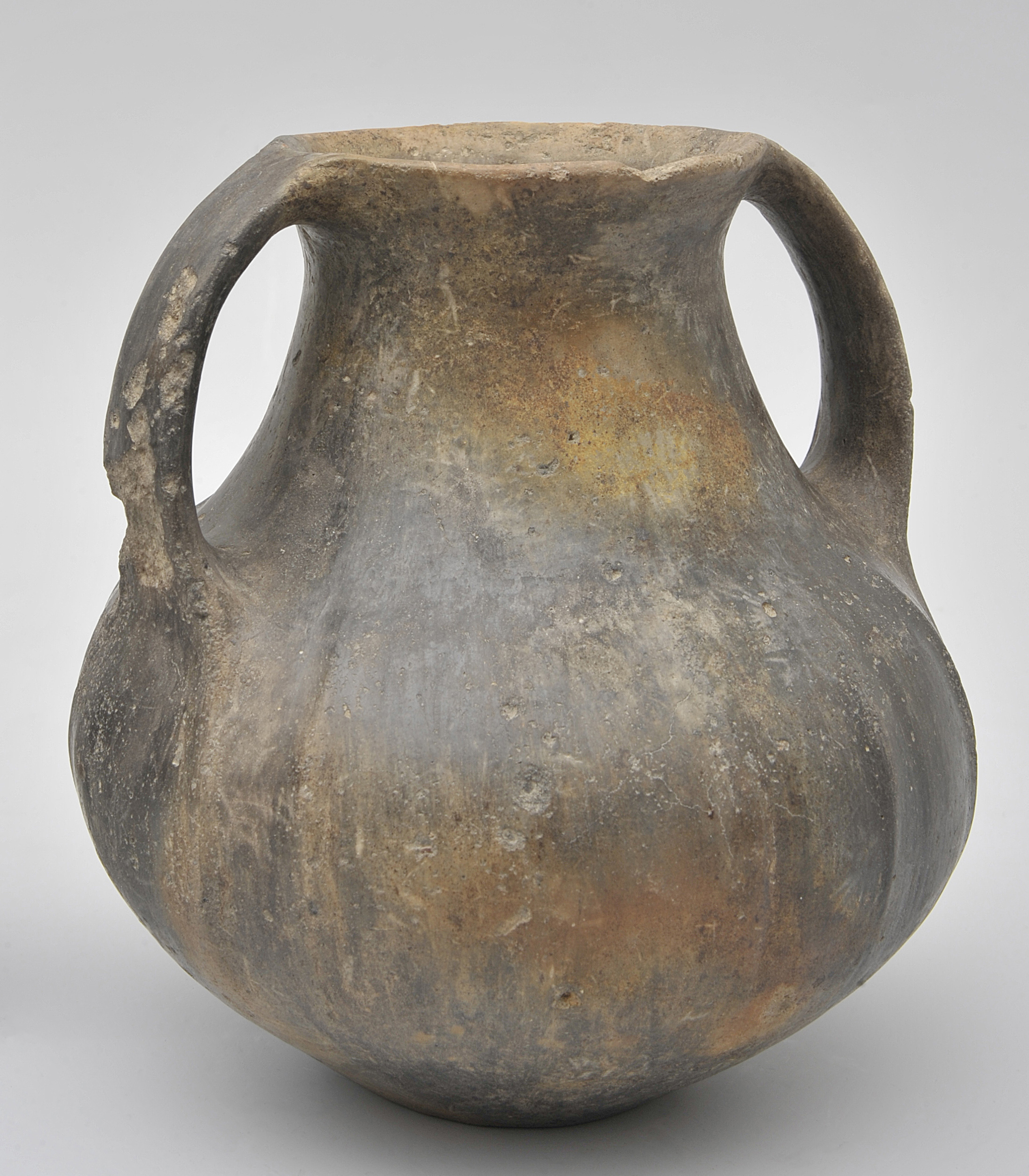 Brzuchata amforka o stożkowo zwężającej się ku wylewowi szyjce. Jej brzusiec ozdobiono pionowymi, równoległymi, lekko wypukłymi pasami. Po obu stronach wylewu doklejono uchwyty. Naczynie wykonano gliny o słabej jakości, niezbyt dobrze oczyszczonej. Kolor powierzchni o lekkim połysku nie jest jednolity, są to odcienie od ciemnobrunatnego do czarnego.