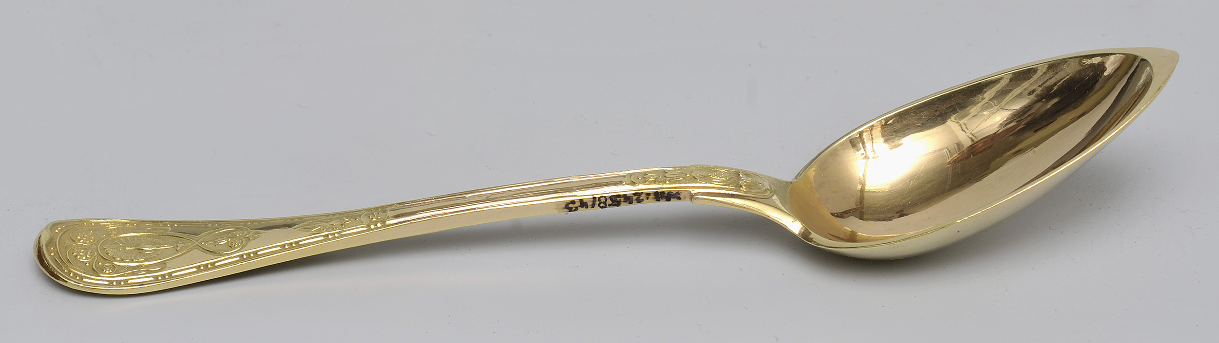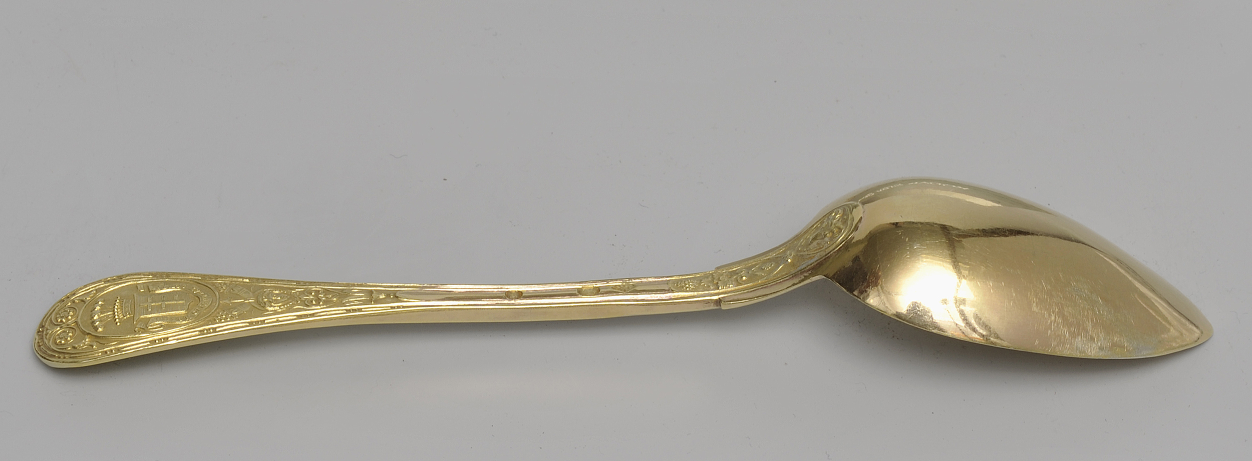 Łyżka deserowa o wydłużonym owalnym czerpaku jest jedną z siedemdziesięciu dwóch łyżek zachowanych w wilanowskiej kolekcji.
