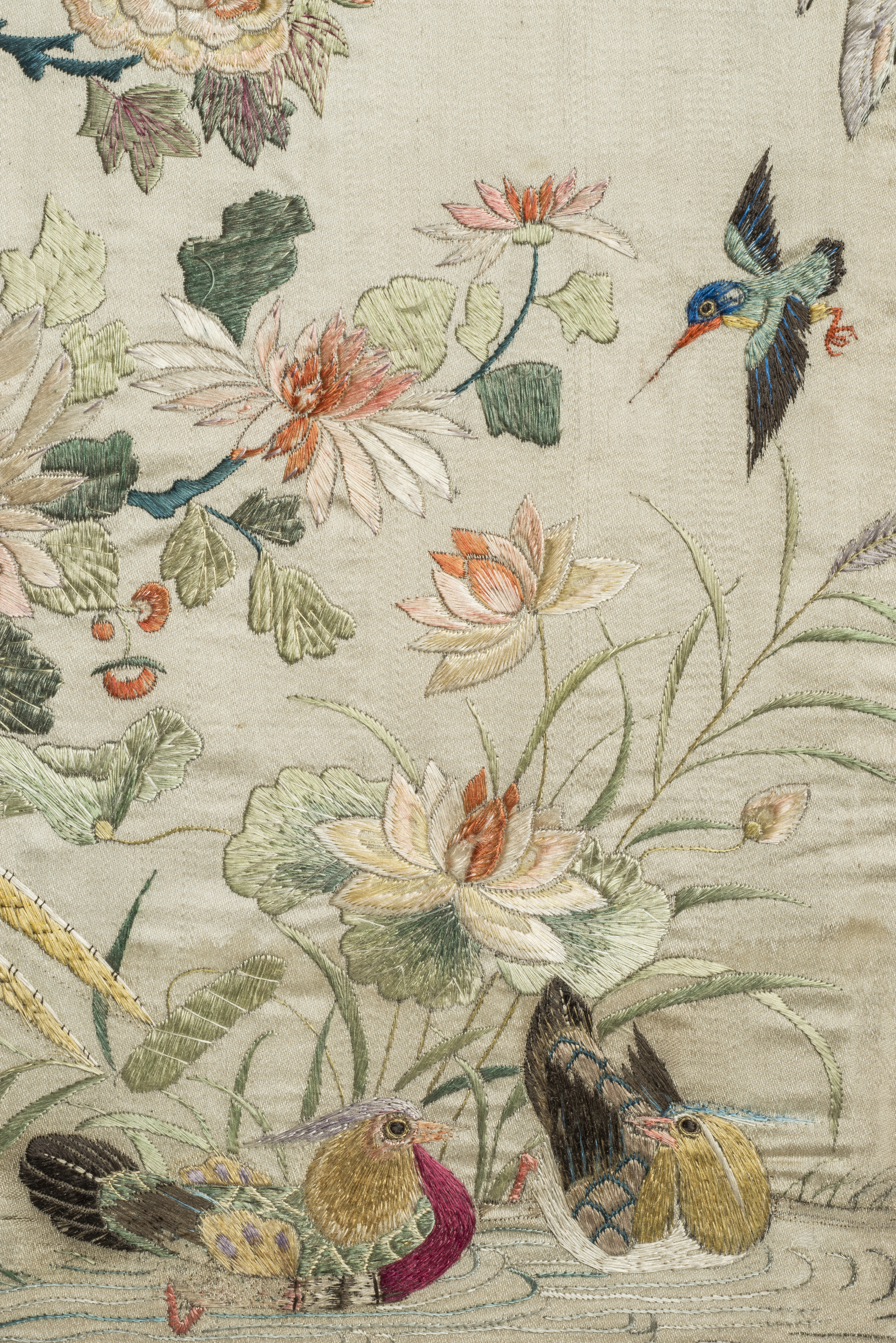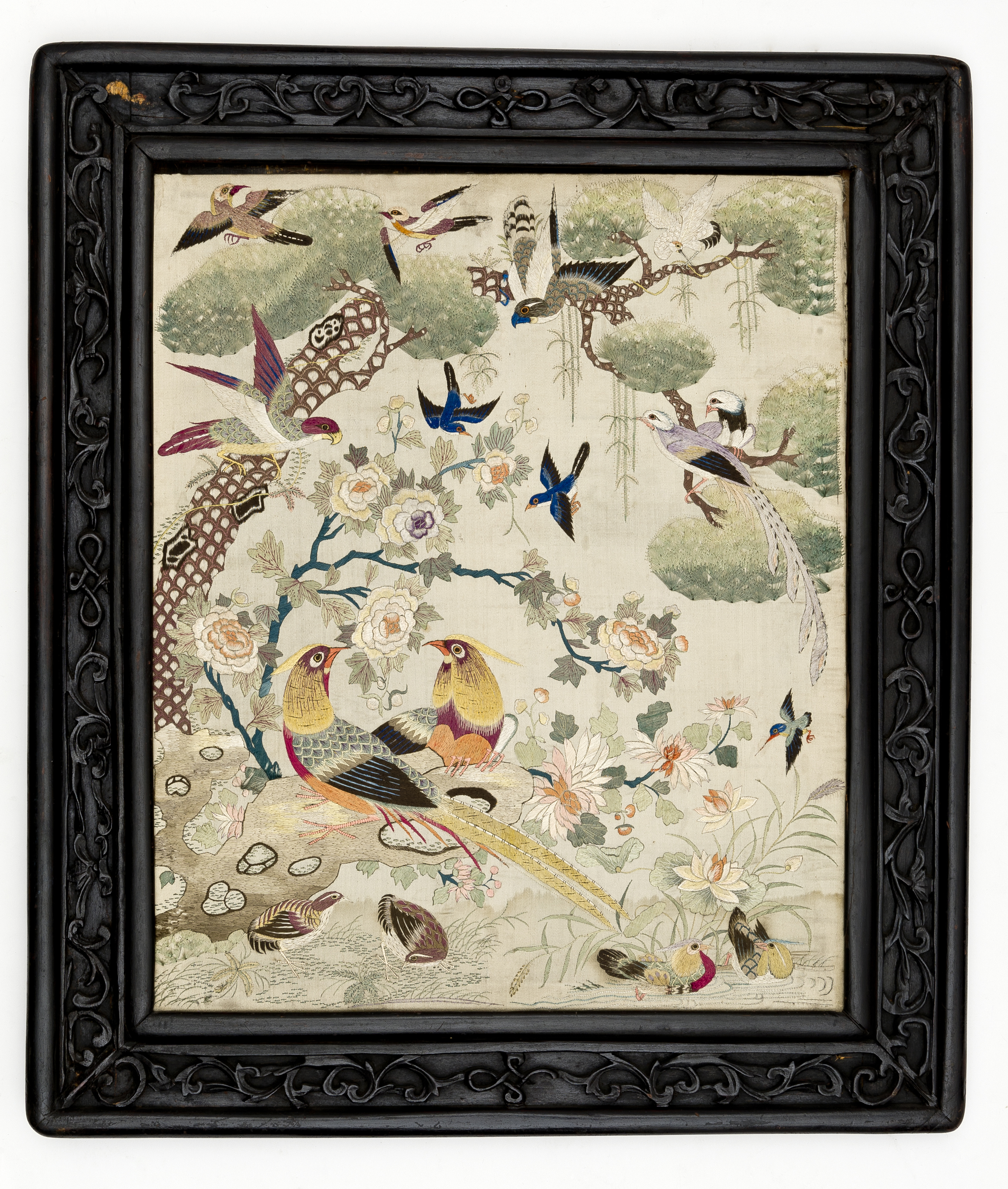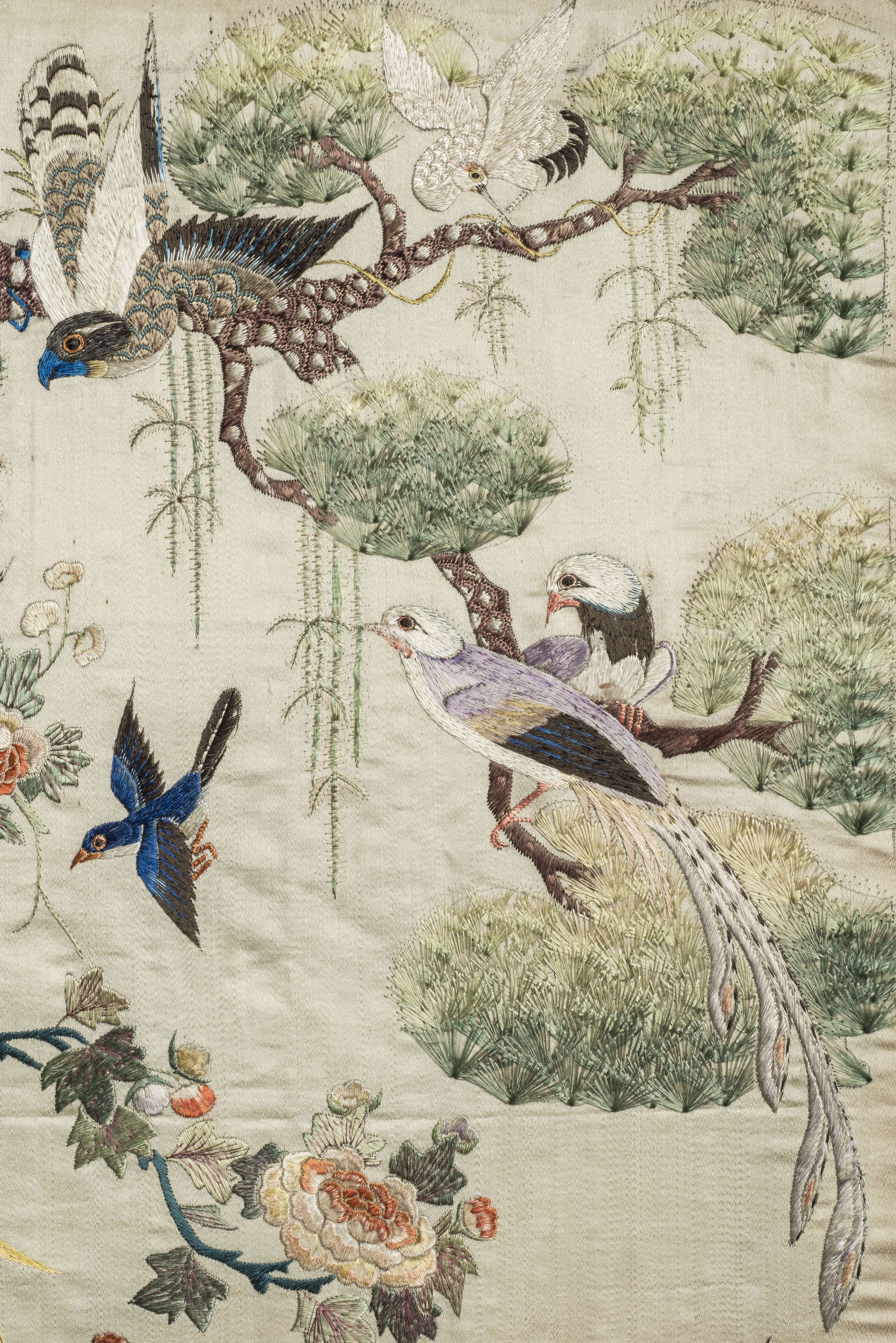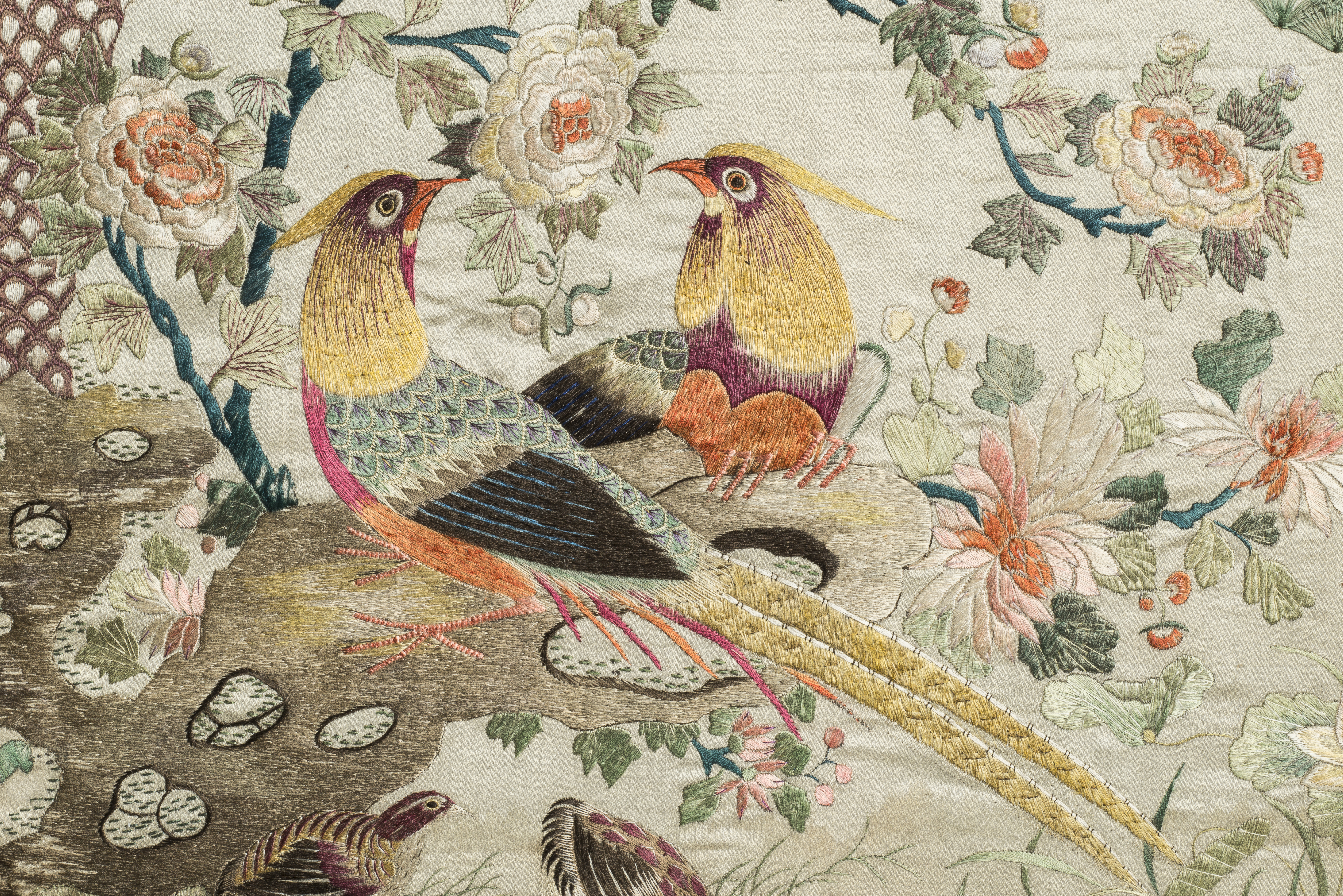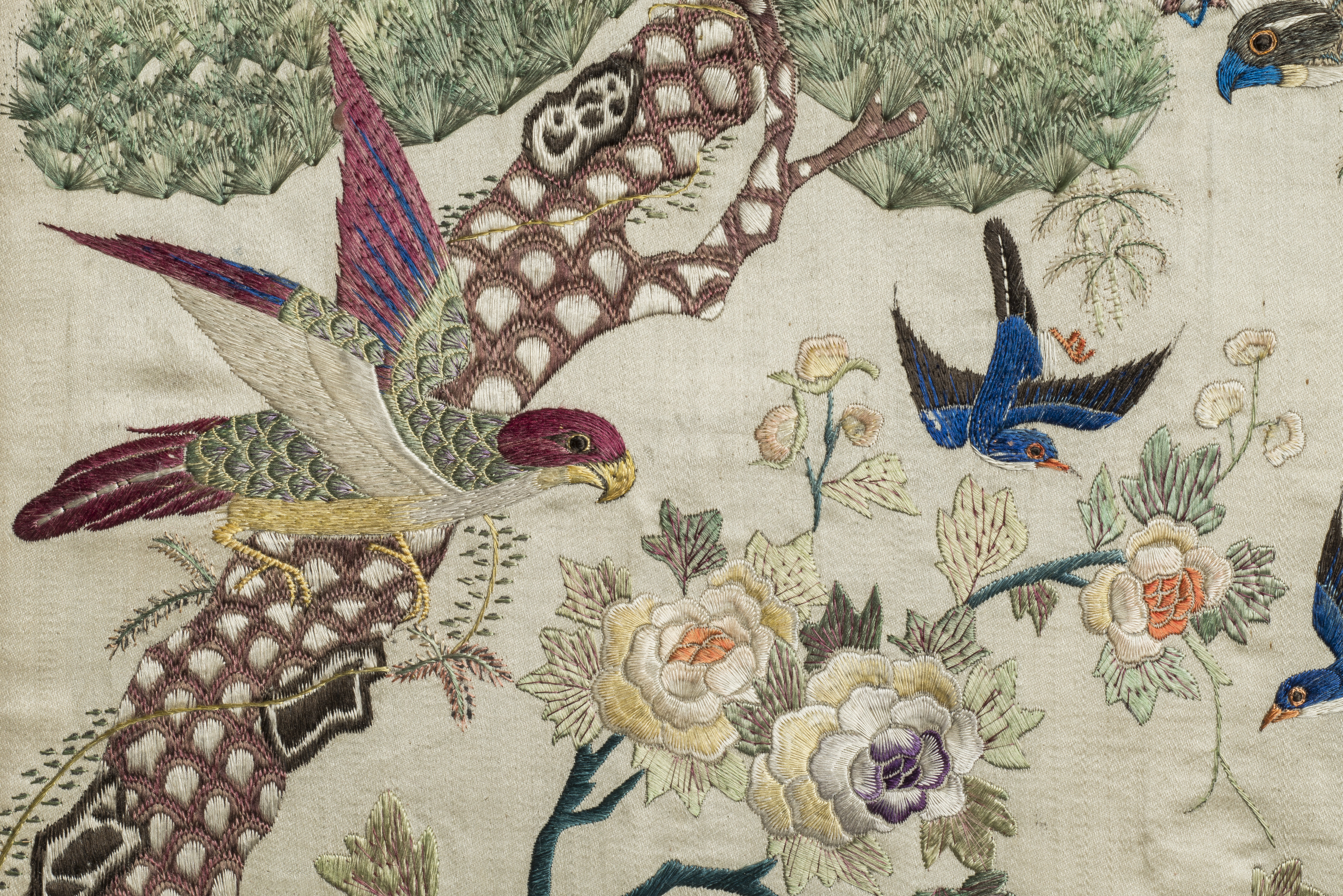 Płyta obciągnięta haftowanym jedwabiem w ramie, wsuwana w rzeźbiony stelaż, przedstawia 16 różnych rodzajów ptaków, fruwających, spacerujących po łące, siedzących na skałach lub gałęziach drzew, pływających po wodzie. To ptasie zgromadzenie odbywa się w stylizowanym krajobrazie z sosną, kwitnącymi krzewami peonii, lotosami, chryzantemami i trawą. Wśród ptaków można rozpoznać kaczki mandaryńskie, przepiórki, bażanty, zimorodka, żurawia i wiele innych. Królestwo ptaków tonące w bujnej roślinności i kwiatach to symboliczny obraz baśniowego raju i hołd złożony pięknu natury. Przy użyciu rozmaitych technik potrafiono precyzyjnie i wiernie oddać wygląd ptaków roślin, układając je w zachwycającą barwnością i różnorodnością kompozycję. Tkanina ta jest typowym przykładem haftu kantońskiego, charakteryzującego się mistrzostwem technicznym dbałością o realistyczne odtwarzanie form zaczerpniętych ze świata przyrody. Kanton słynął z warsztatów hafciarskich, w których powstawały prace uważane za najpiękniejsze w kraju. Technika haftu kantońskiego wywodziła się z miejscowej tradycji mniejszości etnicznych, w połowie epoki Ming przerodziła się w oryginalny styl, charakteryzujący się gęstym zapełnieniem całej powierzchni drobnym, precyzyjnym haftem, który tworzył rozbudowane kompozycje ukazujące stylizowane motywy pejzażowe, florę i faunę, nie pozostawiając praktycznie pustego tła. W epoce Qing te wspaniałe haftowane tkaniny wysyłano na cesarski dwór.