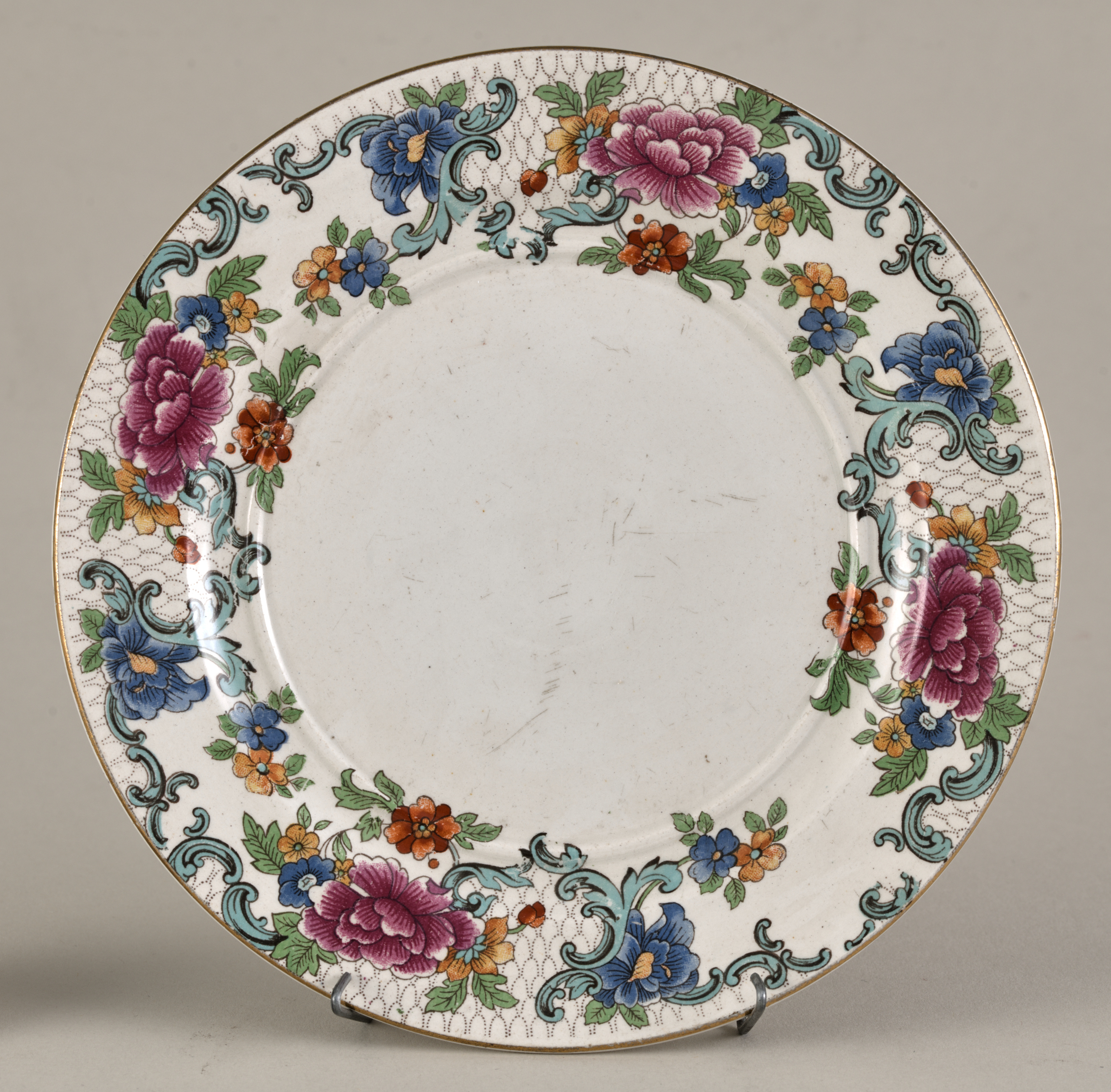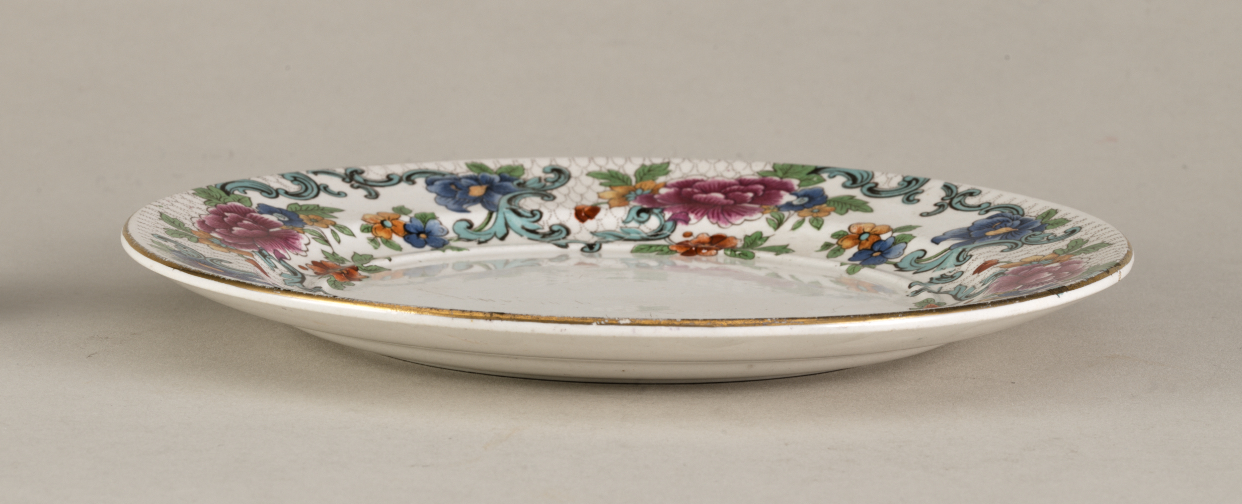 Mały, płytki talerzyk wykonany z białego fajansu. Stanowi podstawkę pod sosjerkę. Zdobiony wielobarwną kalkomanią, złożoną z czterech jednakowych, asymetrycznych kompozycji roślinnych, nawiązujących do sztuki rokoko lub dalekowschodniej. Dekoracja jest złożona z elementów w kolorze morskiej zieleni, pośród której wplatają się dwie duże piwonie w kolorze różowym. Dookoła żółte i niebieskie kwiaty z liśćmi w kolorze jasnej zieleni. Pomiędzy kwiatami a brzegiem naczynia delikatny wzór siatki z wydłużonymi oczkami, zaznaczony drobnymi brązowymi kropeczkami. Brzeg talerzyka obwiedziony złotą lamówką.