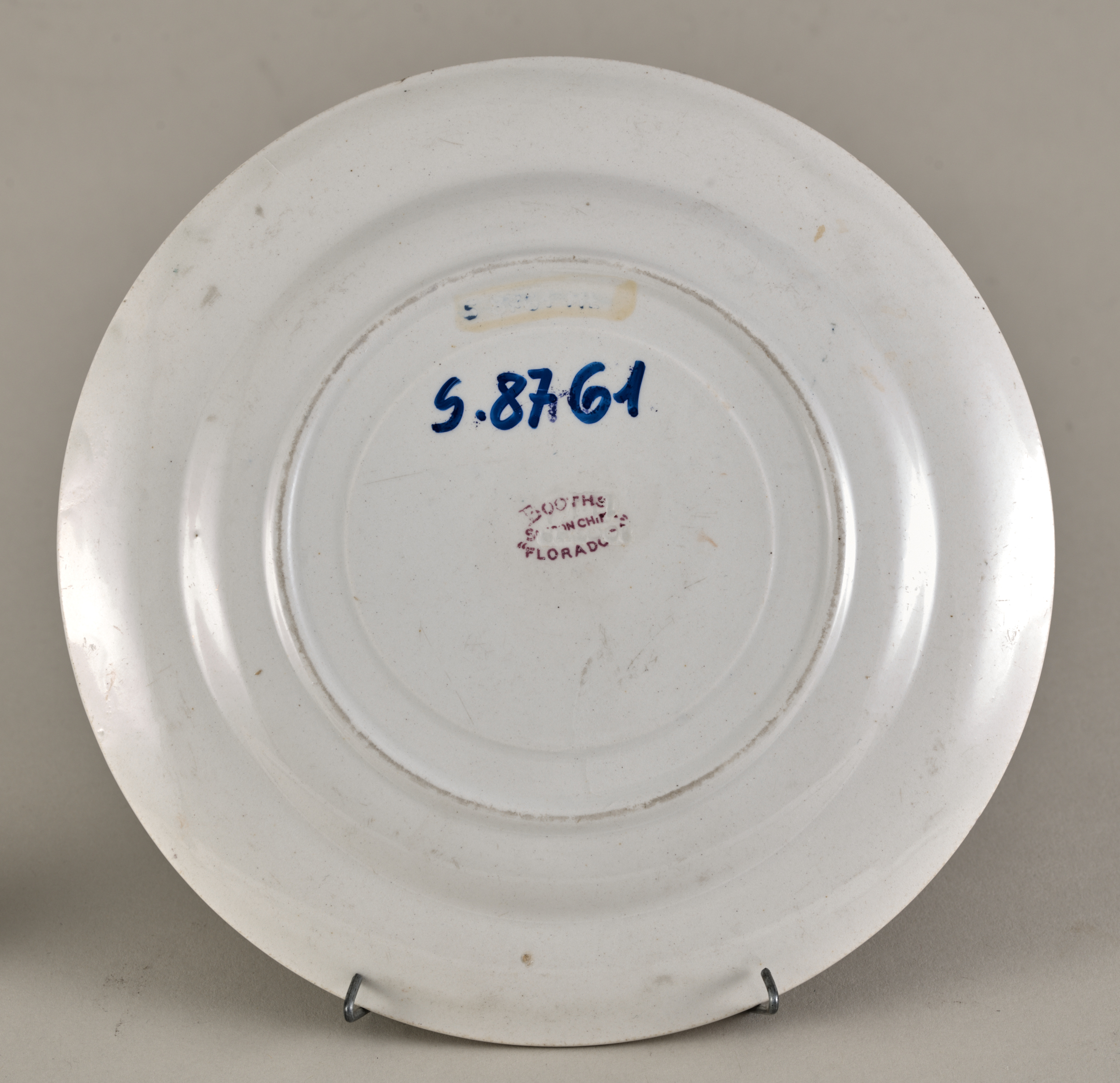 Rewers talerzyka posiada płaską podstawkę, a na jej środku widnieje stemplowana w masie sygnatura producenta „BOOTHS” (dalsza część odcisku - nieczytelna) na nią nałożono stempel w kolorze bordowego karminu: „BOOTHS/SILICON CHINA/”FLORADORA”. Szkliwo cienkowarstwowe, przejrzyste, pozbawione spękań.
