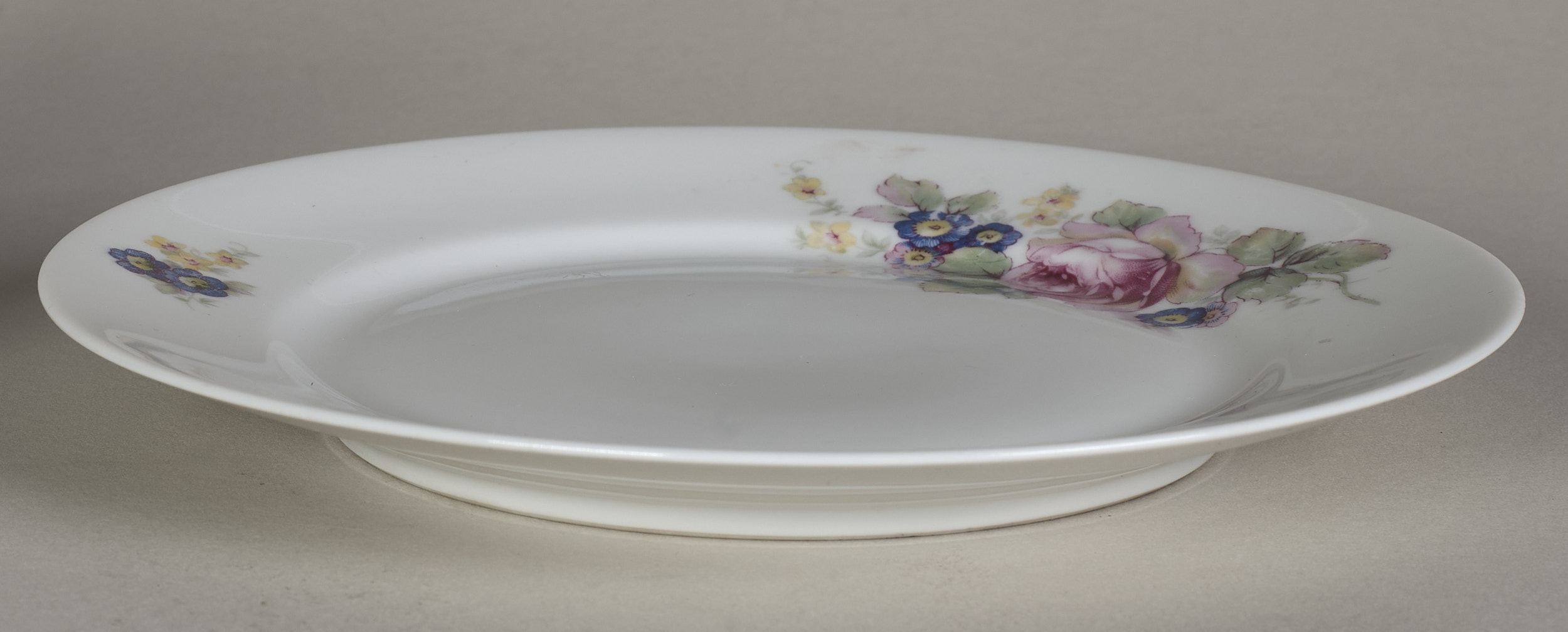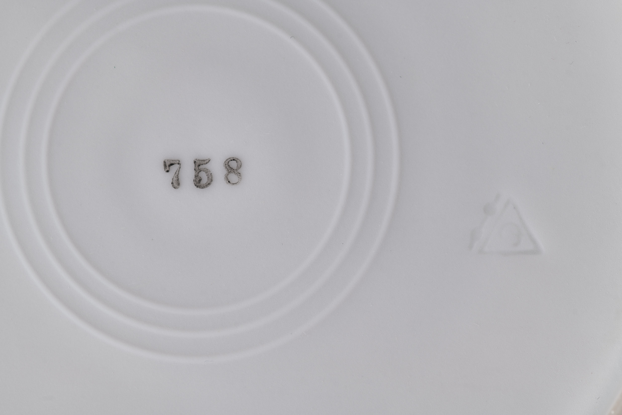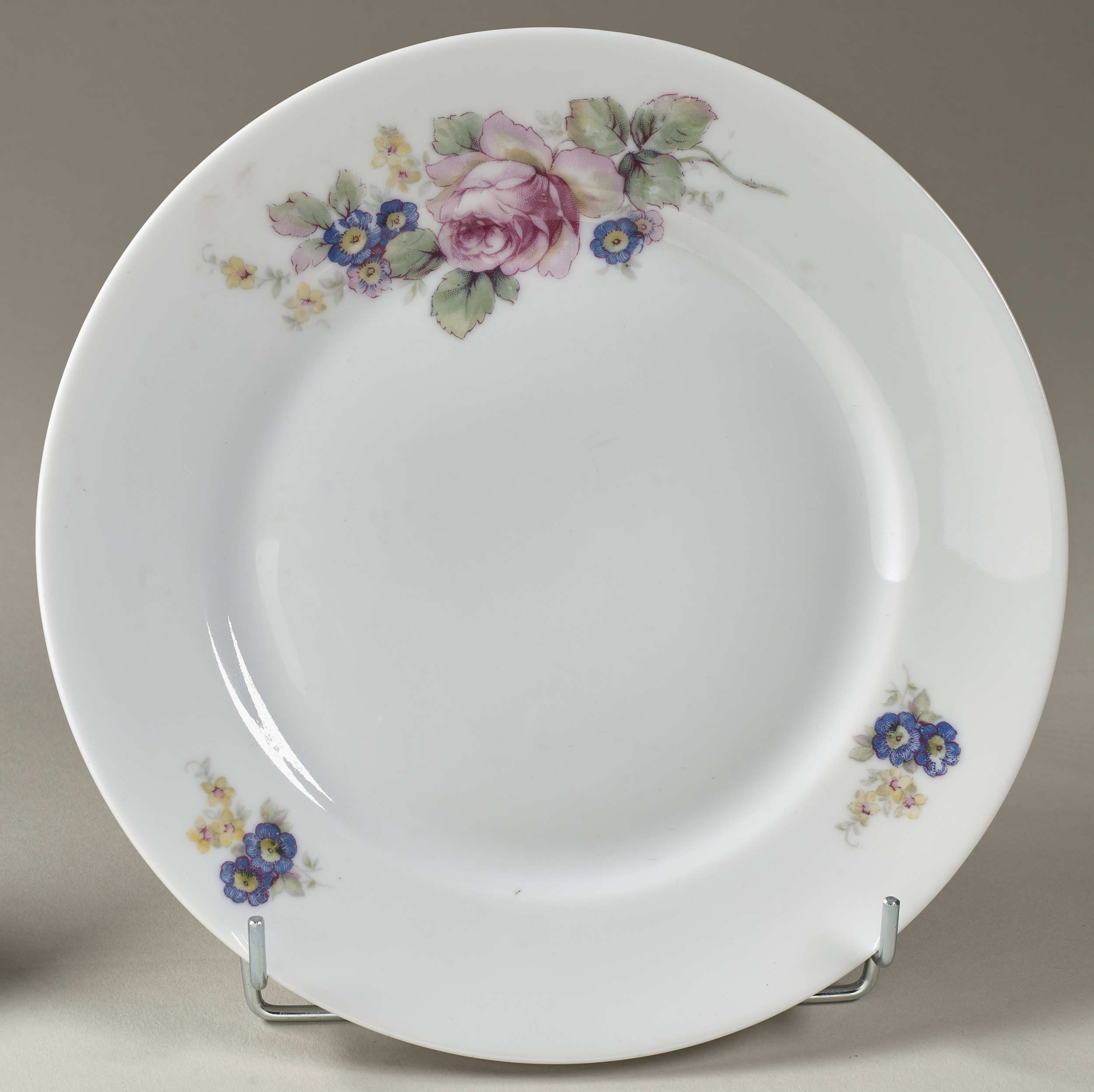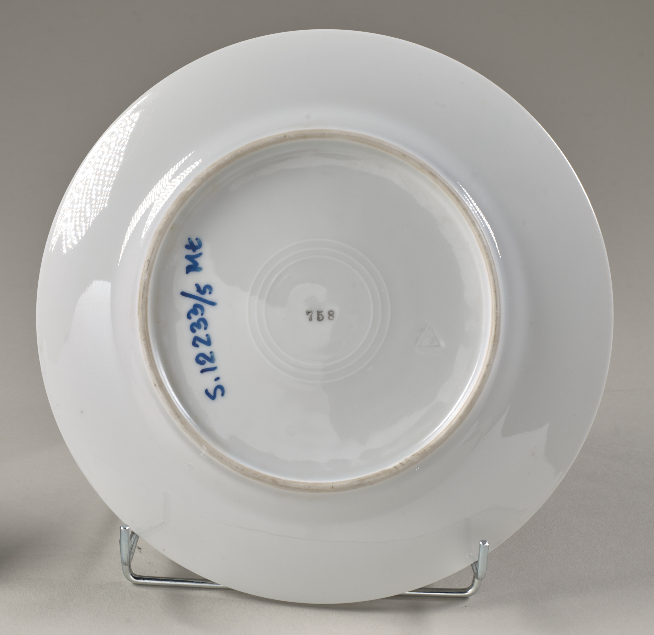 Biały talerzyk deserowy ozdobiony jest trzema, równomiernie rozłożonymi bukietami. Jeden, większy, znajduje się na przełomie lustra i wyniesionego kołnierza. Składa się z różowej róży, niebieskich niezapominajek i drobniejszych, żółtych kwiatuszków. Dwa pozostałe są znacznie mniejsze i  składają się z samych niezapominajek i żółtych kwiatuszków. Od spodu widoczne znaki fabryczne: C w trójkącie oraz stempel: 758 i numer inwentarzowy.