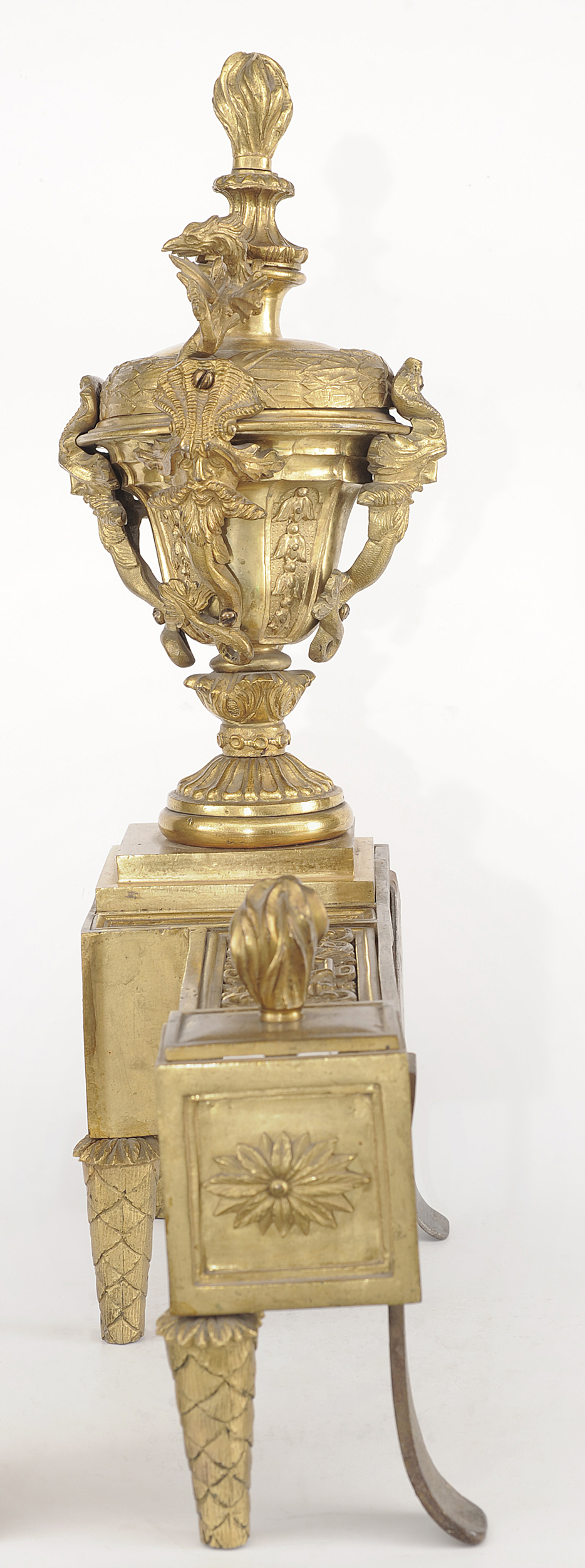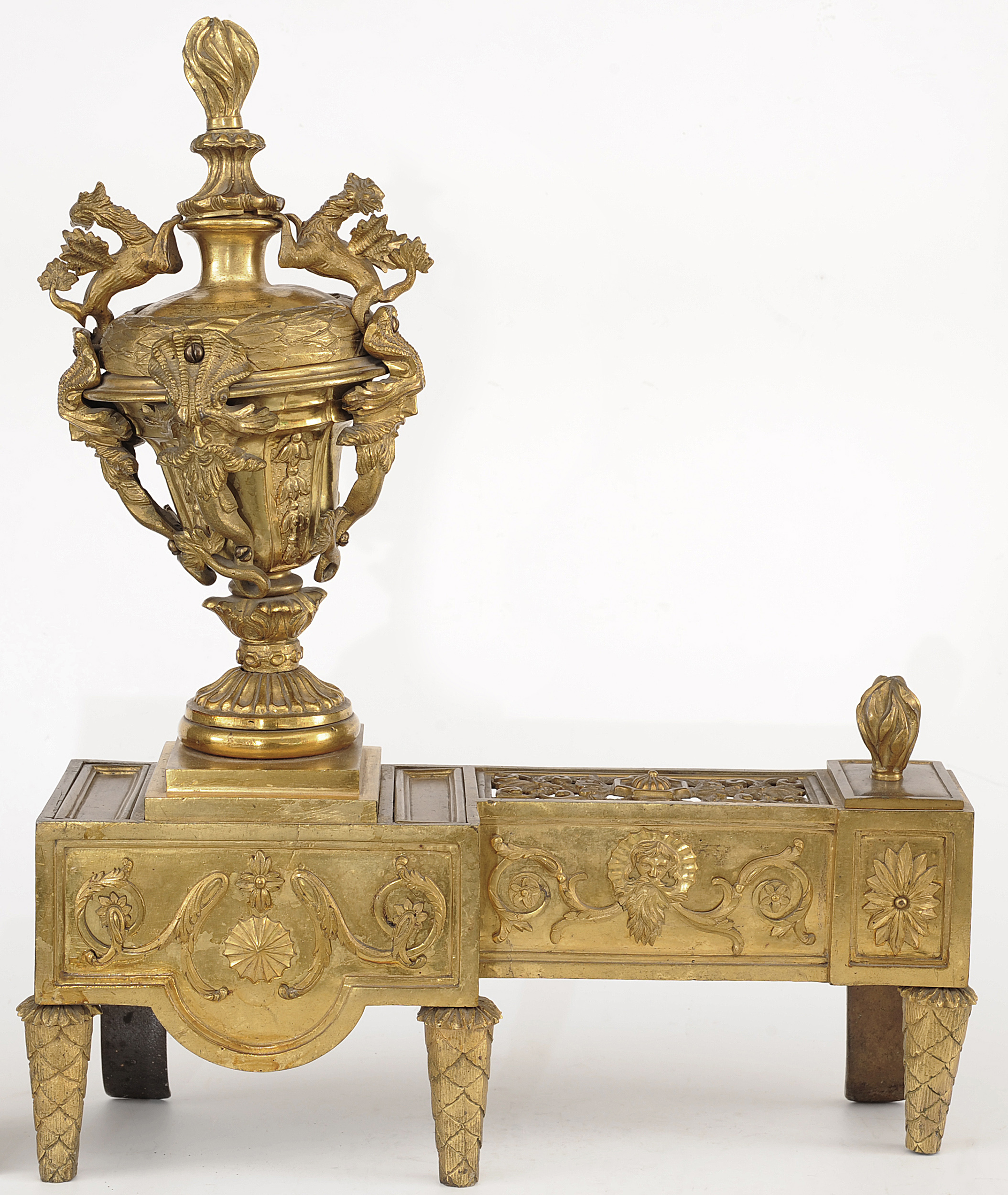 Dekoracyjny wilk kominkowy z brązu złoconego, o części tylnej w formie prostopadłościennej belki bez ścianki tylnej i dolnej. Ściana przednia ozdobiona płaskorzeźbioną dekoracją o motywach wici roślinnych rozdzielonych maską a górna ażurowa, w motywy roślinne. Całość z tyłu zakończona kostką, opartą na dwóch nogach z blachy i zwieńczoną u góry niewielką sterczyną w formie płomienia a z przodu i z boku ozdobioną owalnymi rozetami. Część przednia w formie spłaszczonej kostki od przodu wspartej na dwóch nóżkach pokrytych łuską, opatrzonej na przedniej ściance półkolistym fartuszkiem oraz dekoracją z motywem pary wici roślinnych i rozety. Ściana górna stanowi profilowany cokół dla wydatnej sterczyny w formie pełnoplastycznej wazy z pokrywą zwieńczoną płomieniem, ujętej w parę gryfów wyłaniających się z roślinnych pędów.