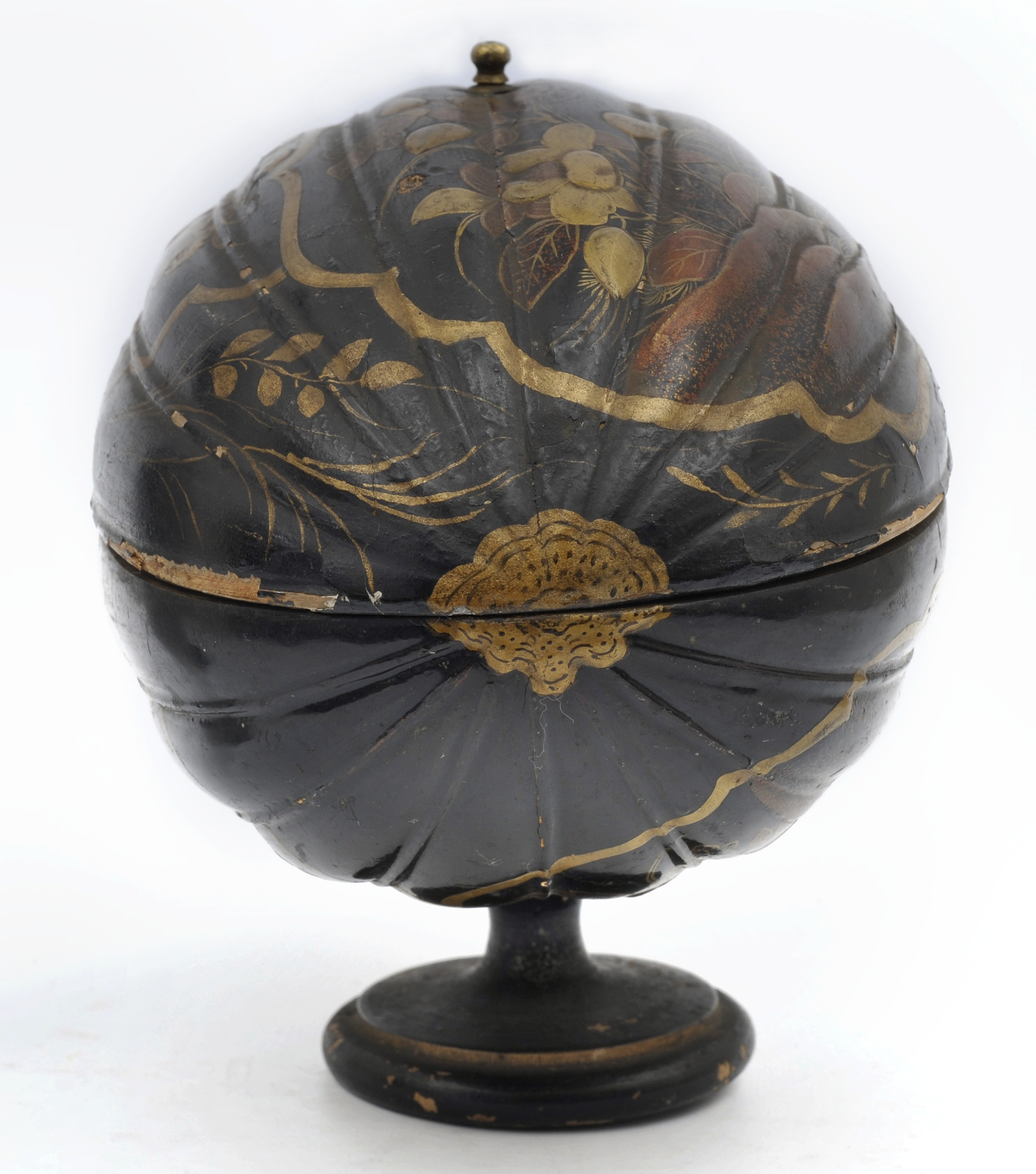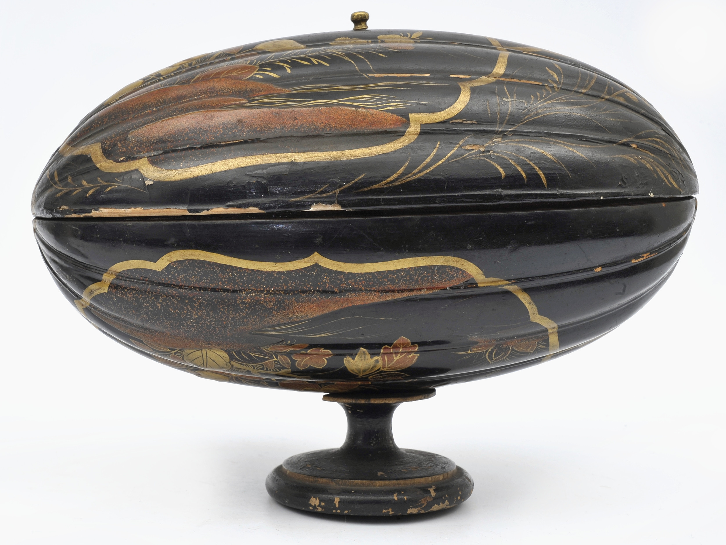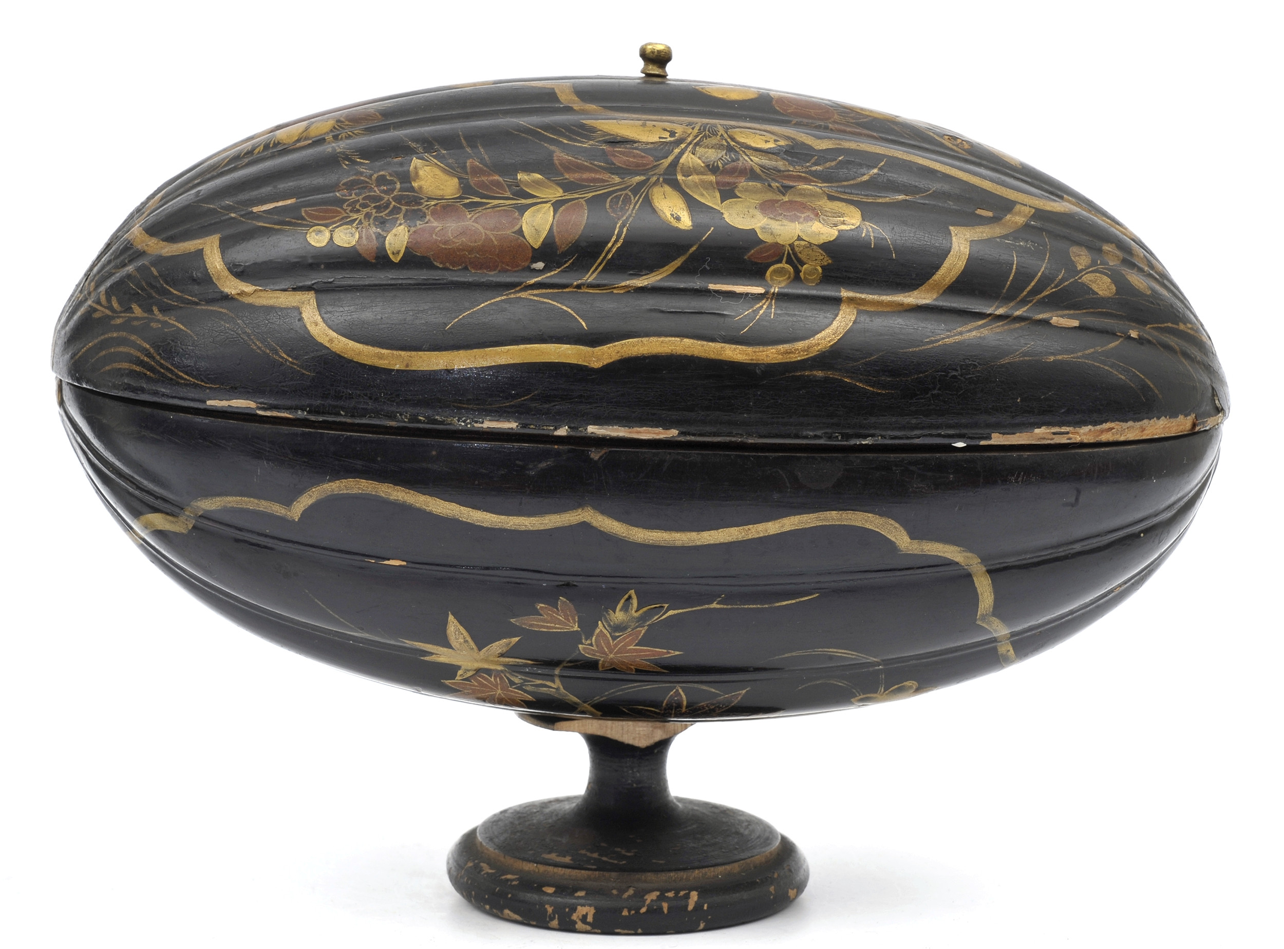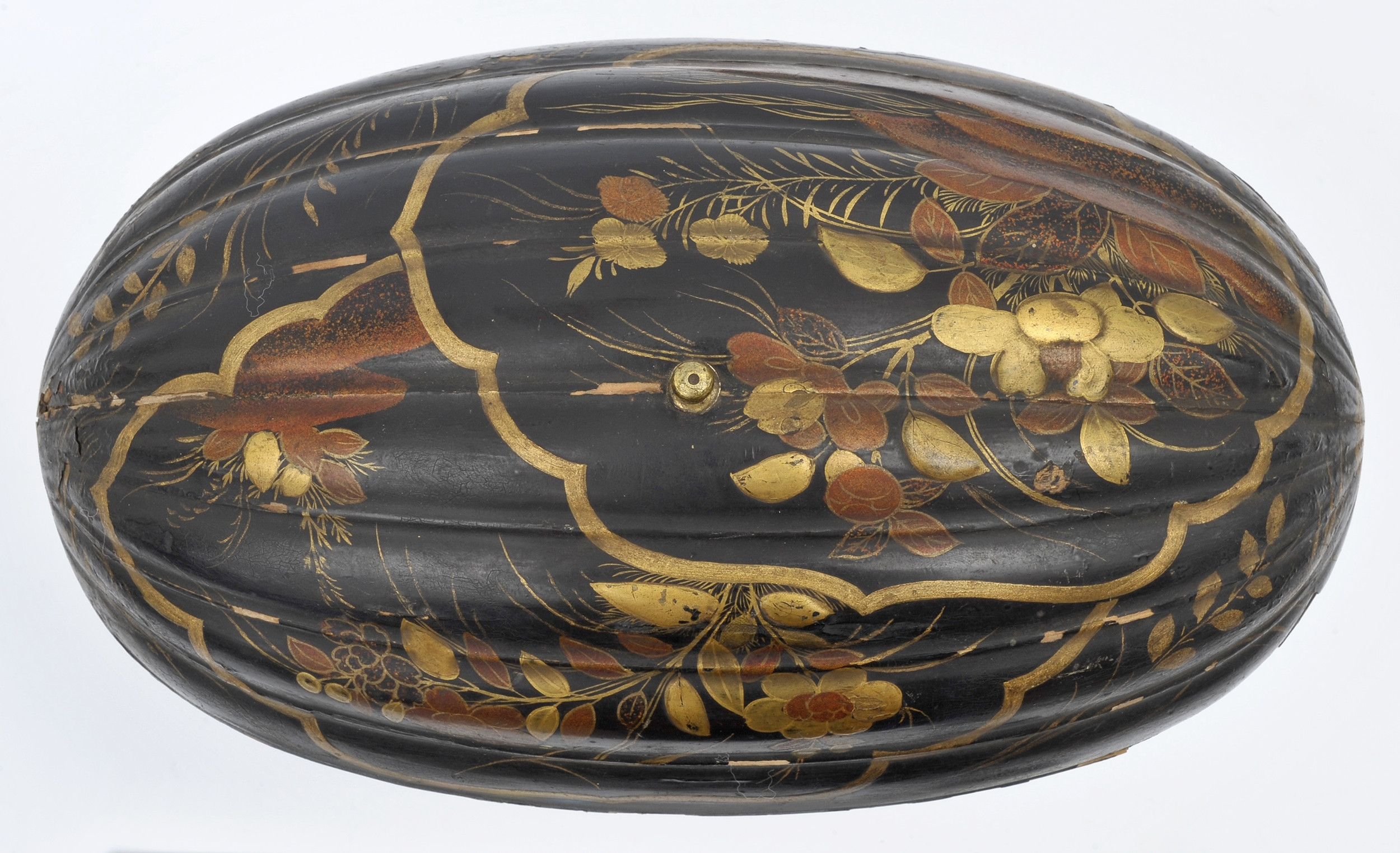 Drewniane pudełko z pokrywą w kształcie melona, dekorowane laką lub i złotem. Pudełeczko wspiera się na nóżce z szeroką stopką, z pewnością dodanej w późniejszym okresie. Kształt tego typu przedmiotów określa się melonem. Naczynie posiada pofalowaną powierzchnię wskutek regularnych żłobień wykonanych wzdłuż jego dłuższej krawędzi. Pudełeczko podzielono na dwie równe części, korpus i wieczko, które zdobią dodatkowo po dwie rezerwy, czyli pola wyodrębnione krawędzią, wypełnione dekoracją. W tym przypadku są to kompozycje floralne o motywach kwiatowych, utrzymanych w złotoczerwonej kolorystyce.