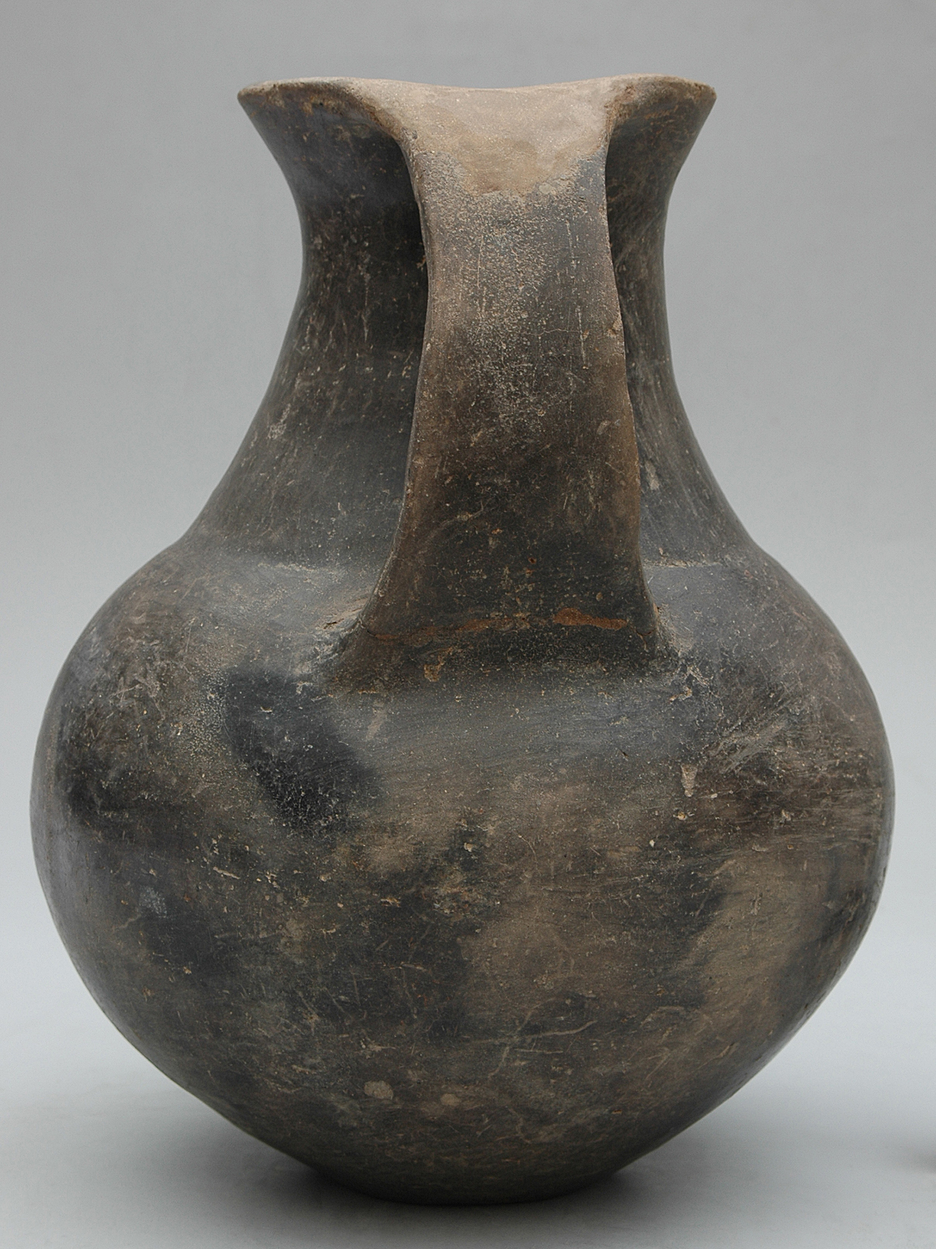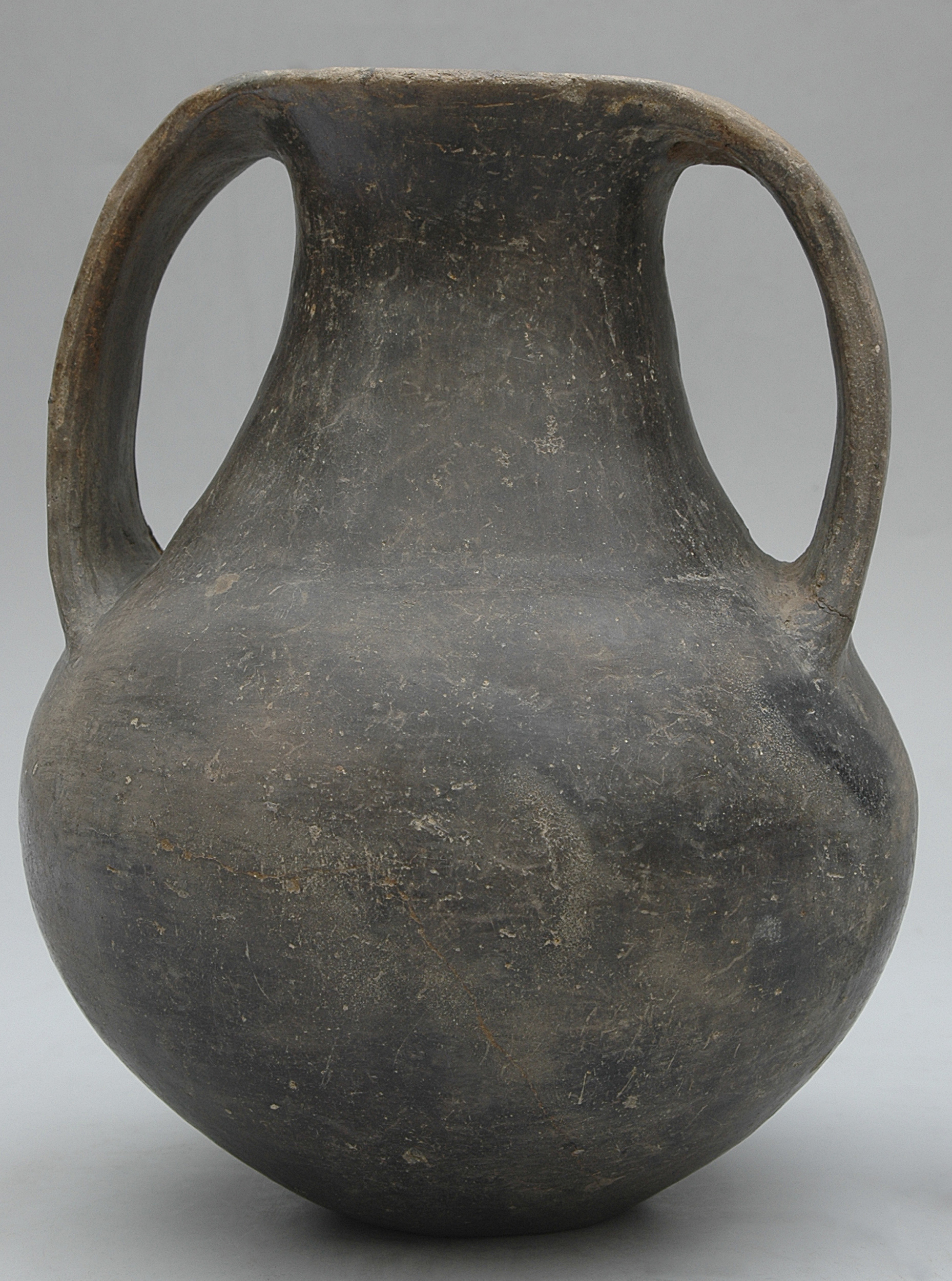 Brzuchata amfora z dwoma uchwytami, o zaokrąglonych ramionach i zwężającej się stożkowo ku górze szyjce zakończonej rozchylonym lejkowato wylewem. Kolor powierzchni naczynia nie jest jednolity - zmienia się od pomarańczowego do błyszcząco czarnego.