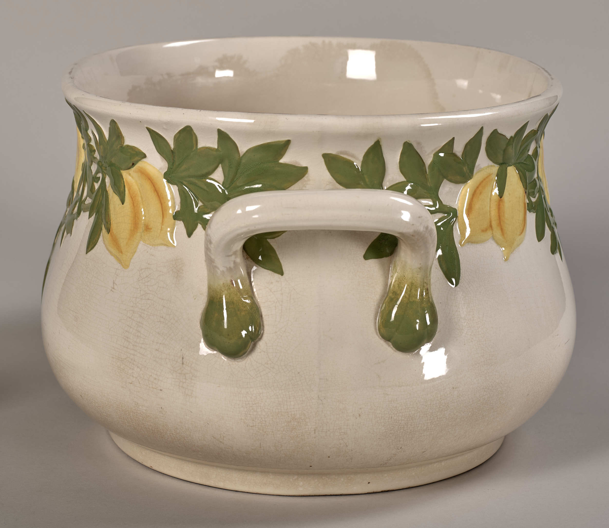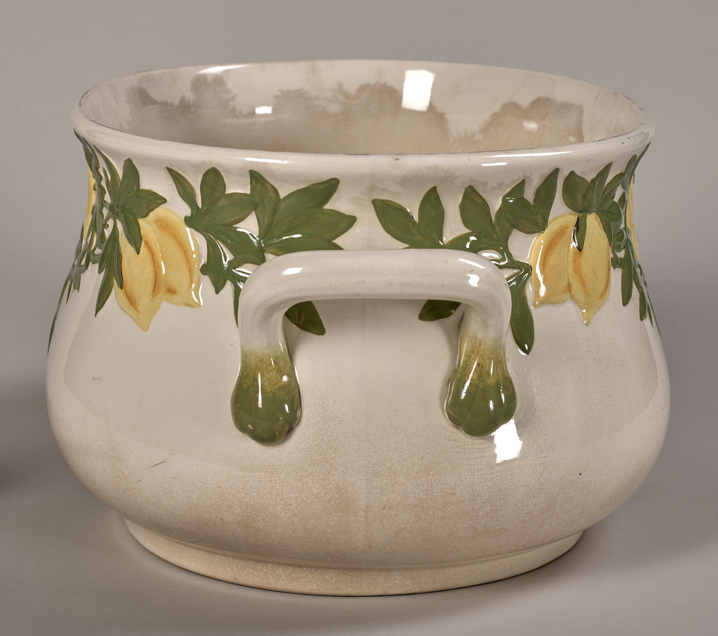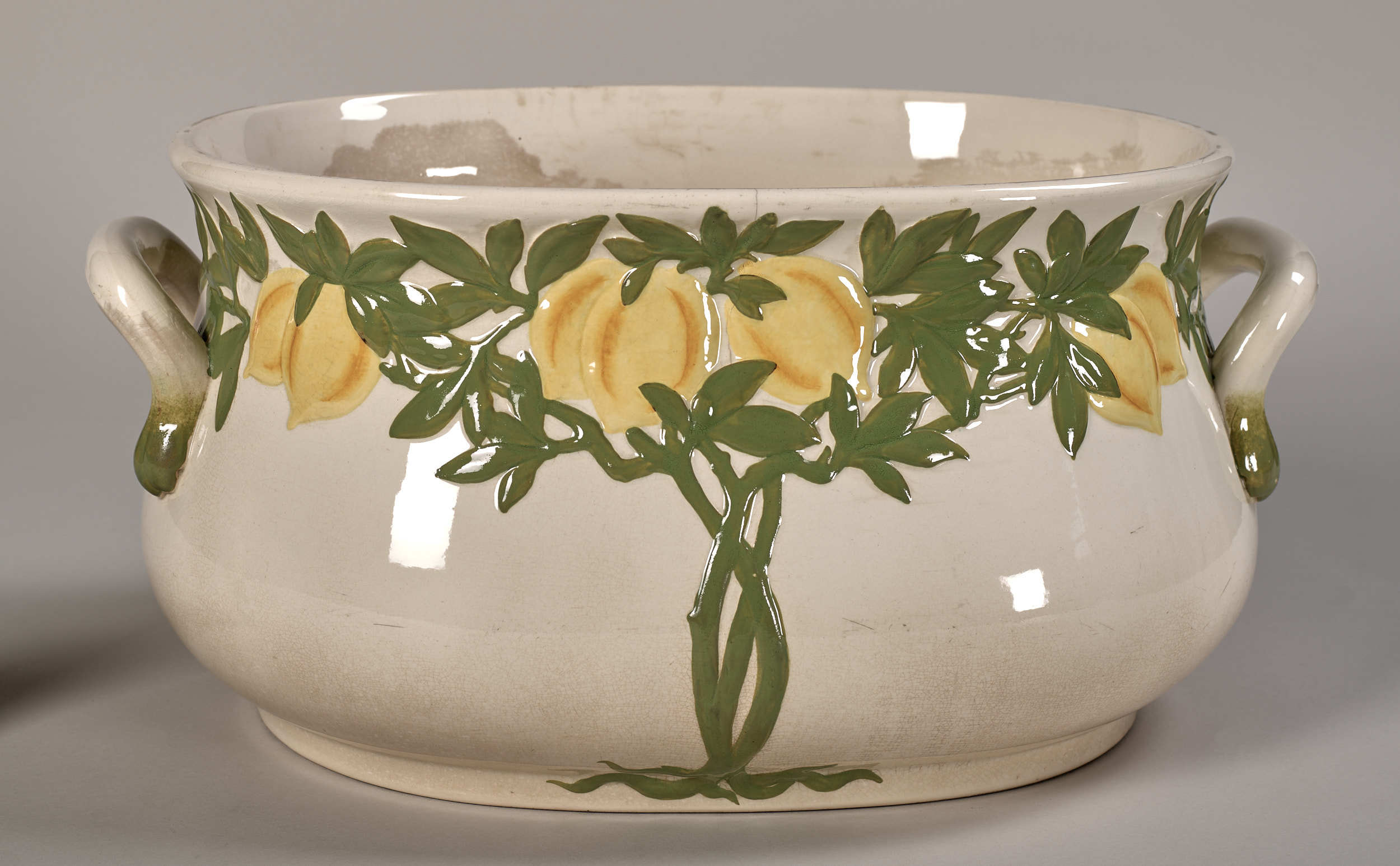 Wanienka toaletowa, owalna, z dwoma uchwytami. Zdobiona plastycznym roślinnym ornamentem owocującego cytrynowego drzewa. Kolorystycznie upiększony żółto, pomarańczowy oraz zielony na białym tle. Na dnie drukowany czarny napis: Sarreguemines, takaż litera „R”. Napis niebieskim lakierem: S.9569 MŁ.