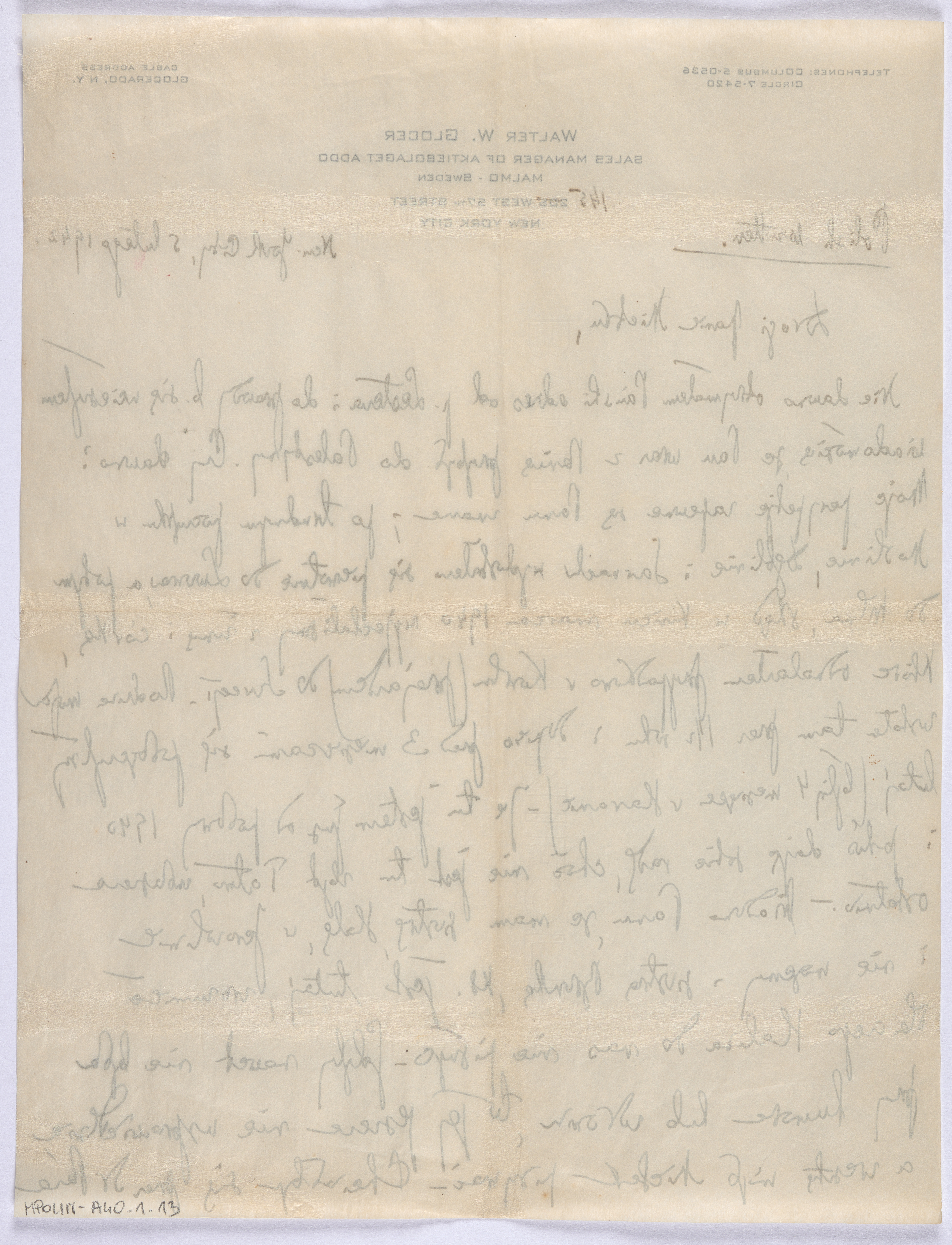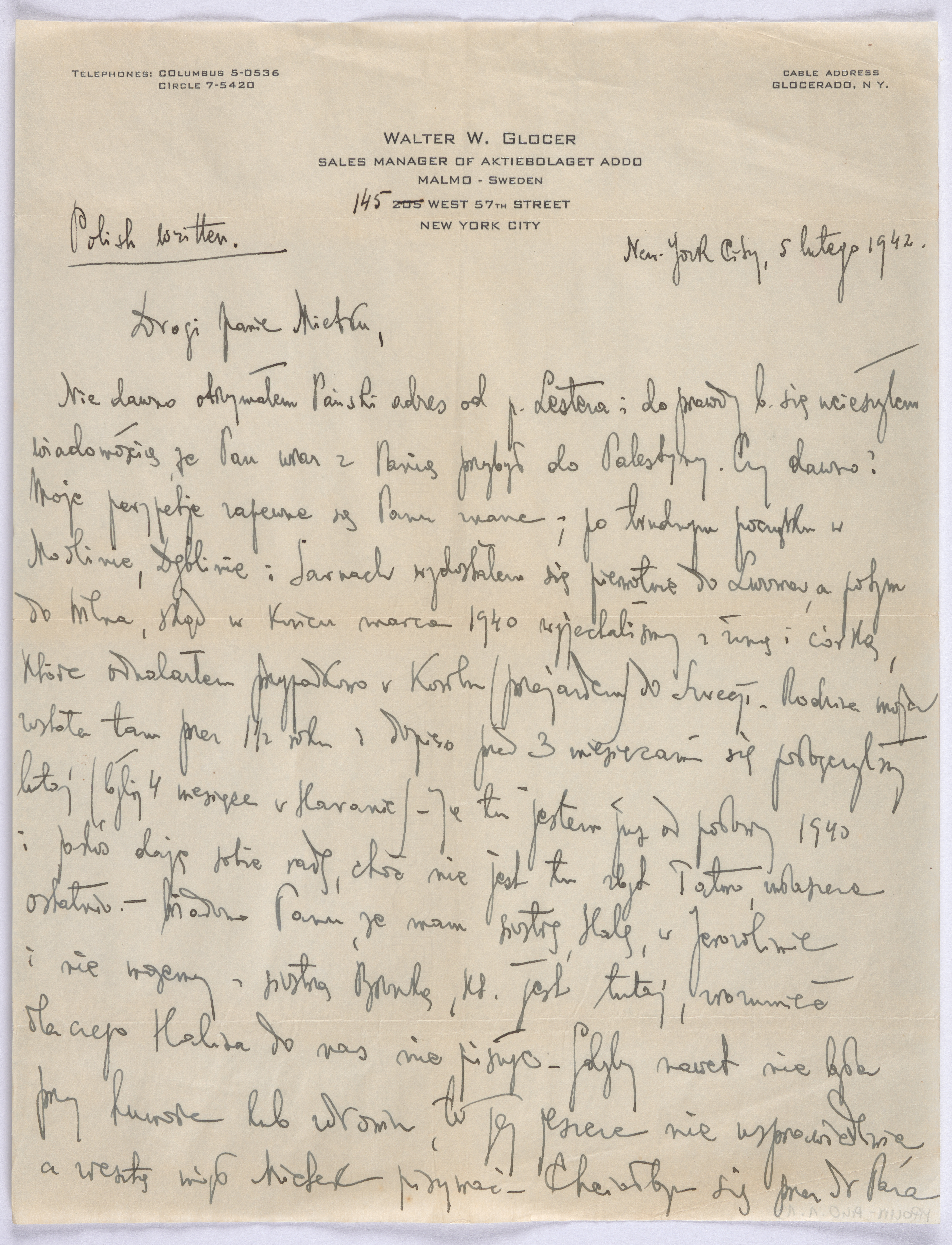 List Władysława Glocera do szwagra na 1 karcie. Z treści listu (pisownia oryginalna): „Niedawno otrzymałem Pański adres od p. Lestera i doprawdy b. się ucieszyłem wiadomością że Pan wraz z Panią przybył do Palestyny. Czy dawno? Moje perypetie zapewne są Panu znane; po trudnym początku w Modlinie, Dęblinie i Sarnach wydostałem się pierwotnie do Lwowa, a po tym do Wilna, skąd w końcu marca 1940 wyjechaliśmy z żoną i córką, które odnalazłem przypadkowo w Kowlu (przejazdem) do Szwecji. Rodzina moja została tam przez 11/2 roku i dopiero przed 3 miesiącami się połączyliśmy tutaj”. | Rodzina już przed wojną była silnie zasymilowana, jedynie Teofil mówił jeszcze w jidysz. Stefan nie był już nawet obrzezany. Wszystkie dzieci były starannie wykształcone. Halina skończyła studia prawnicze, Ewa była lekarką. | W USA część z członków rodziny musiała przyjąć nowe imiona, ponieważ oryginalne były niemożliwe do wymówienia dla Amerykanów. Władysław używał imienia Walter, a Mieczysław zmienił imię na Wiktor. Na użytej w tym liście papeterii widnieje już zanglicyzowane imię – Walter.