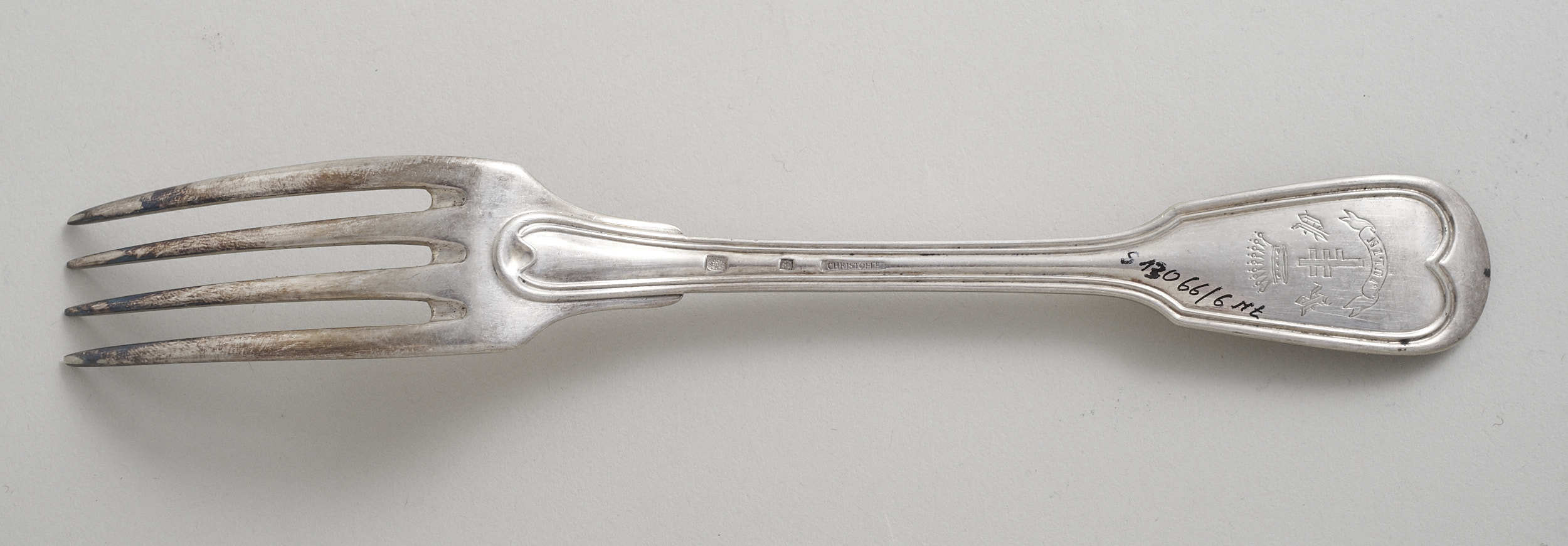 Czterozębny widelec stołowy posiada płaski trzonek z rozszerzonym zakończeniem ozdobiony podwójnym profilowaniem. Na rewersie w dolnej części trzonka widoczna jest korona hrabiowska a pod nią herb Potockich - Pilawa. Po bokach symetrycznie rozmieszczone litery R i P a pod herbem widoczna szarfa z napisem „Julin”. Ponadto na przewężeniu trzonka, od spodu wybito punce i stempel producenta „Christofle”.