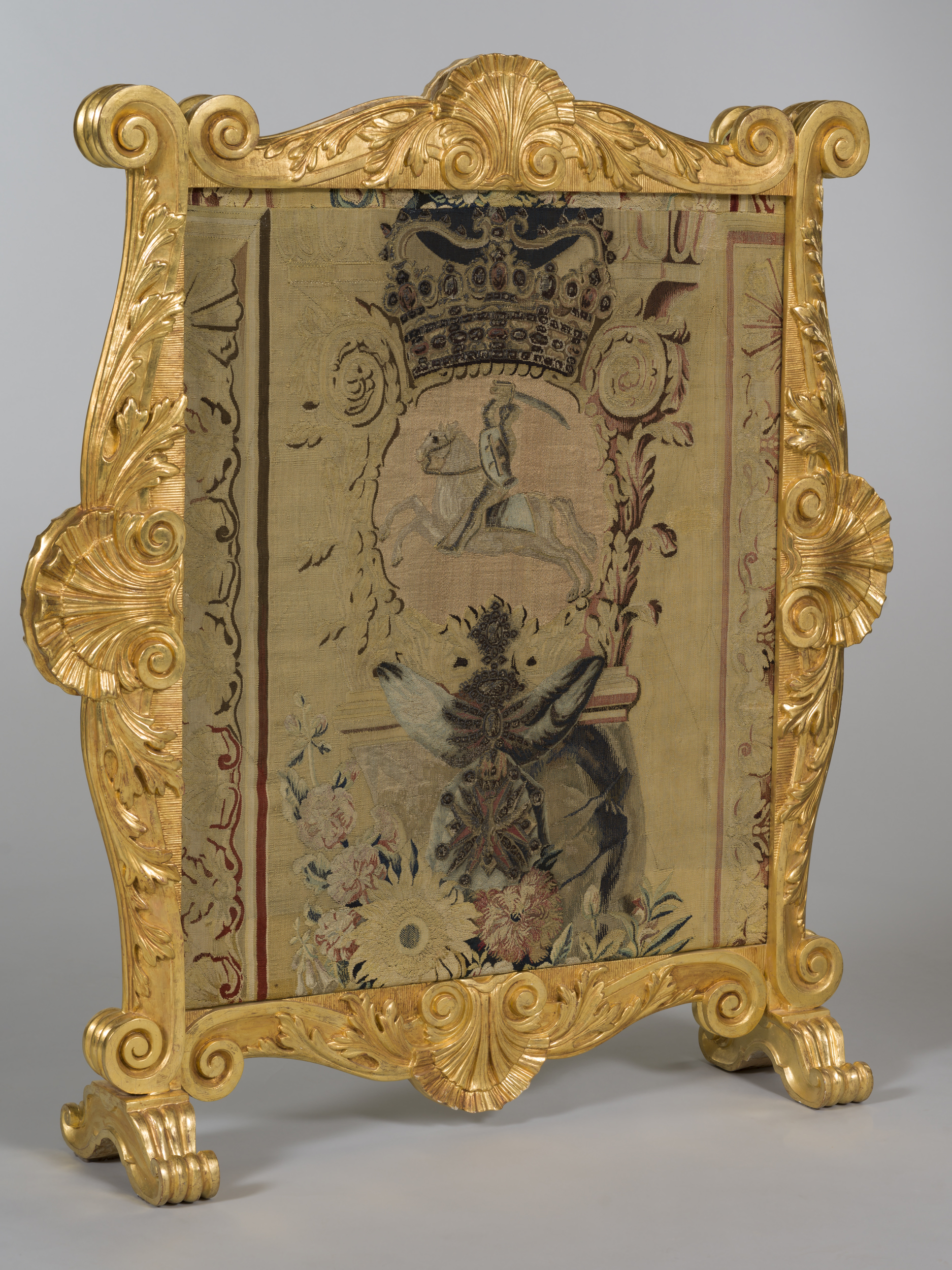 Ekran kominkowy pełnił dwie funkcje w apartamentach królewskich pałacu wilanowskiego: przy płonącym kominku osłony przed nadmiernym blaskiem ognia i podmuchami dymu oraz latem zasłony ciemnego otworu kominkowego, z wygaszonym paleniskiem. Konstrukcja ekranu kominkowego jest prosta; prostokątna rama ustawiona pionowo na dwóch niskich, podwójnych nogach. W świetle ramy, na jej wewnętrznych krawędziach zamontowane są prowadnice, w które wkładany jest blejtram z naciągniętą tkaniną.