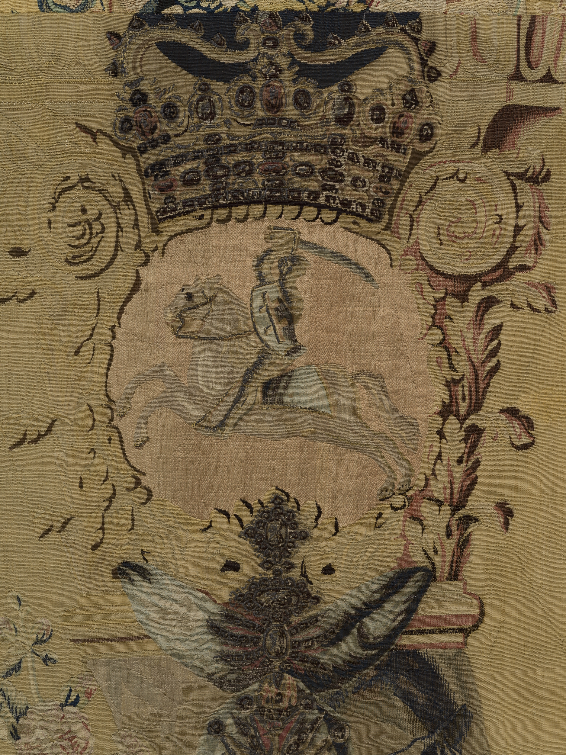 rzeźbionych liści akantu przechodzących w woluty ,muszle na osiach boków ramy, złocenie.. Ekran jest rzeźbiony dwustronnie, lecz złocony jednostronnie. Pierwotnie ramę wypełniał zielony aksamit ze złotymi galonami, dopiero w XIX w. zastąpiono go fragmentami tkaniny gobelinowej pochodzącymi z bordiury dużego saskiego gobelinu, na których widnieje kompozycja na tle elementu architektonicznego – ukwieconego pilastra z kapitelem zdobionym herbem Pogoni pod polską królewską koroną i orderem złotego Runa. Dopełnieniem ikonograficznym tej kompozycji stanowi bliźniaczy ekran, z drugim fragmentem tegoż gobelinu przedstawiającym polskiego orła pod królewską koroną z Orderem Orła Białego.